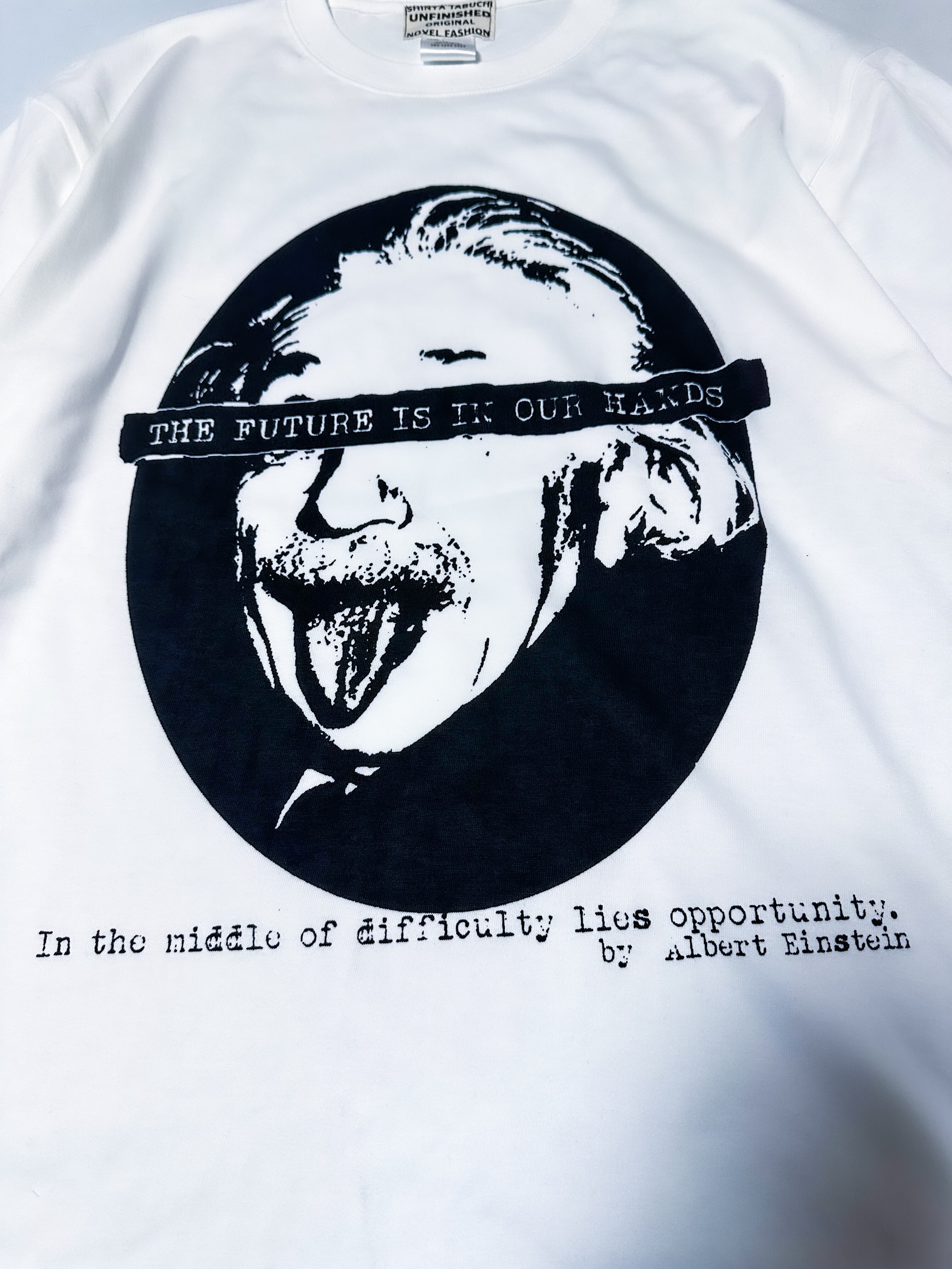 胸のアインシュタインの目の部分には、『THE FUTURE IS IN OUR HANDS』(未来は僕らの手の中)の文字を採用しています。