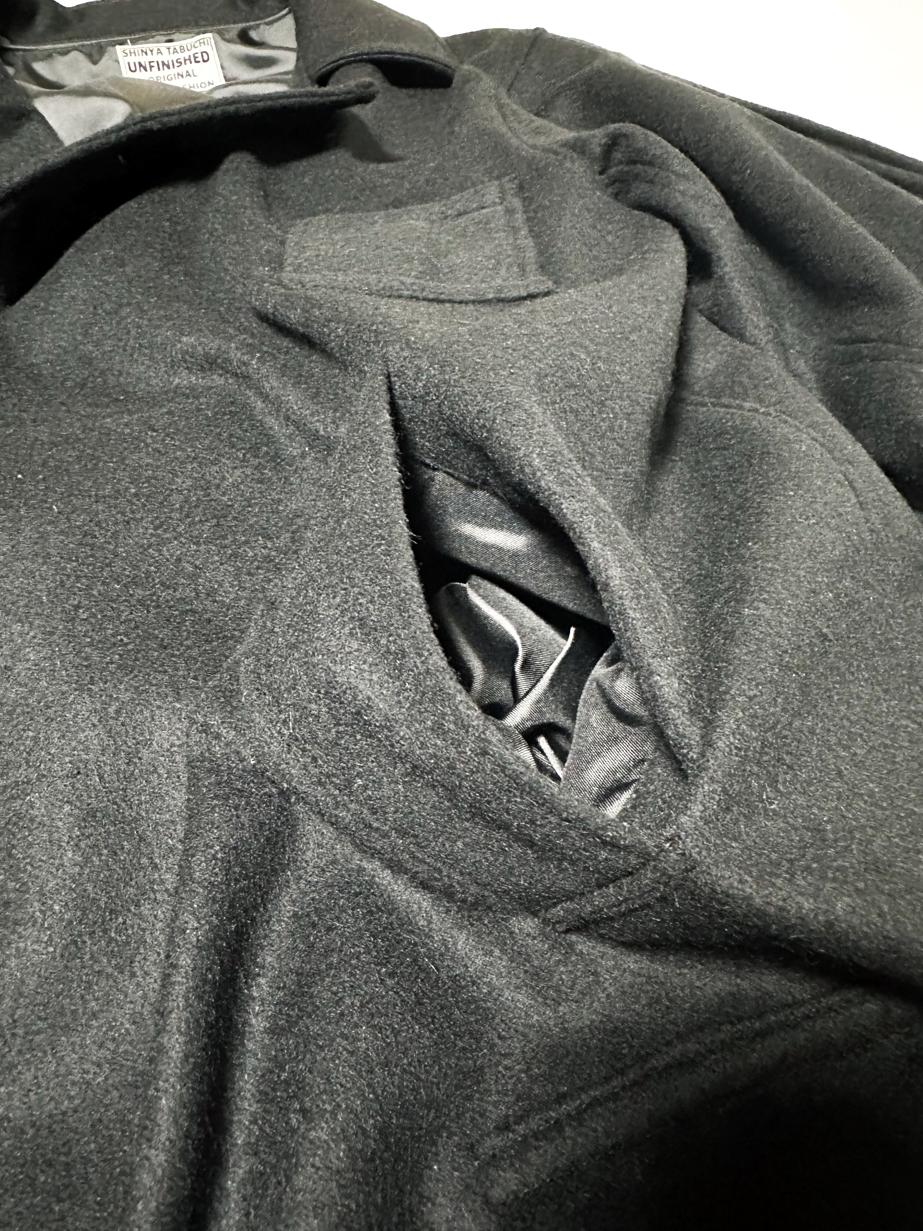 トレンチコートは通常両胸にボタンが配置されていますがスタイリッシュさを追求するため片面のみにボタンを配置しました。