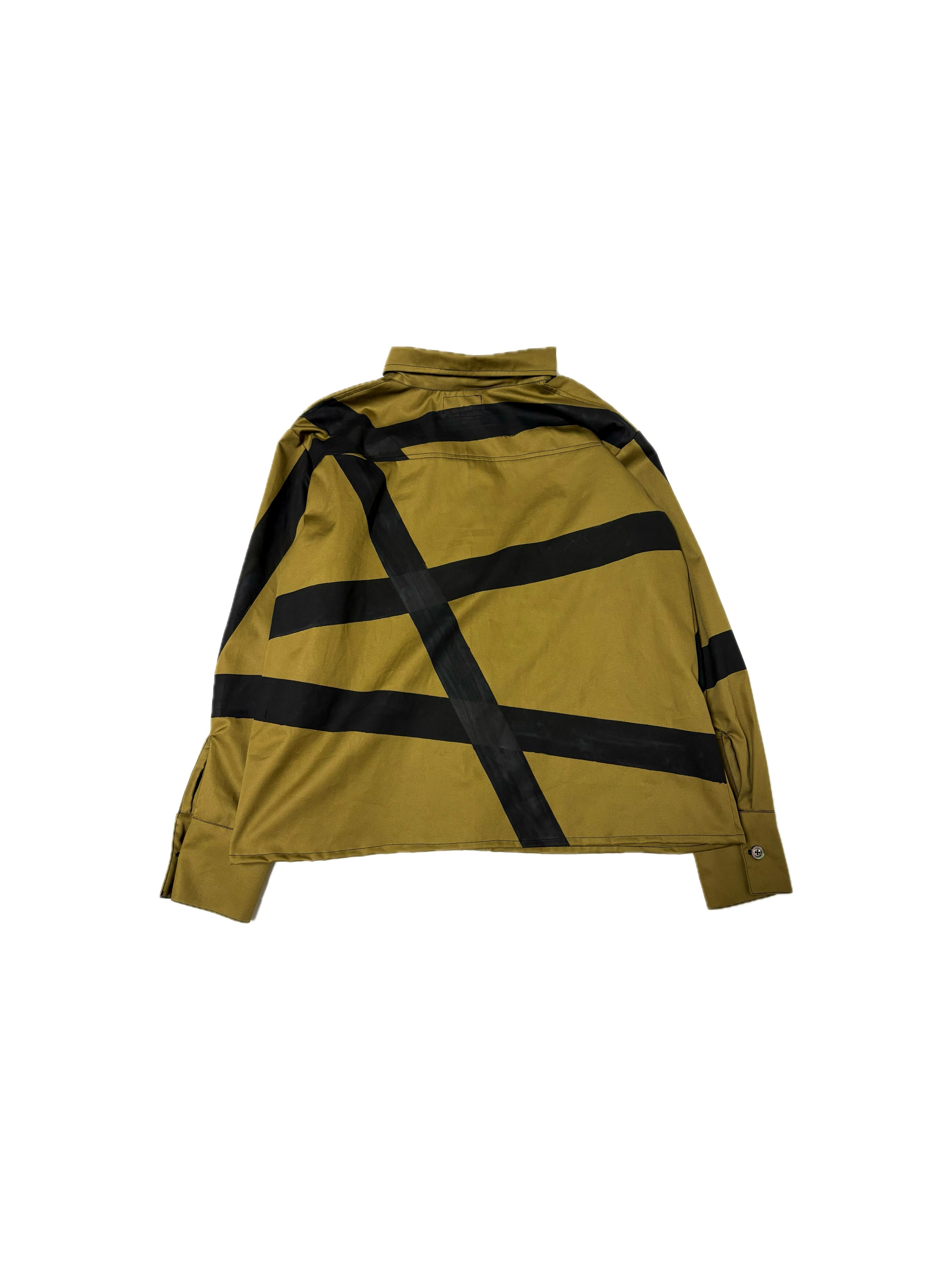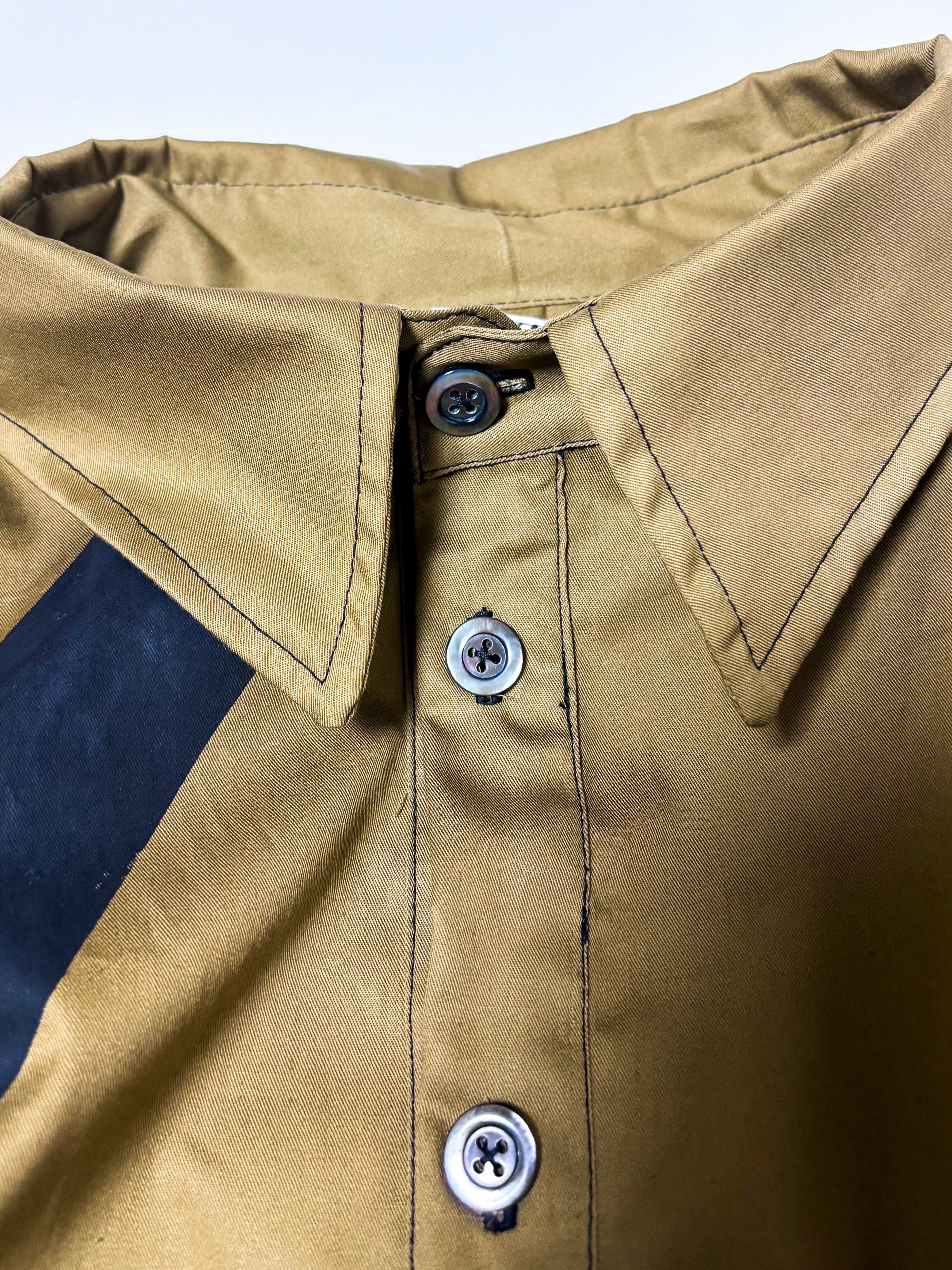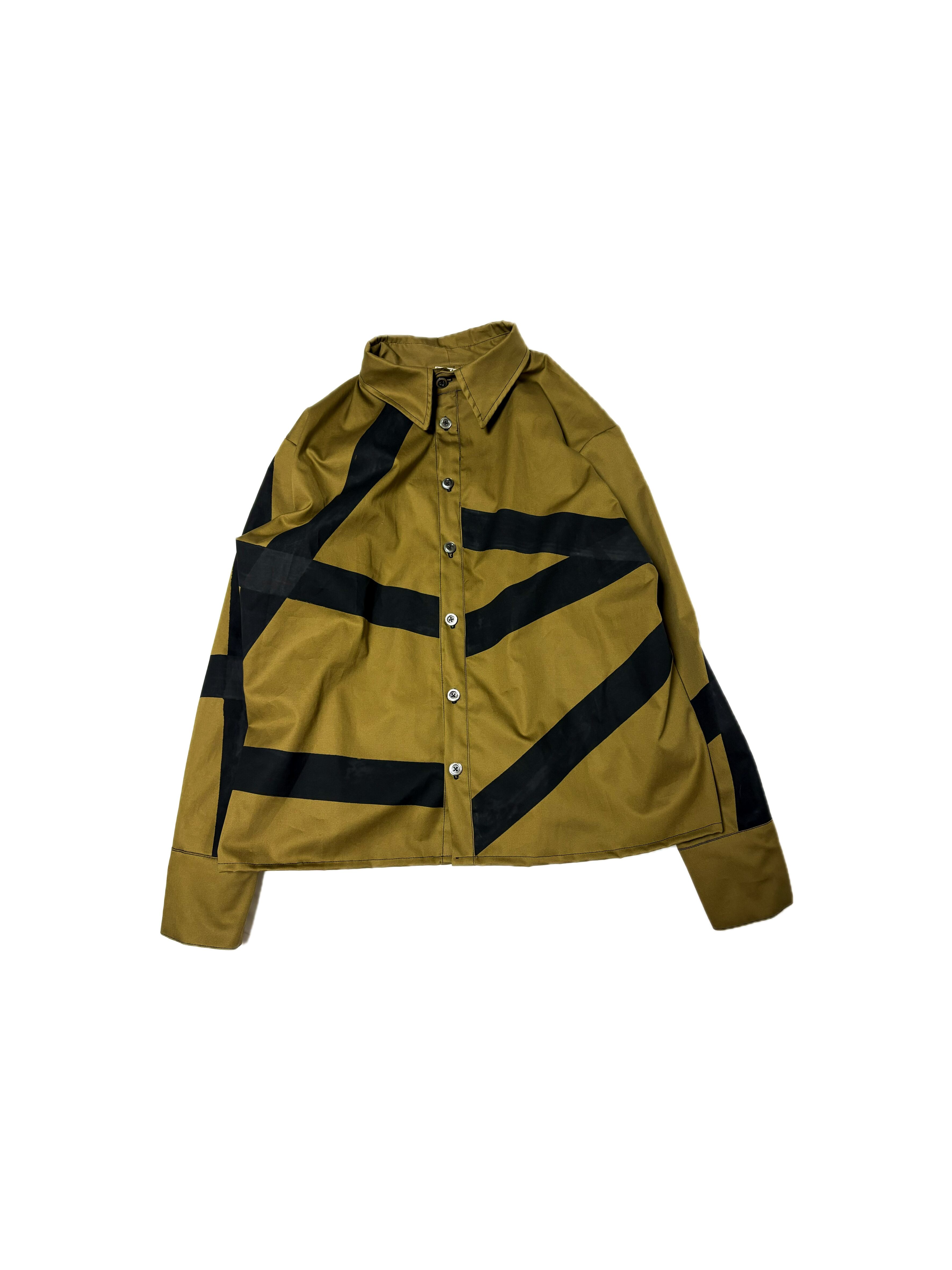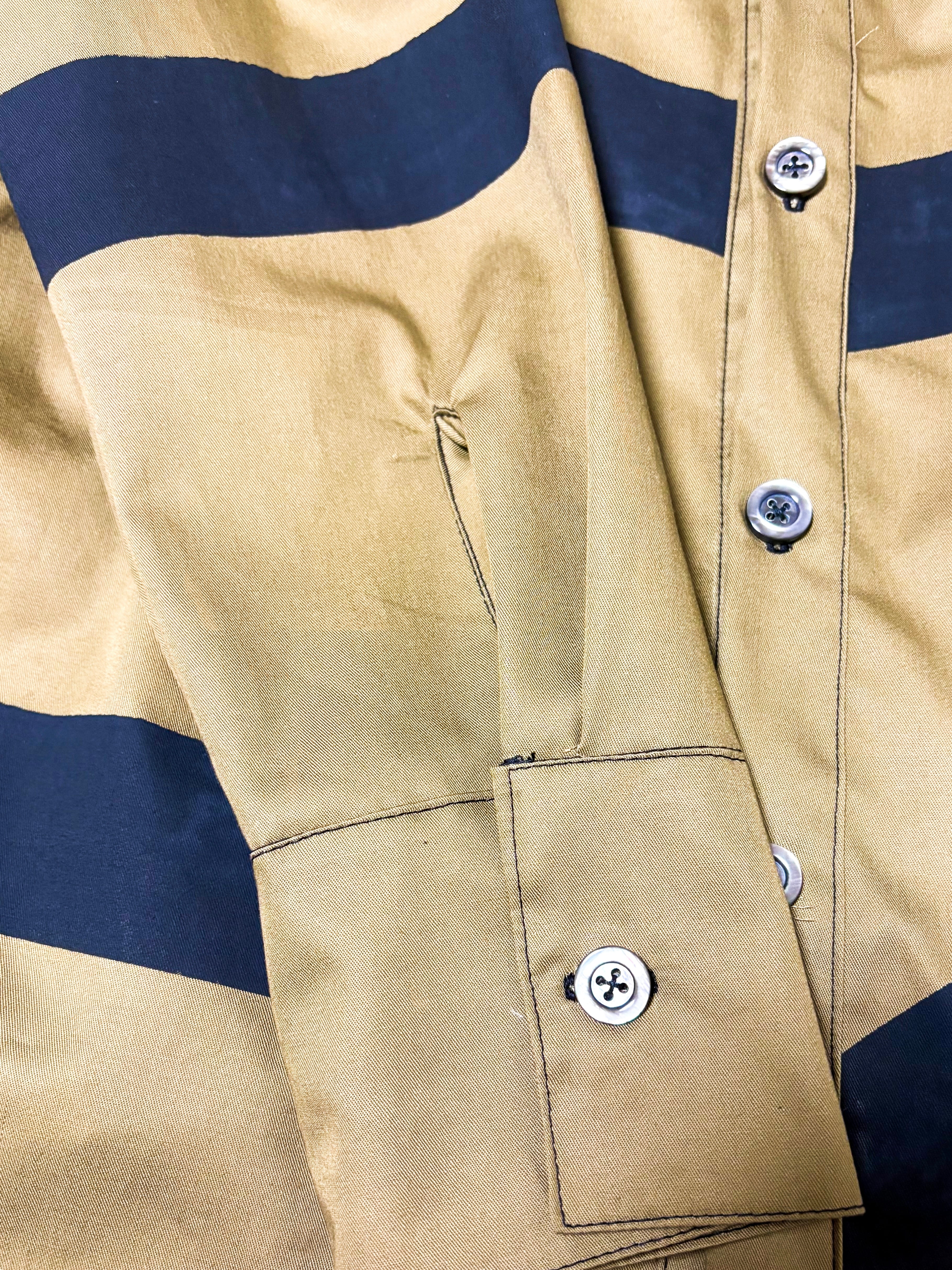 茶色生地に太めの黒ストライプをランダムな方向へ塗布したインパクトのあるシャツです。