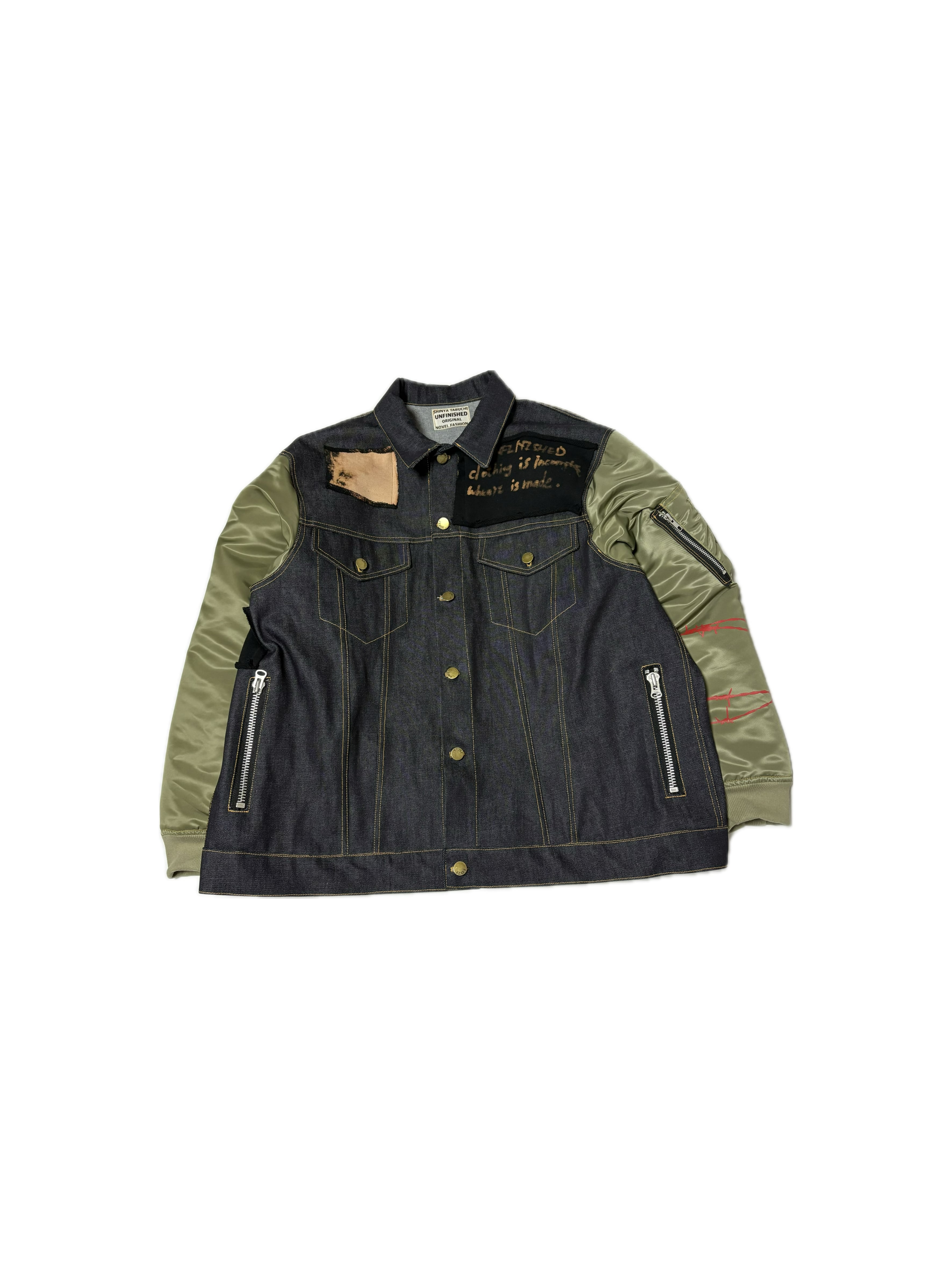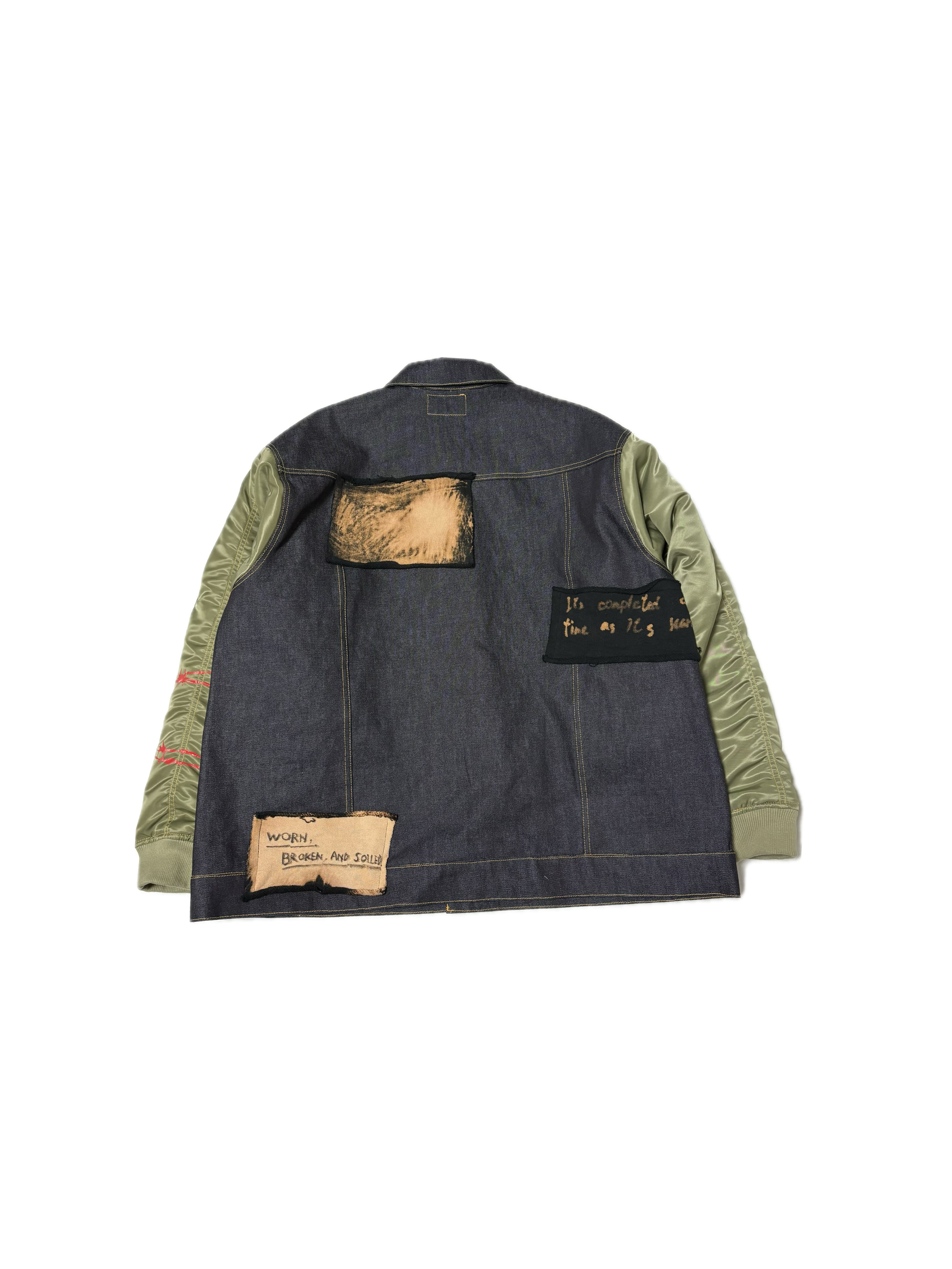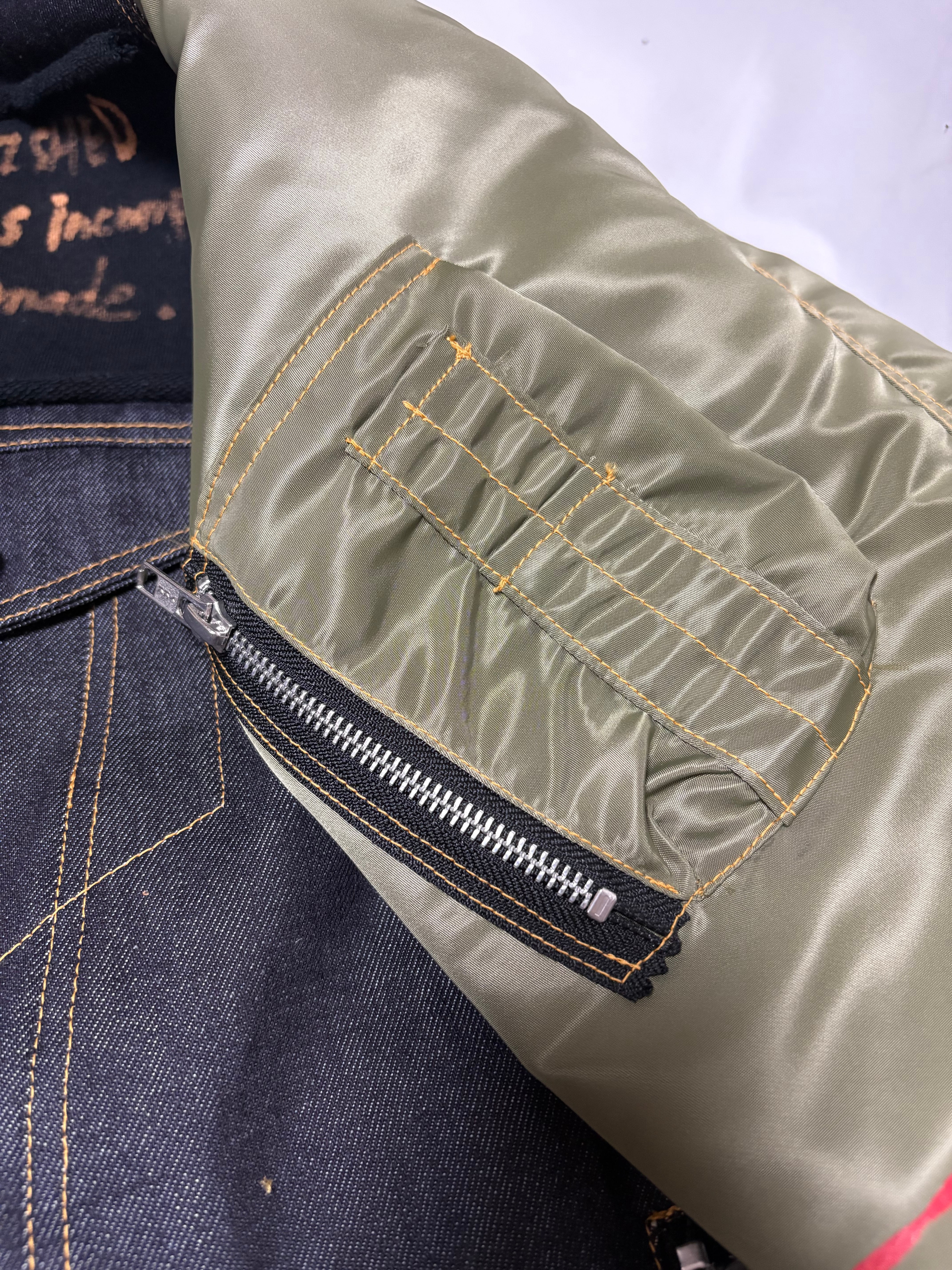 厚みのある岡山デニムと中綿入りMA-1をベースにドッキングジージャンを製作いたしました。