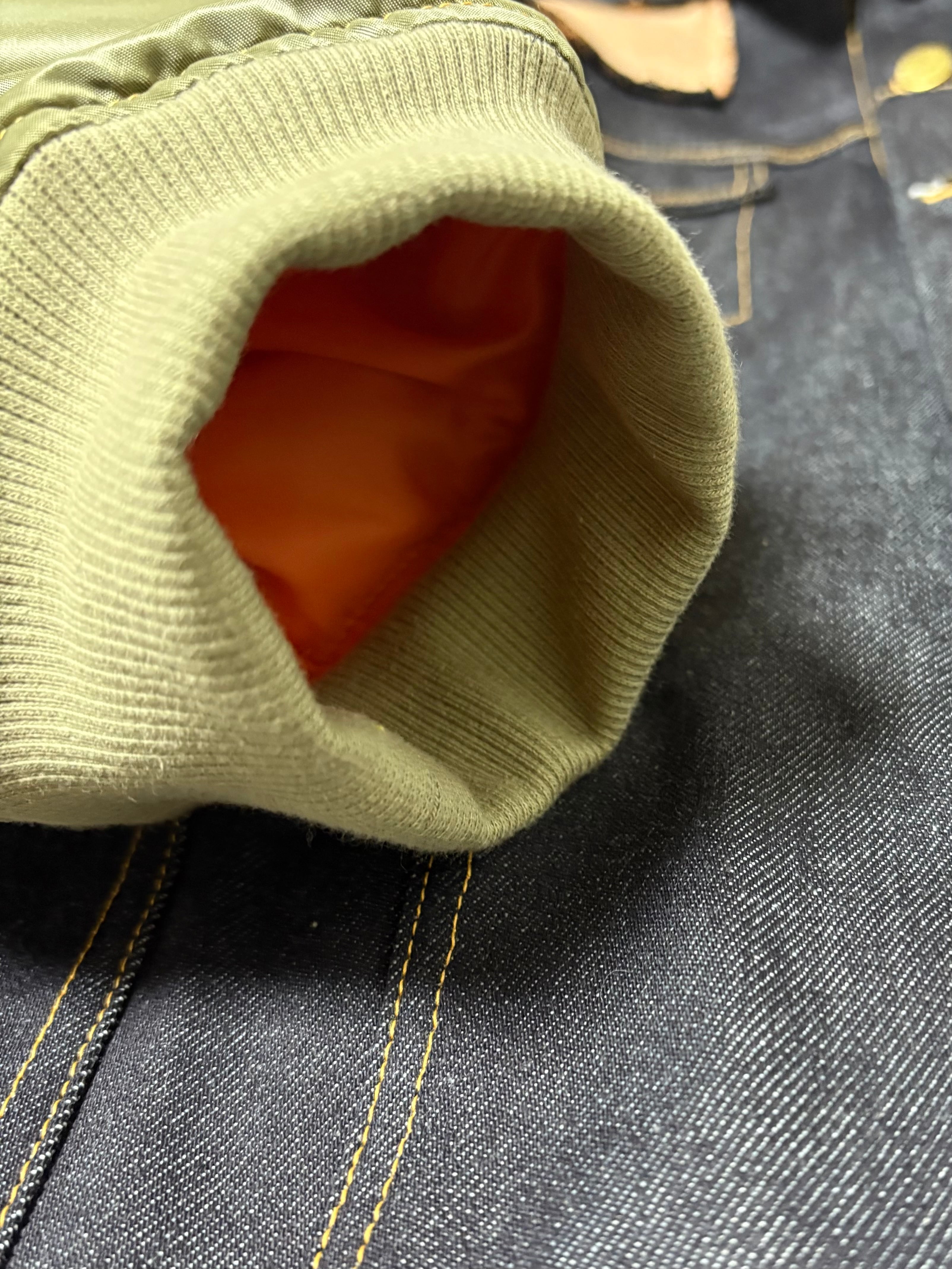 袖部分には中綿入りMA-1を採用しており、裏地はオレンジを採用しました。