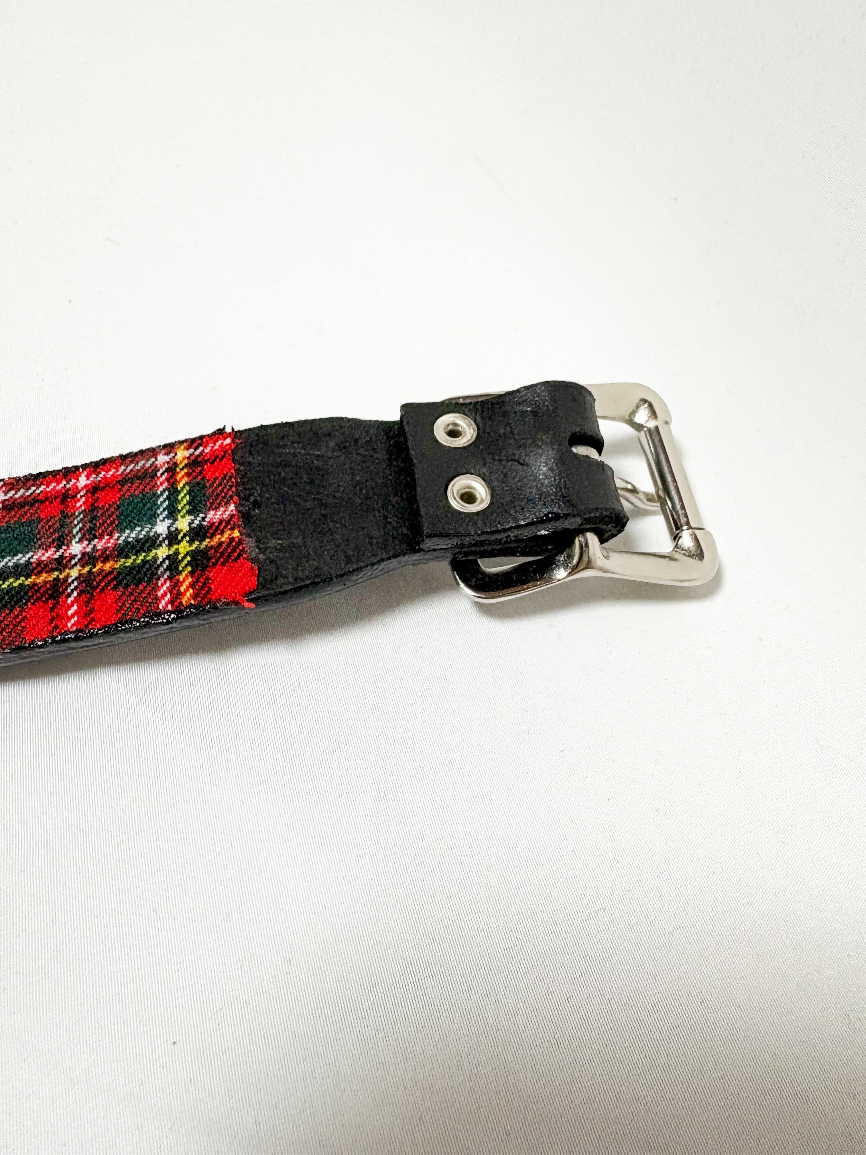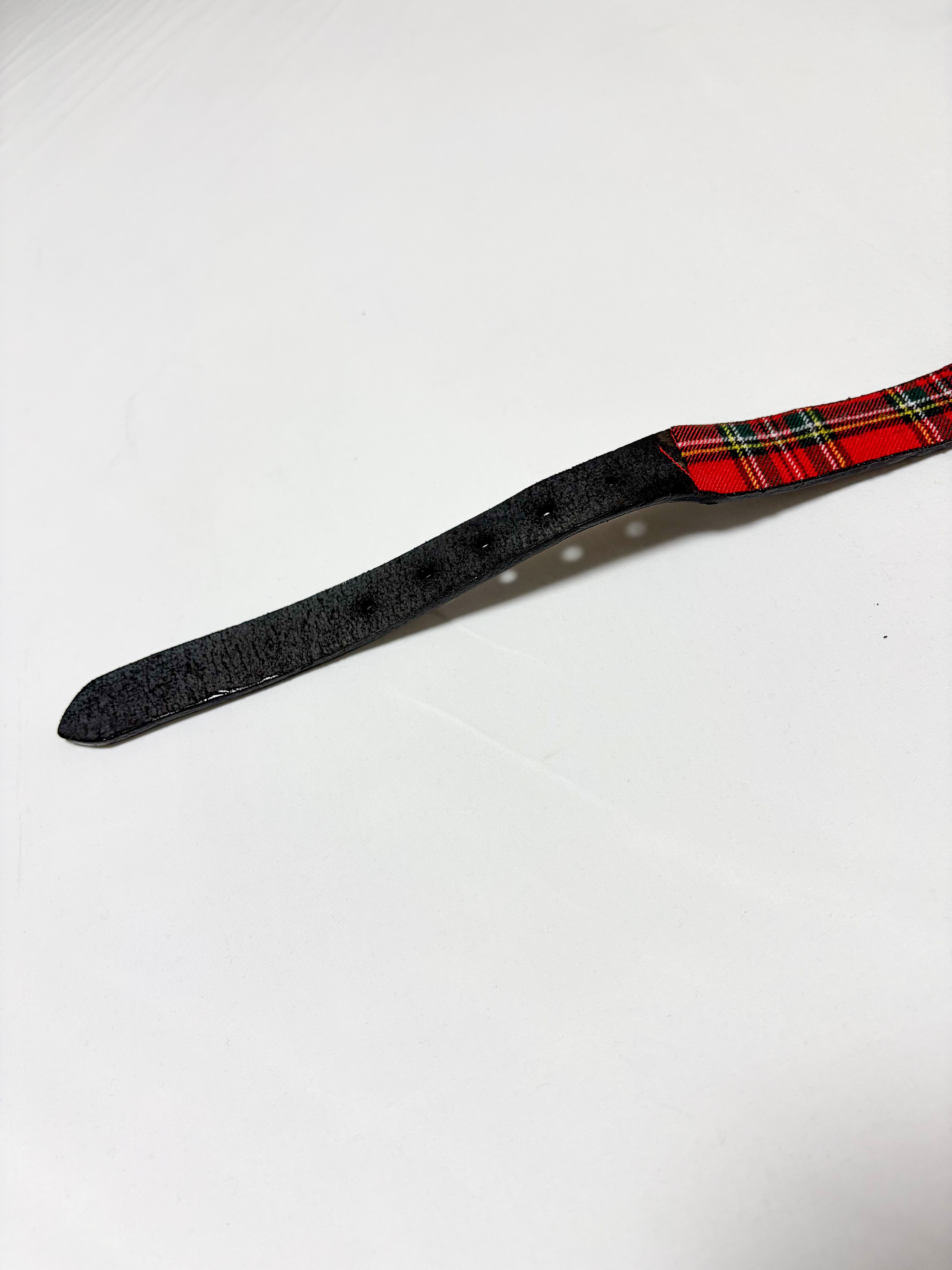 UNFINISHEDレザーチョーカー25087 本革を使用したレザーチョーカーです。 裏面はタータンチェックを採用しました。 【サイズ】 縦3㎝ 横58㎝ バックルからベルト穴まで39㎝〜48㎝ 5つ穴で調整可能 【送料】 購入金額に関わらず送料無料。