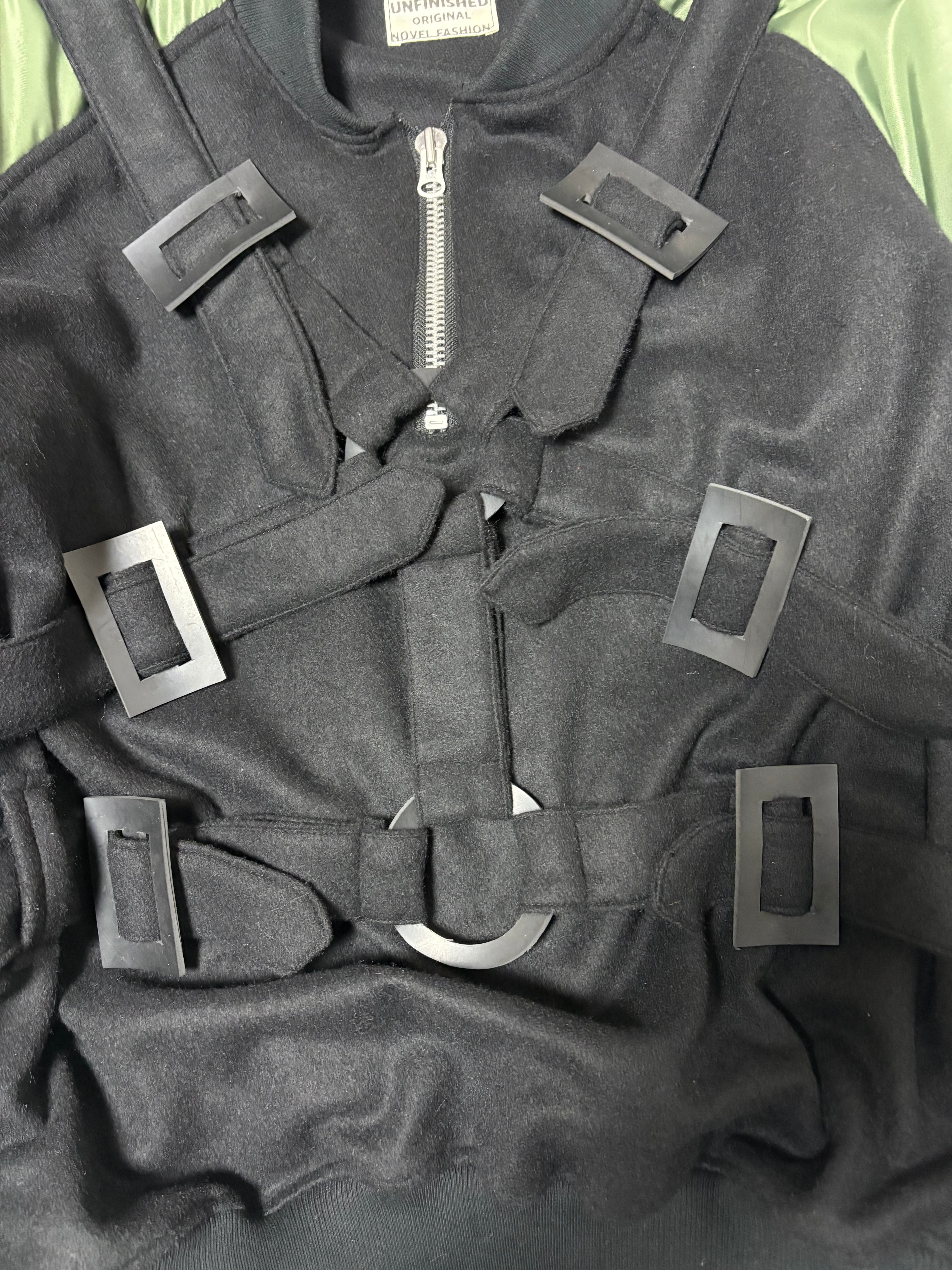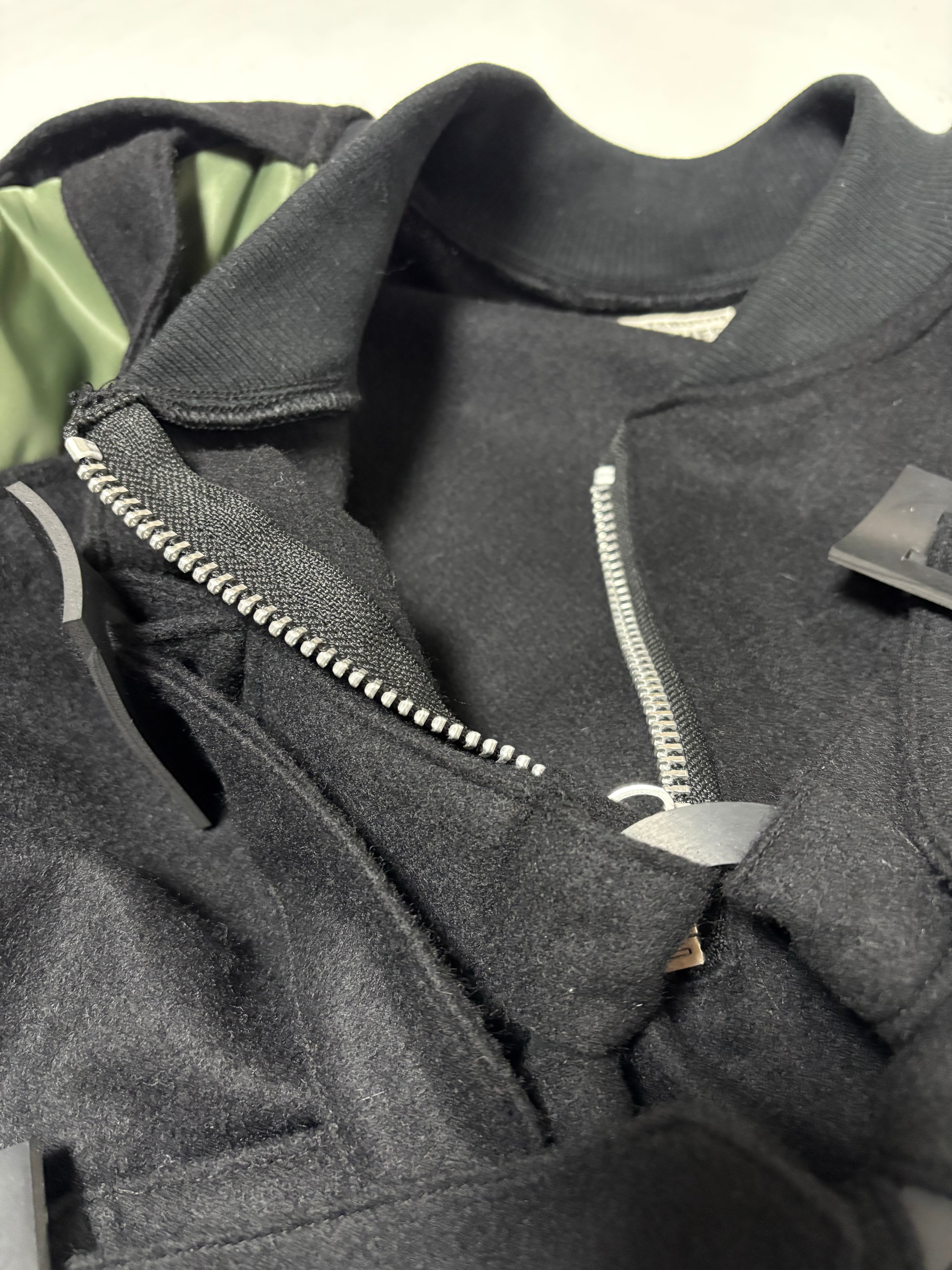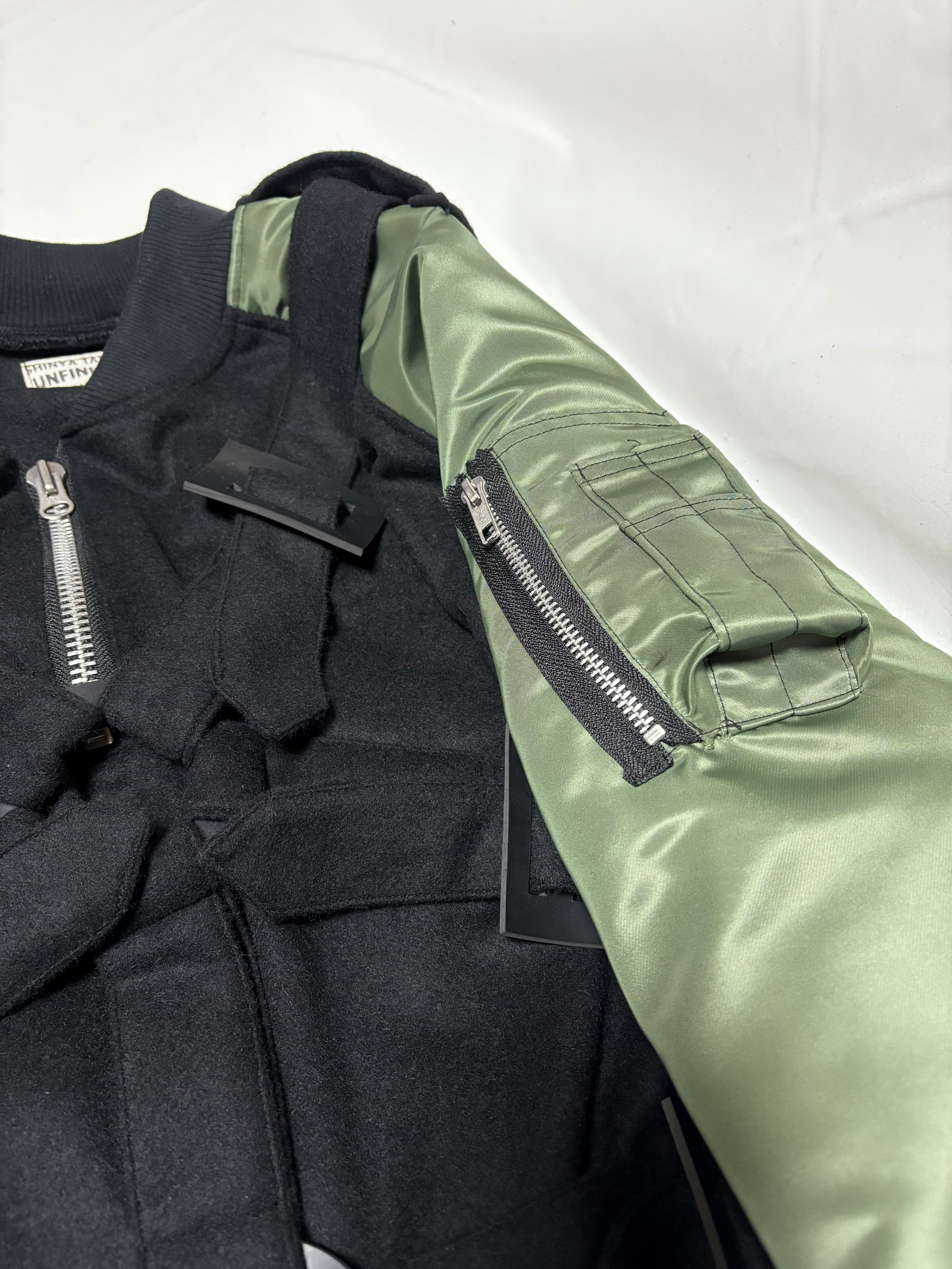 ウール生地とMA-1をドッキングし、デザイナーヴィヴィアン ウエストウッド、マルコムマクラーレンの経営していたSeditionariesにてセックスピストルズの衣装として製作していたパラシュートシャツからインスピレーションを受け要素をインプットしたトップス。