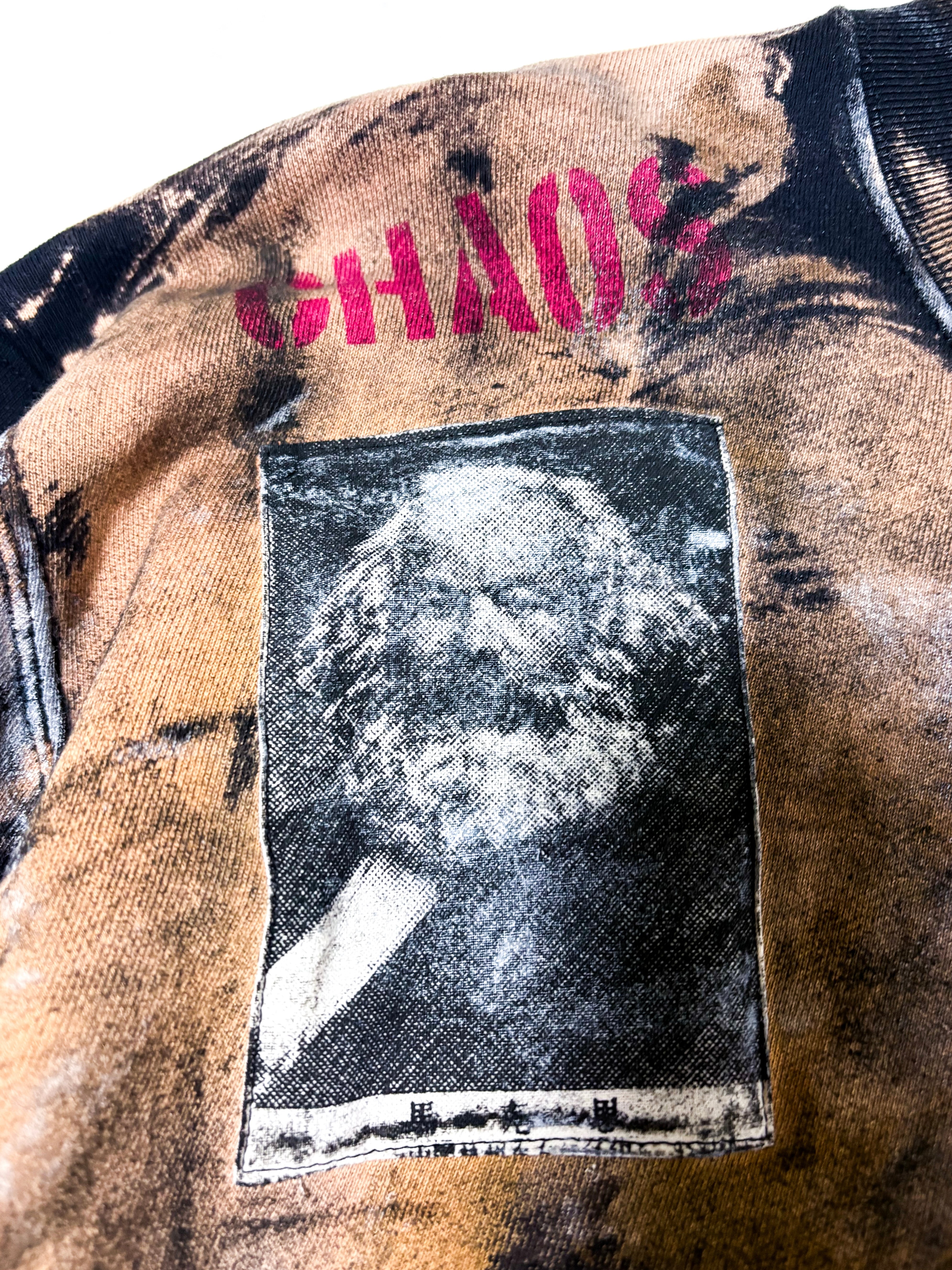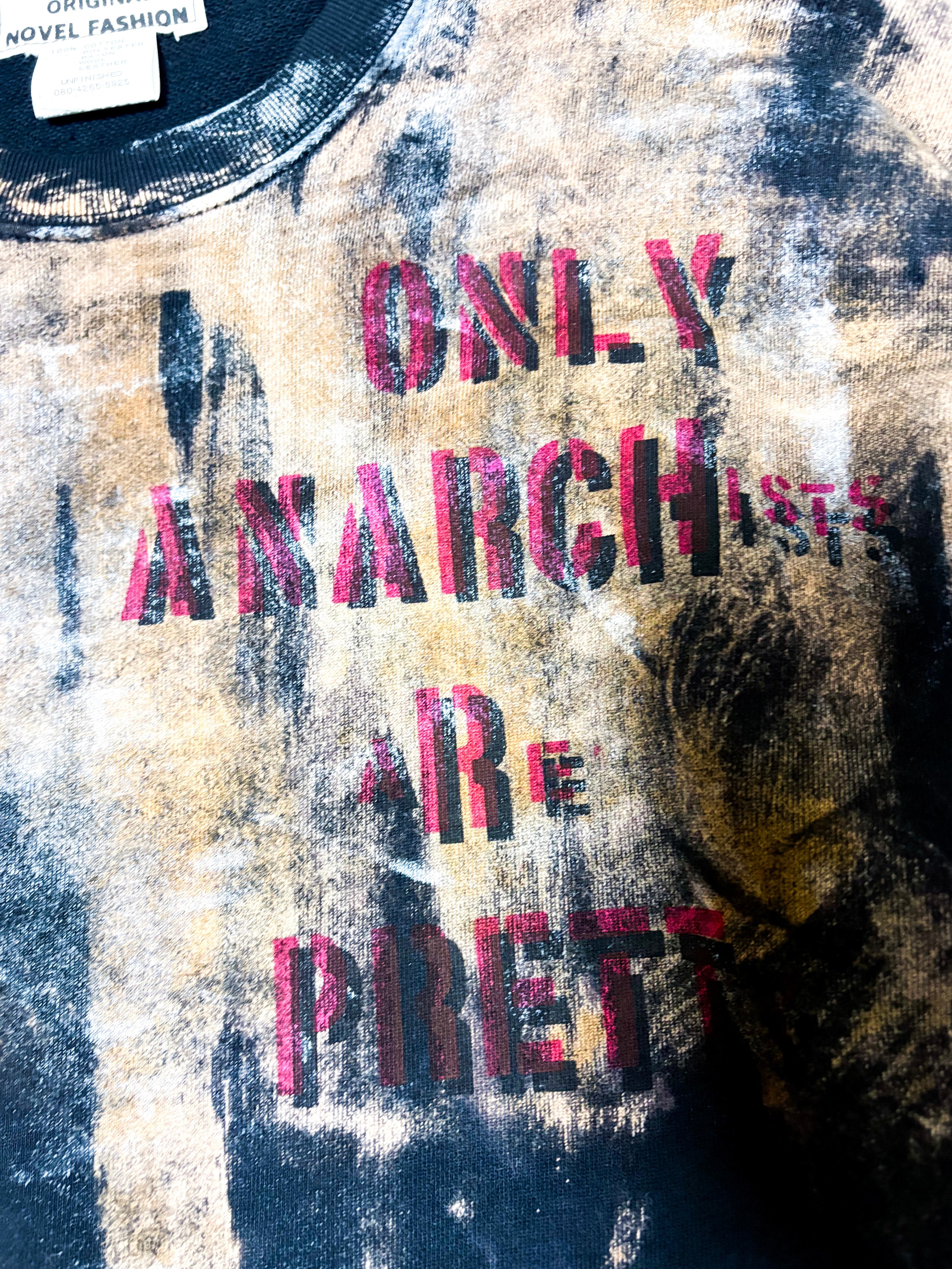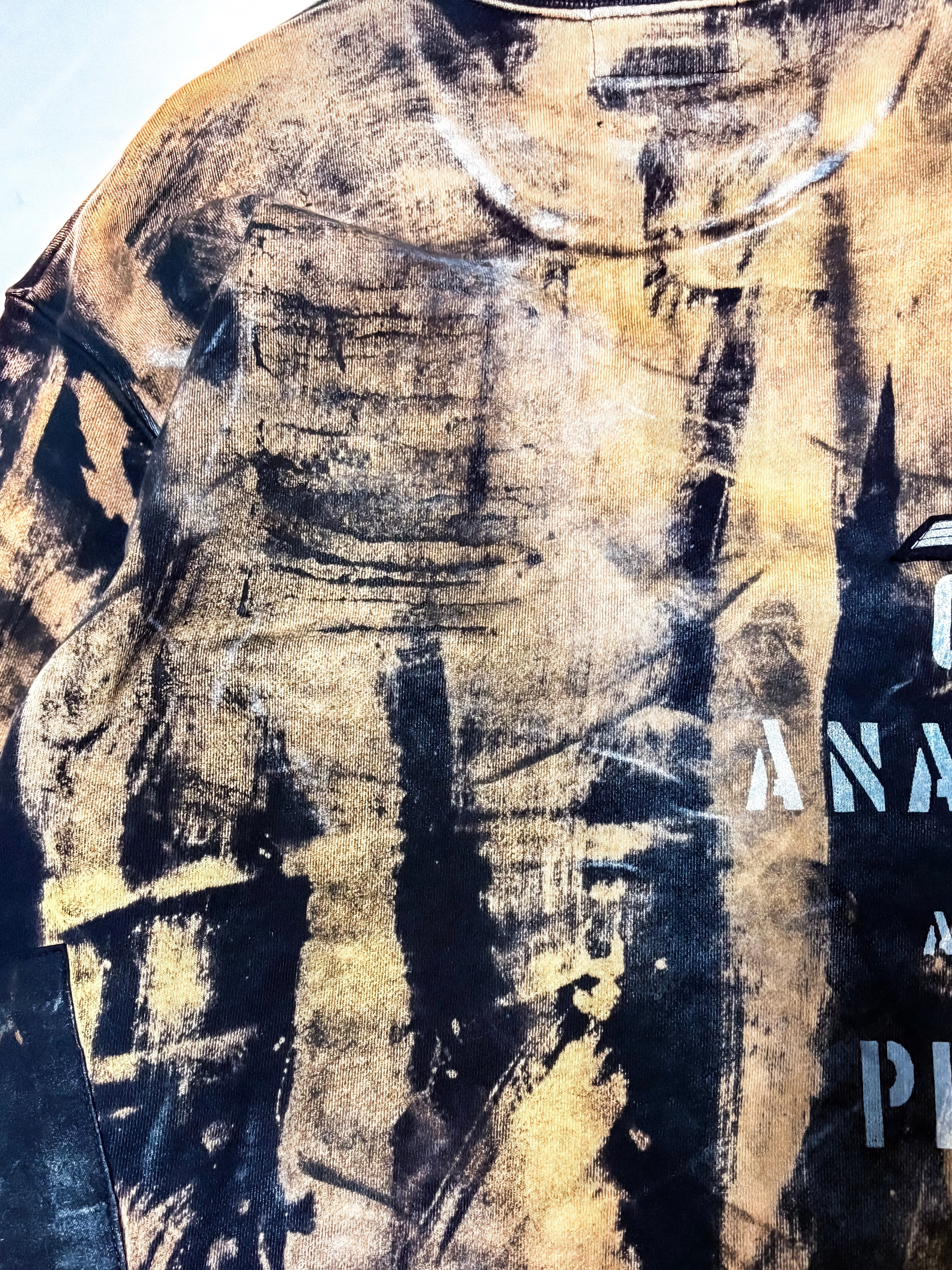 UNFINISHEDアナーキートレーナー26014 アナーキーシャツを彷彿とさせるブリーチやパッチ類が目を引くトレーナー。 ランダムなブリーチ加工にアナーキーシャツのようなストライプを所々に採用しています。 【サイズ】 肩幅54㎝ 着丈72㎝ 身幅60㎝ 袖丈60㎝ 袖口18㎝ 【送料】 購入金額に関わらず送料無料。