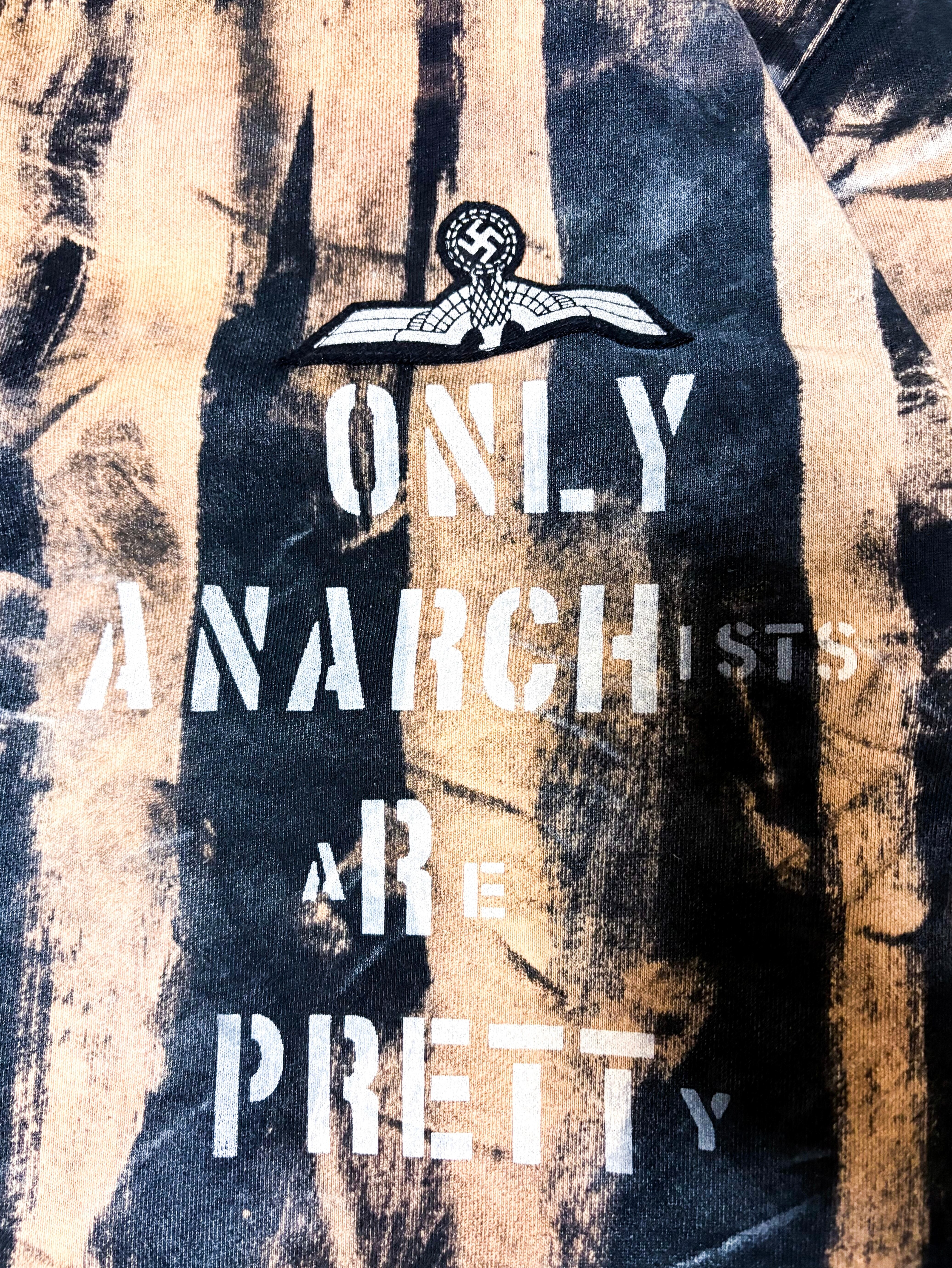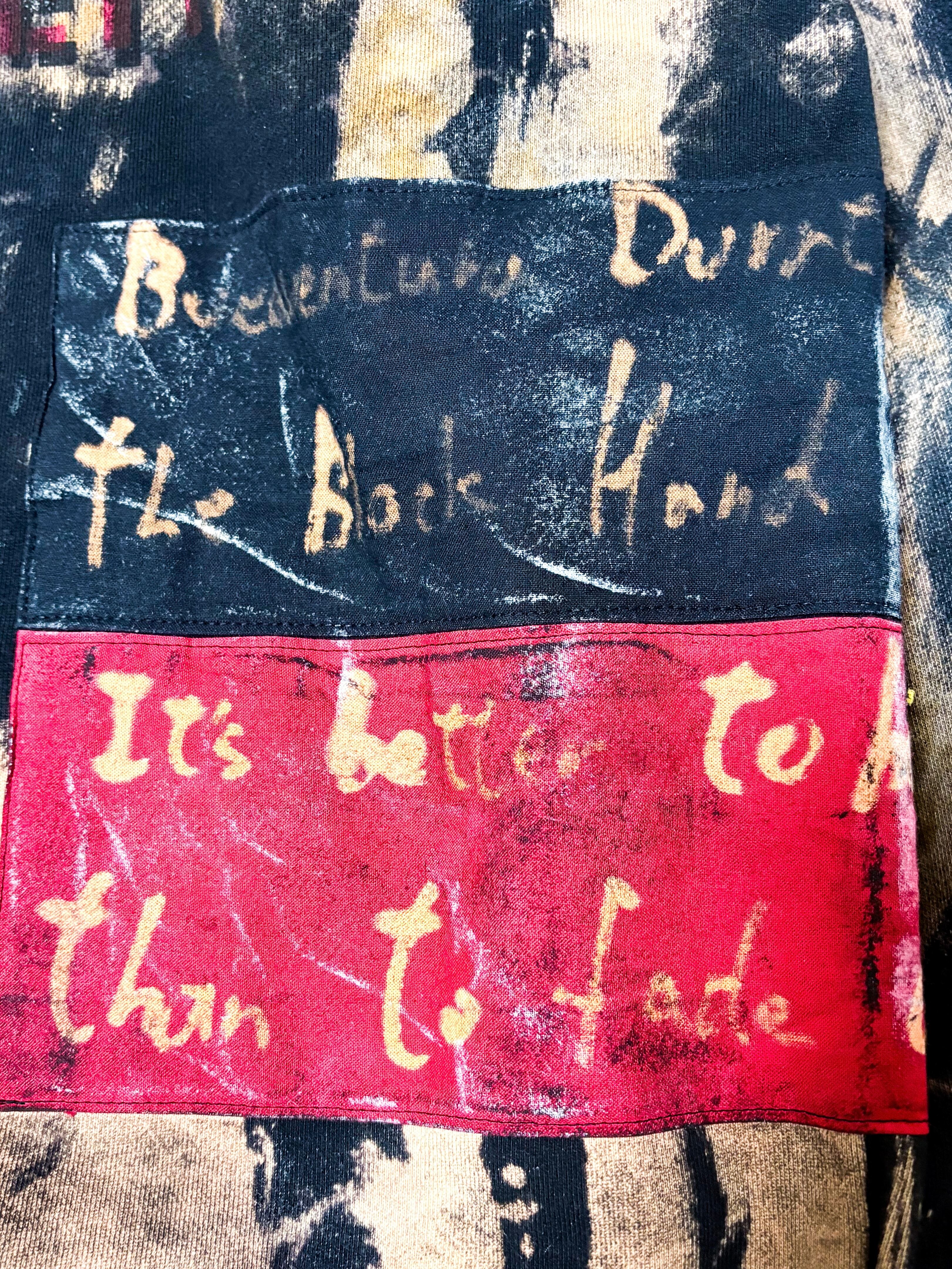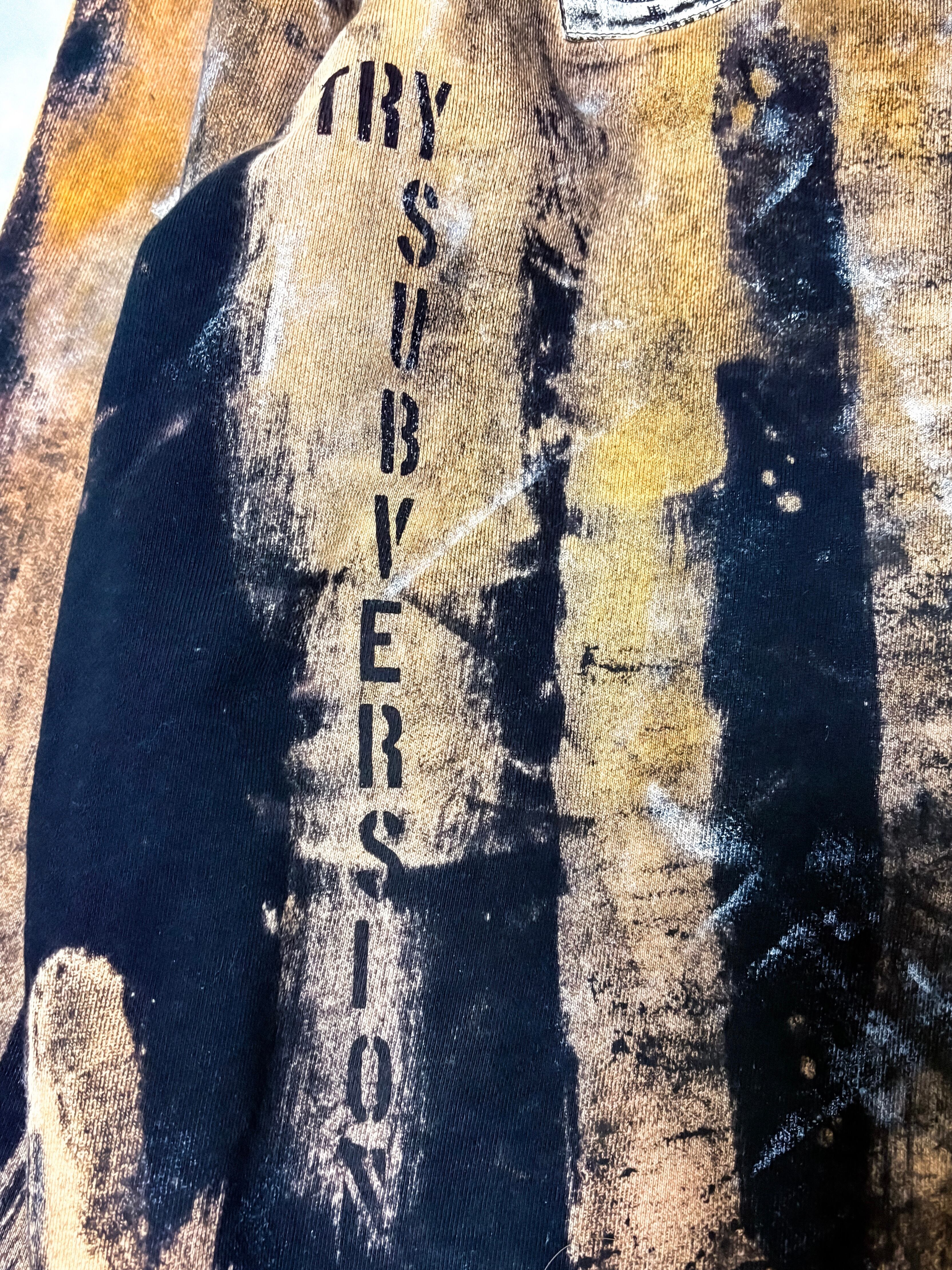 UNFINISHEDアナーキートレーナー26014 アナーキーシャツを彷彿とさせるブリーチやパッチ類が目を引くトレーナー。 ランダムなブリーチ加工にアナーキーシャツのようなストライプを所々に採用しています。 【サイズ】 肩幅54㎝ 着丈72㎝ 身幅60㎝ 袖丈60㎝ 袖口18㎝ 【送料】 購入金額に関わらず送料無料。