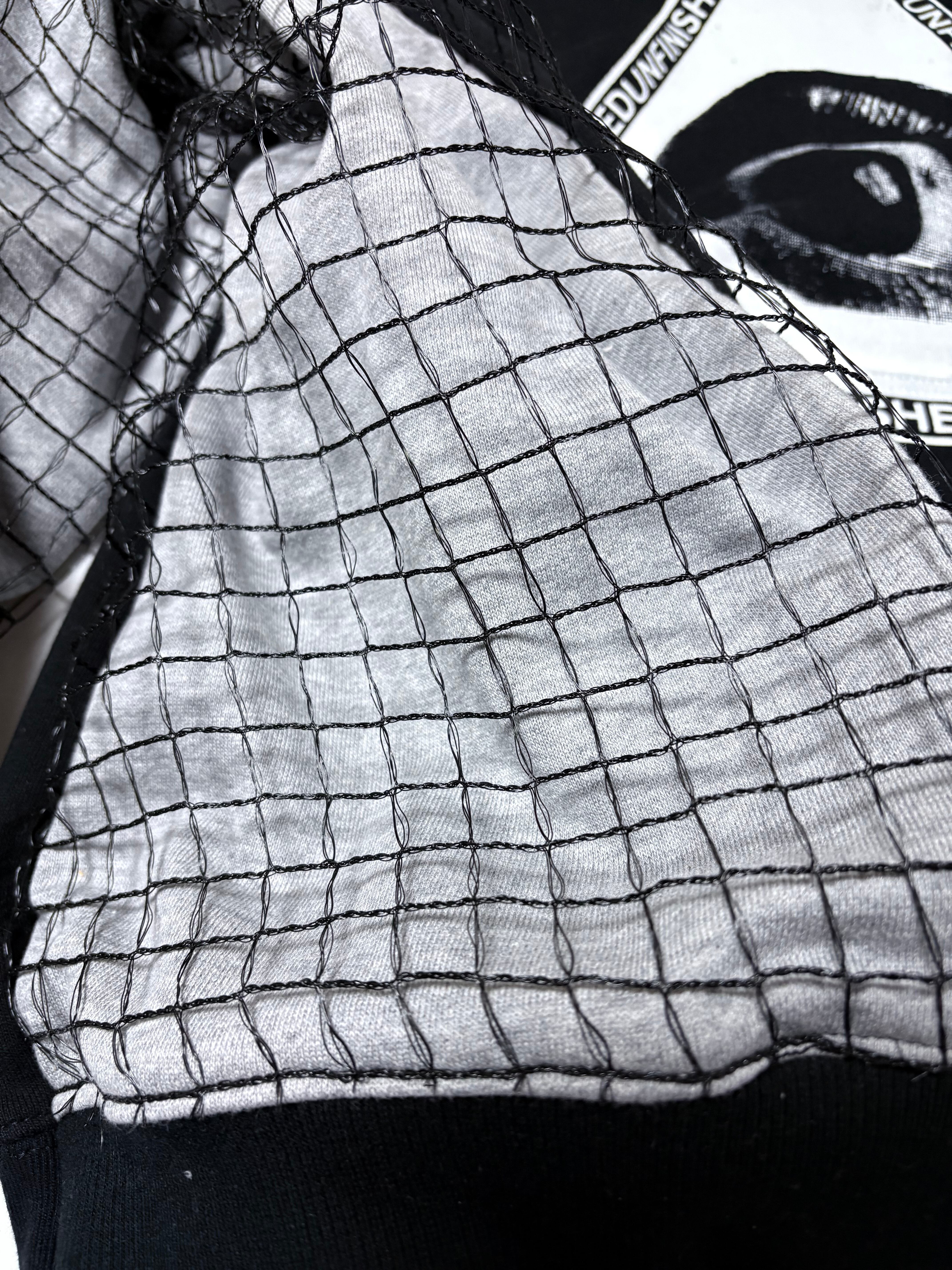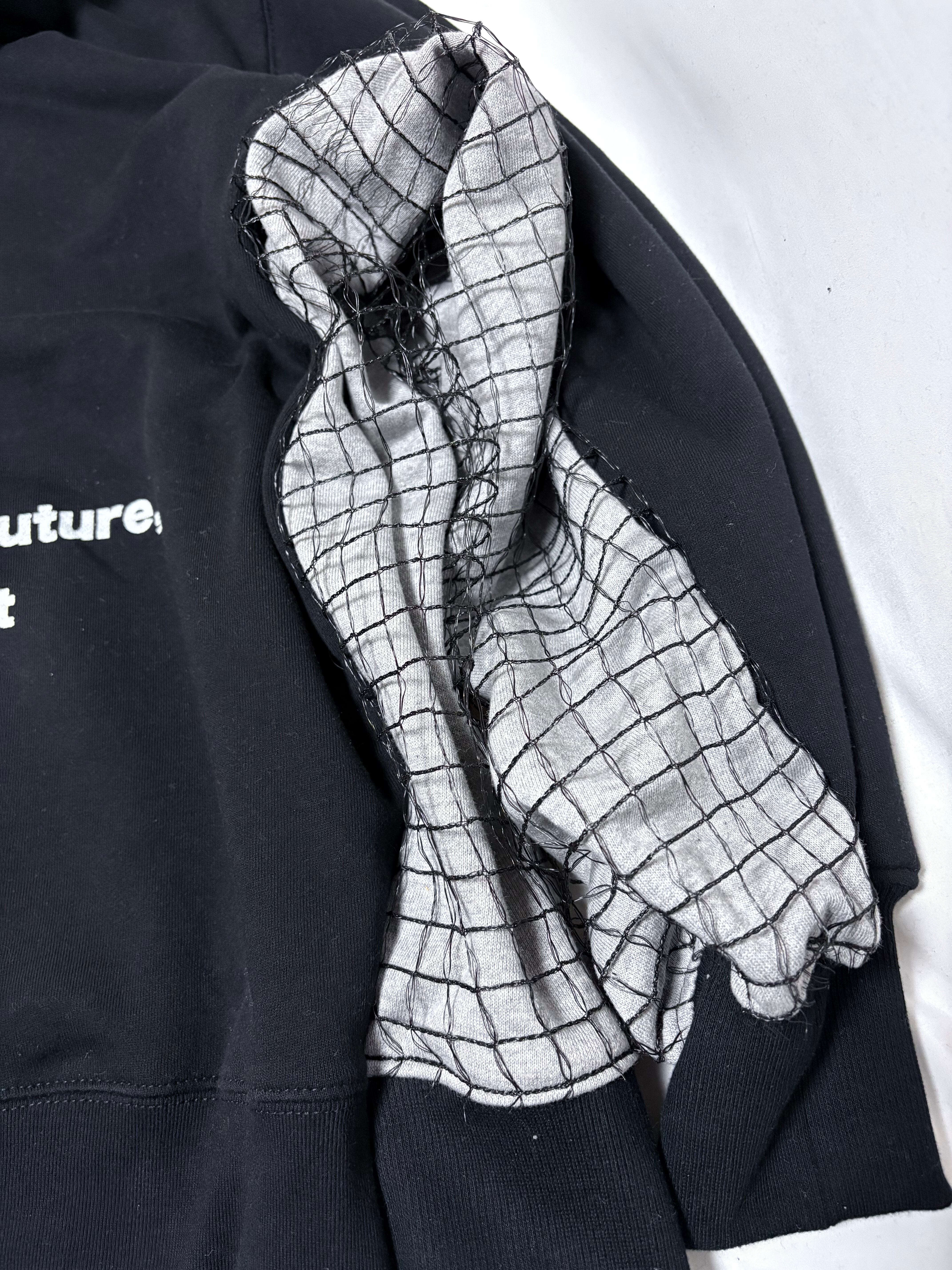 切り替え部にはグレーのトレーナー生地にアミを使用してグロテスクな表現を実現しました。