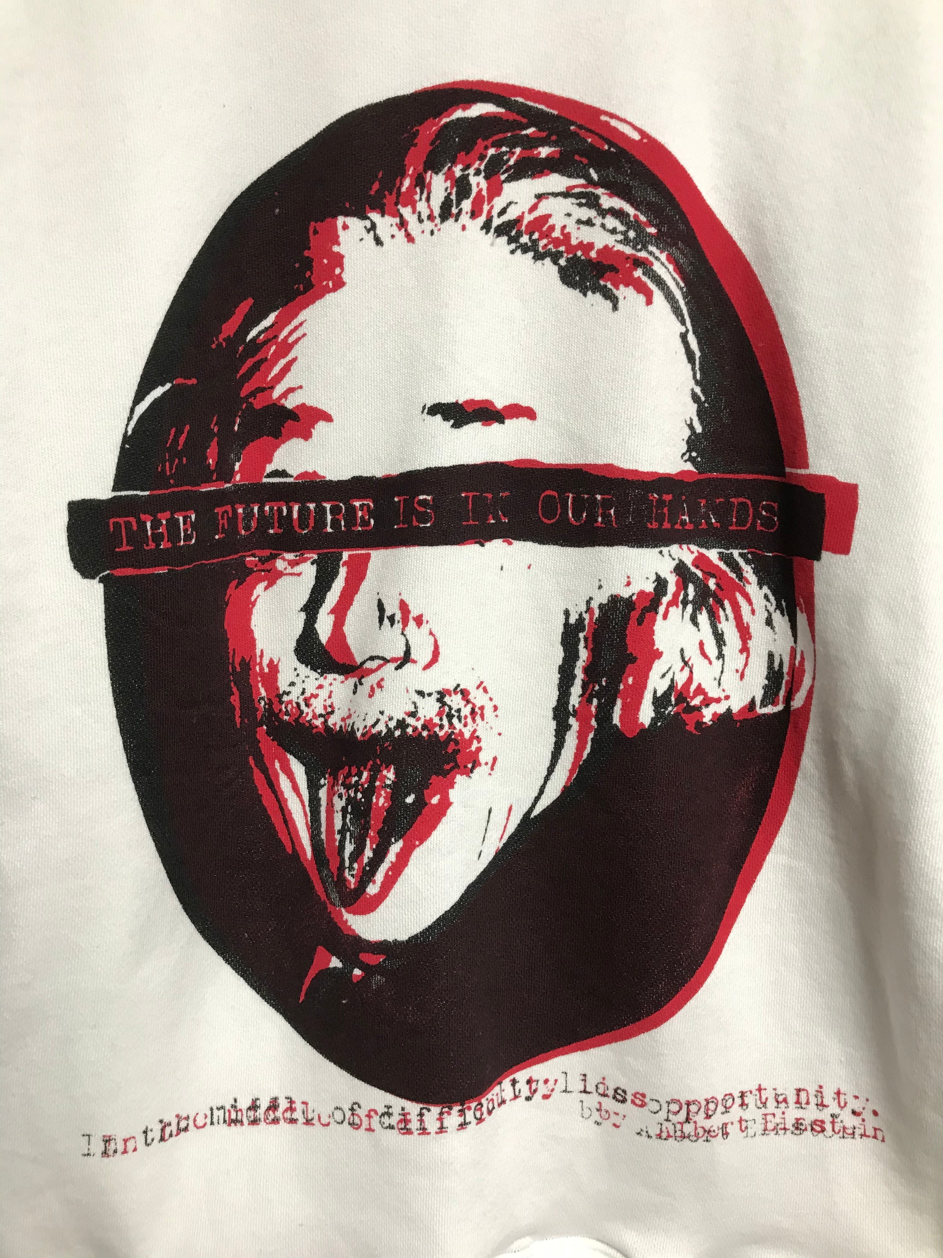胸のアインシュタインの目の部分には、『THE FUTURE IS IN OUR HANDS』(未来は僕らの手の中)の文字を採用しています。