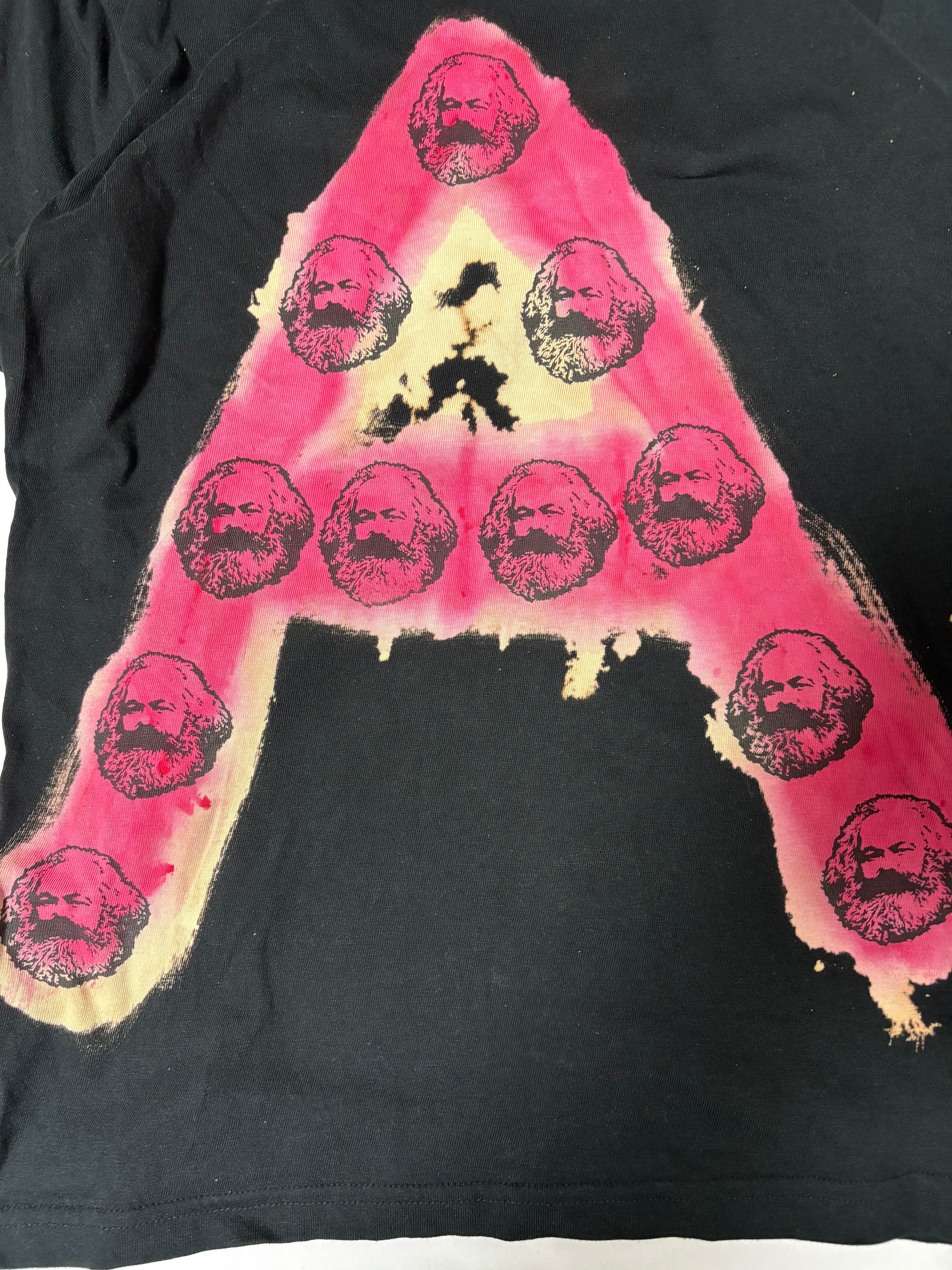 UNFINISHEDマルクスアナーキーTシャツ カールマルクスをアナーキーマークのAの文字を描くように配置したTシャツです。 【商品詳細】 素材 コットン100% 特徴 Tシャツ前面プリント 【サイズ】 L 肩幅44 身幅53 着丈71 【送料】 購入金額に関わらず送料無料