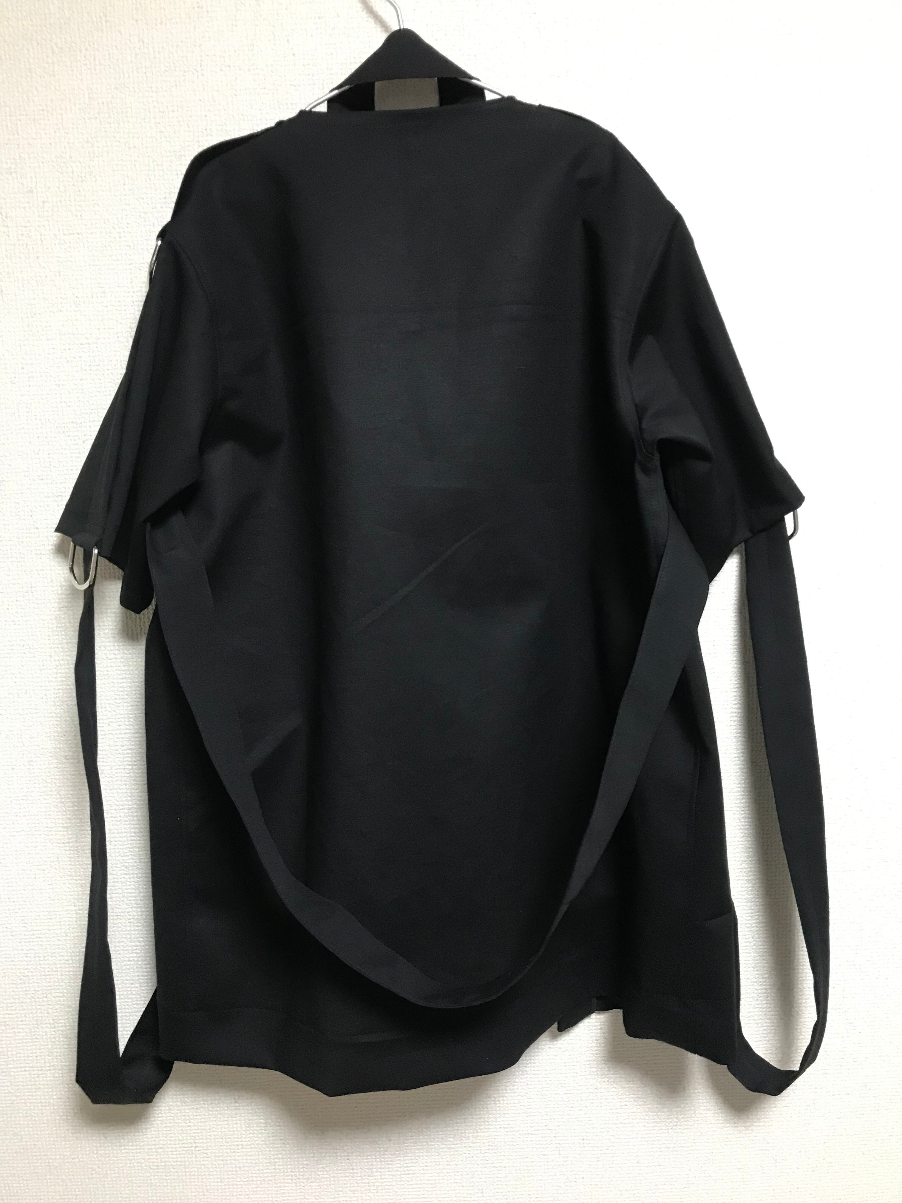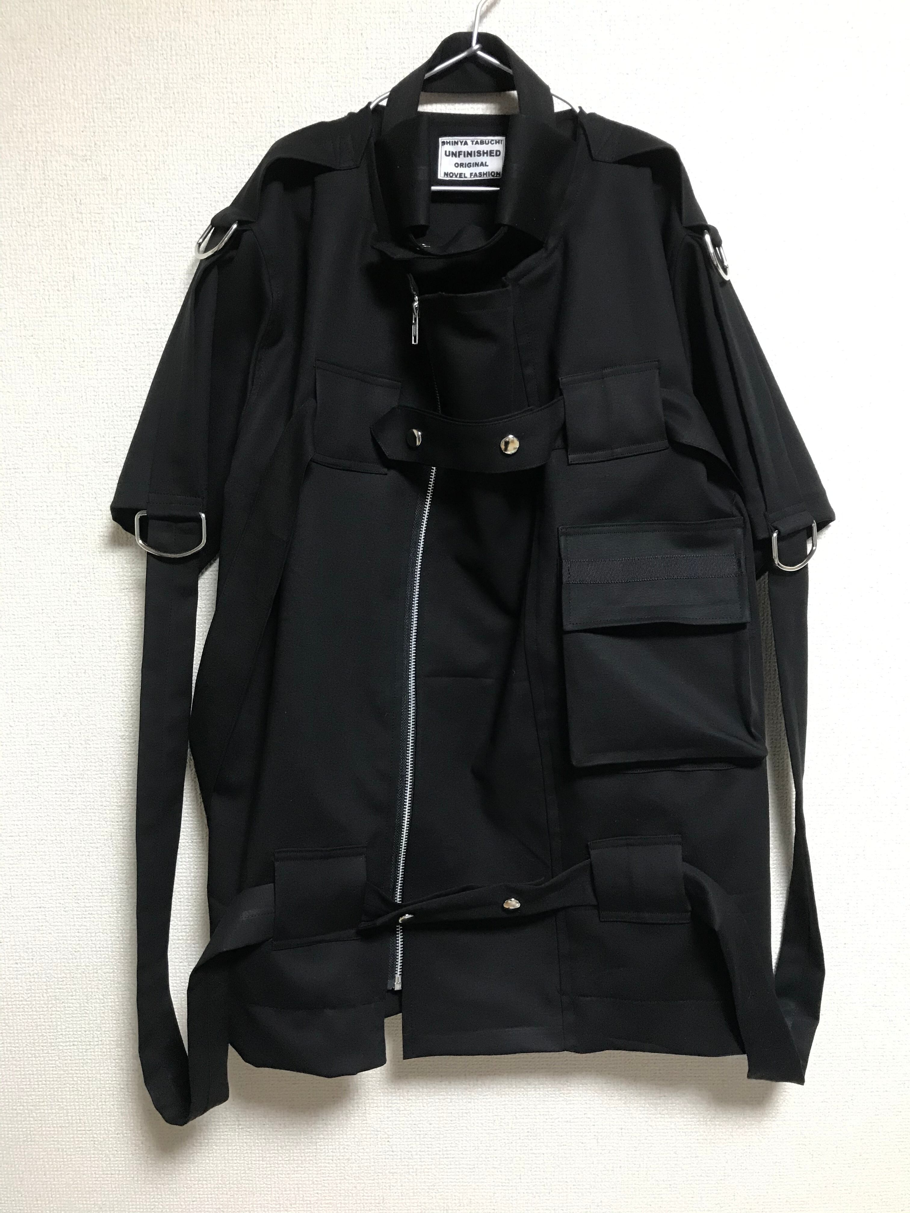 ご覧頂き誠に有難うございます。 こちらの商品は、ボンテージジャケットからインスピレーションを受けUNFINISHED独自にデザイン構成から変更した商品です。 ベルトで繋がれたように見える見た目は印象的です。 ベルト類取り外しが可能です。 【size】 肩幅46 身幅57 着丈75