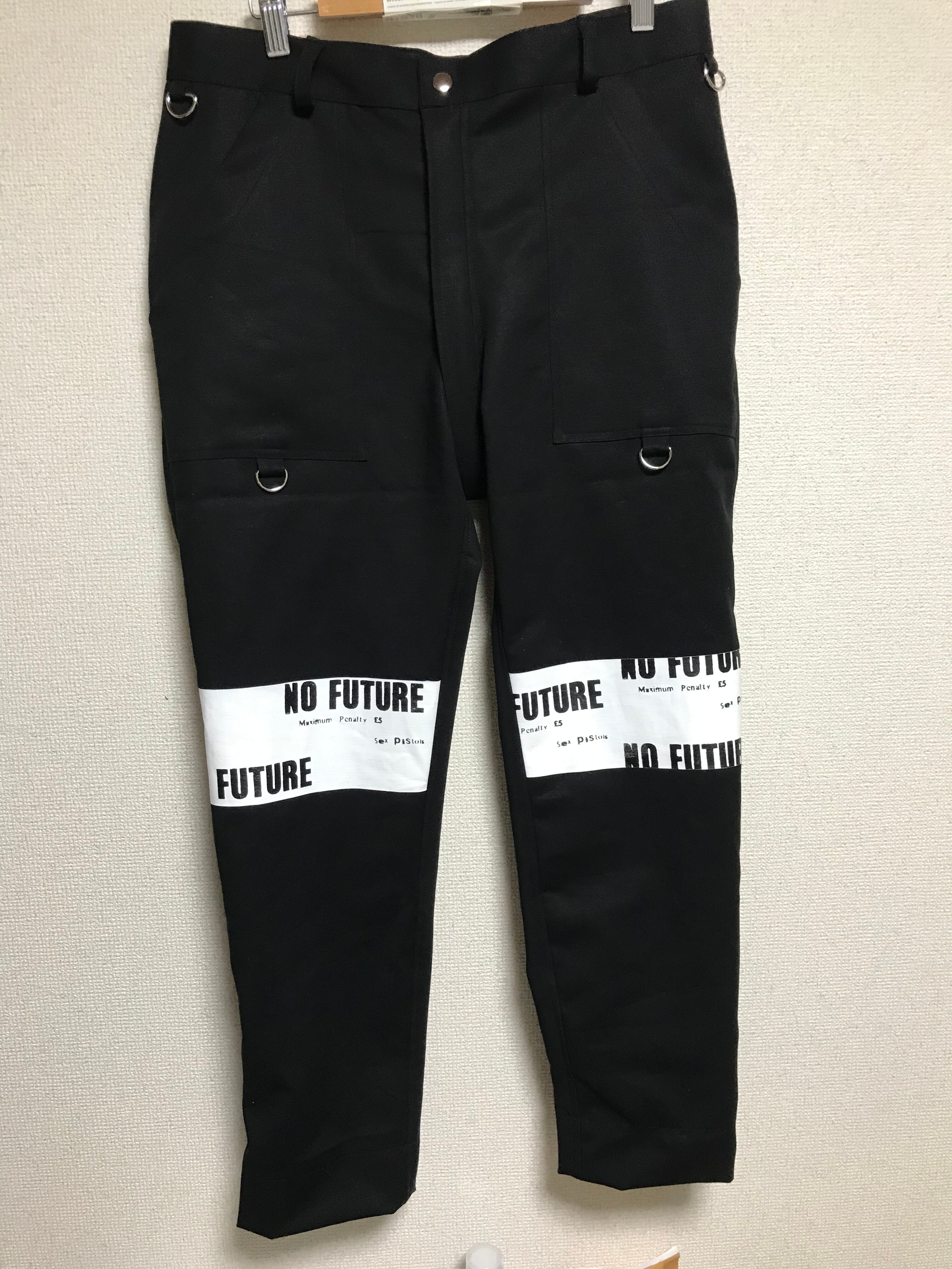 ボンテージパンツの様なファスナー開閉式で NOFUTUREの文字を膝辺りにプリントしました。 UNFINISHEDオリジナルパターンで構成したこちらのパンツは履き心地が良く 高品質な生地をベースに製作いたしました。 【SIZE】 ウエスト平置き41㎝ 股下68㎝ 股上34㎝