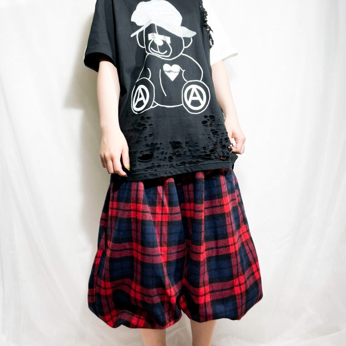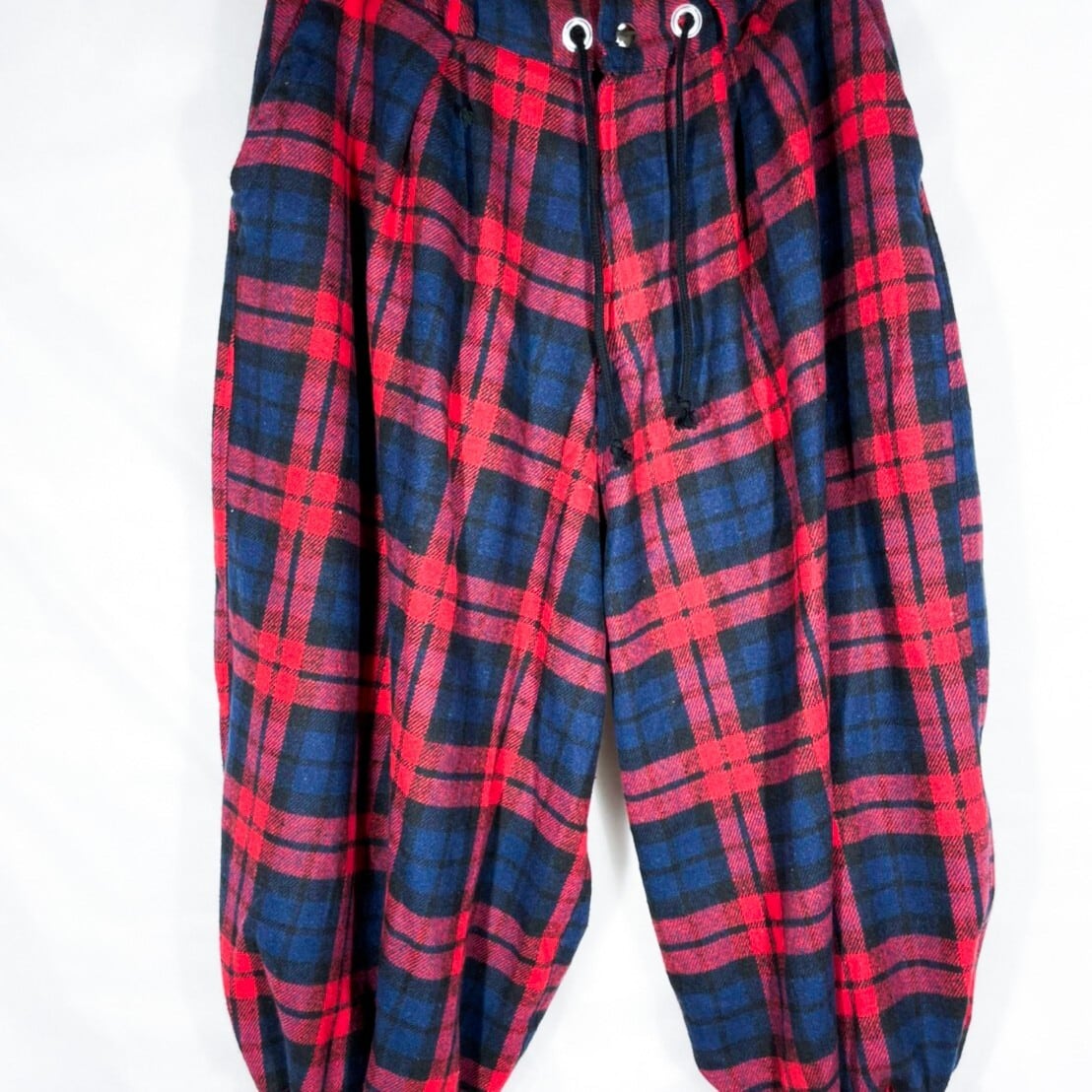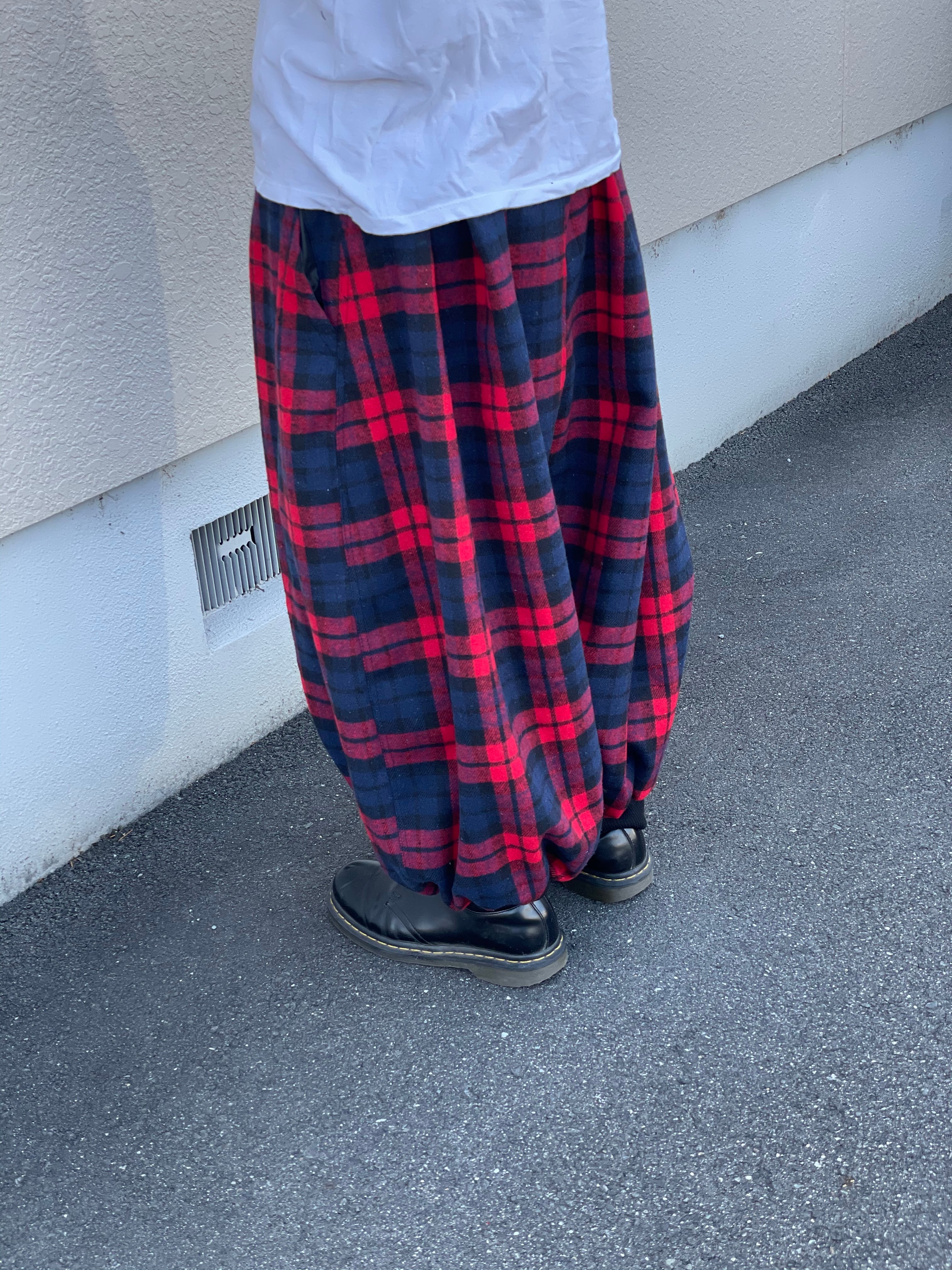 UNFINISHEDオリジナルのパターンからワイドカボチャパンツを製作いたしました。 チェック生地をベースに製作しており高級感のある触り心地、 カジュアルに着こなしてもロックに着こなしてもトップスを選ばない一品です。 紐を締めることでウエストXLサイズまでの方が着用可能です。 【サイズ】 ウエスト〜100㎝ L〜XL相当 股上41㎝ 股下52㎝ 【送料】 購入金額に関わらず送料無料