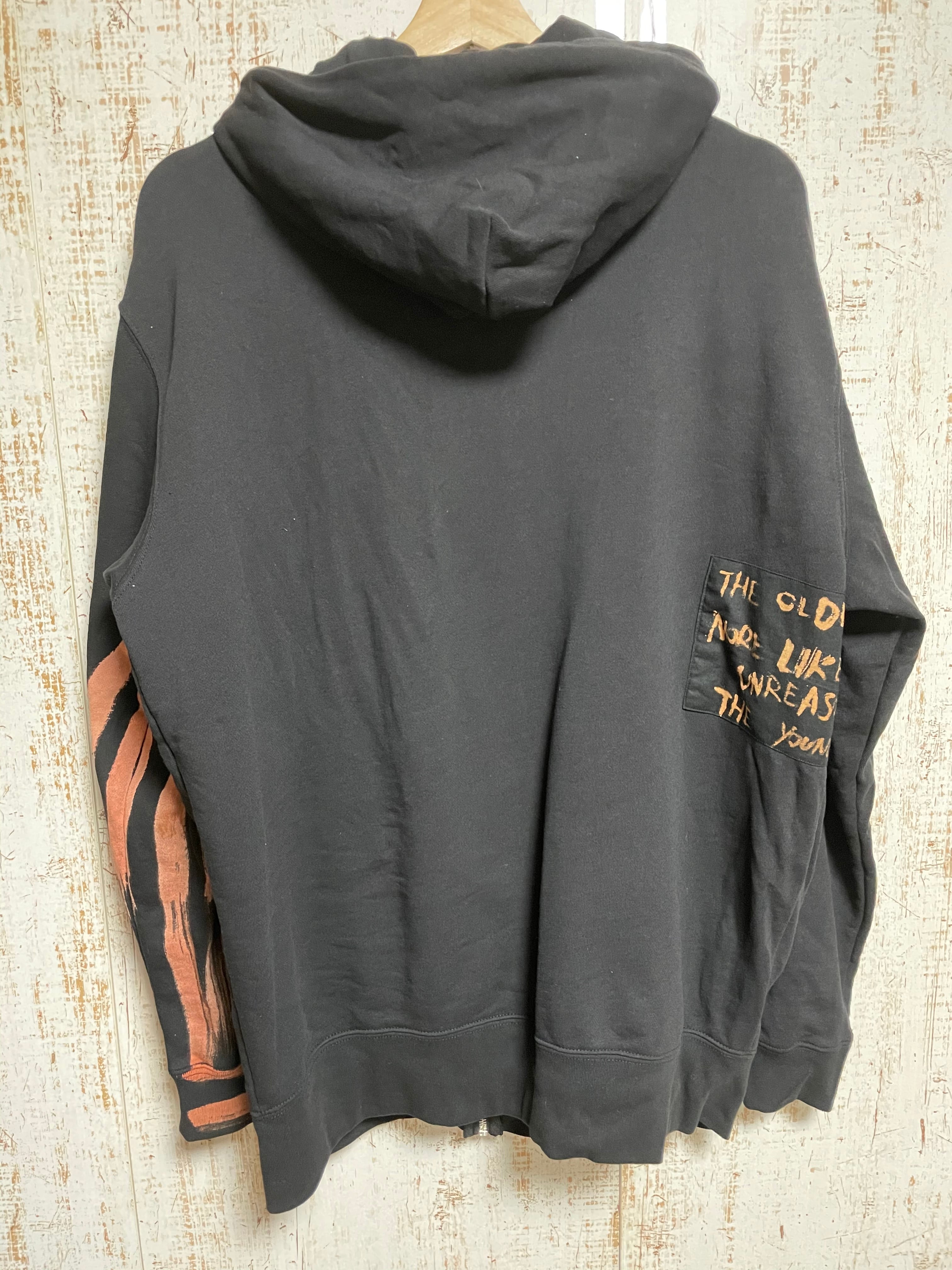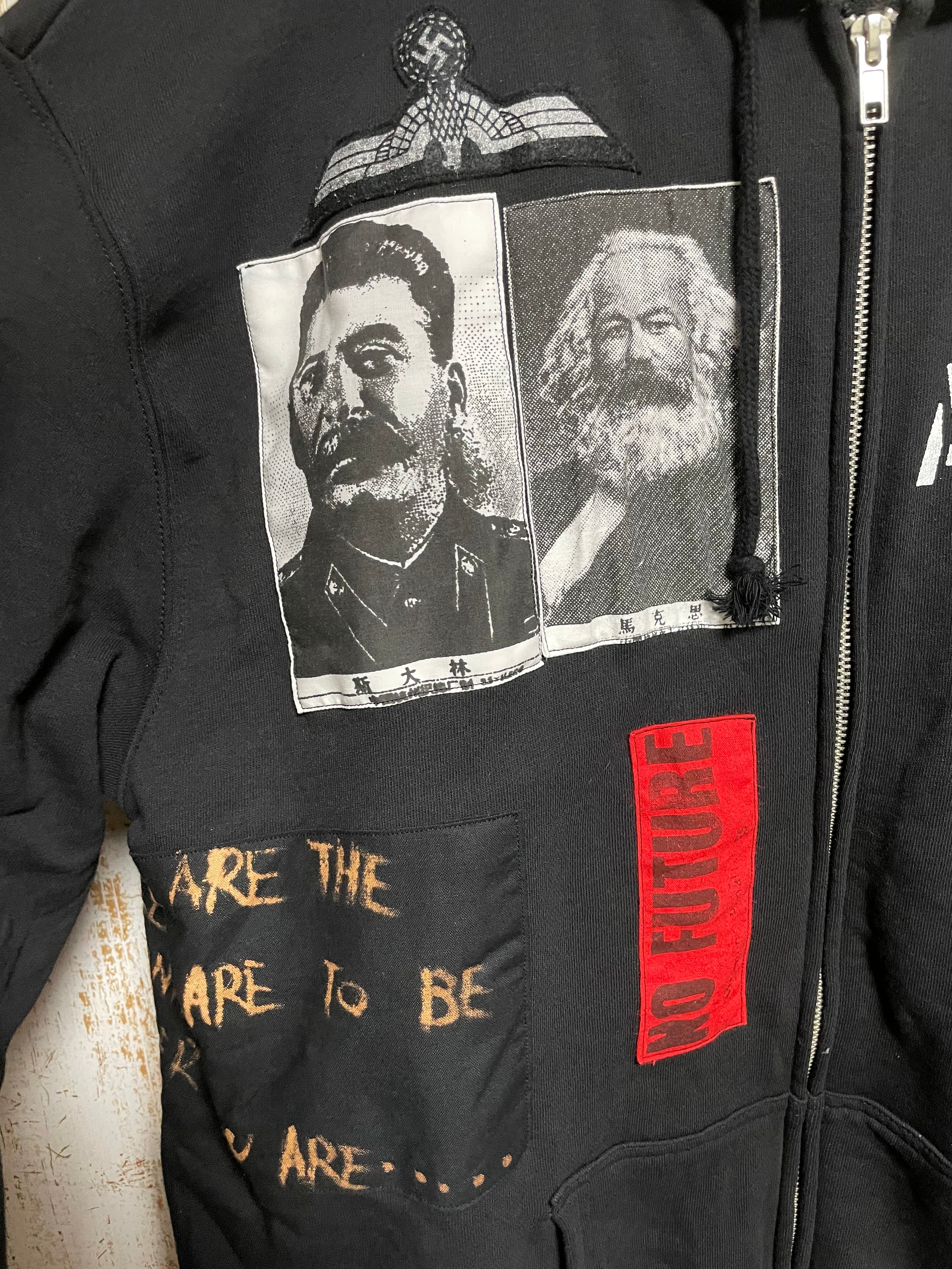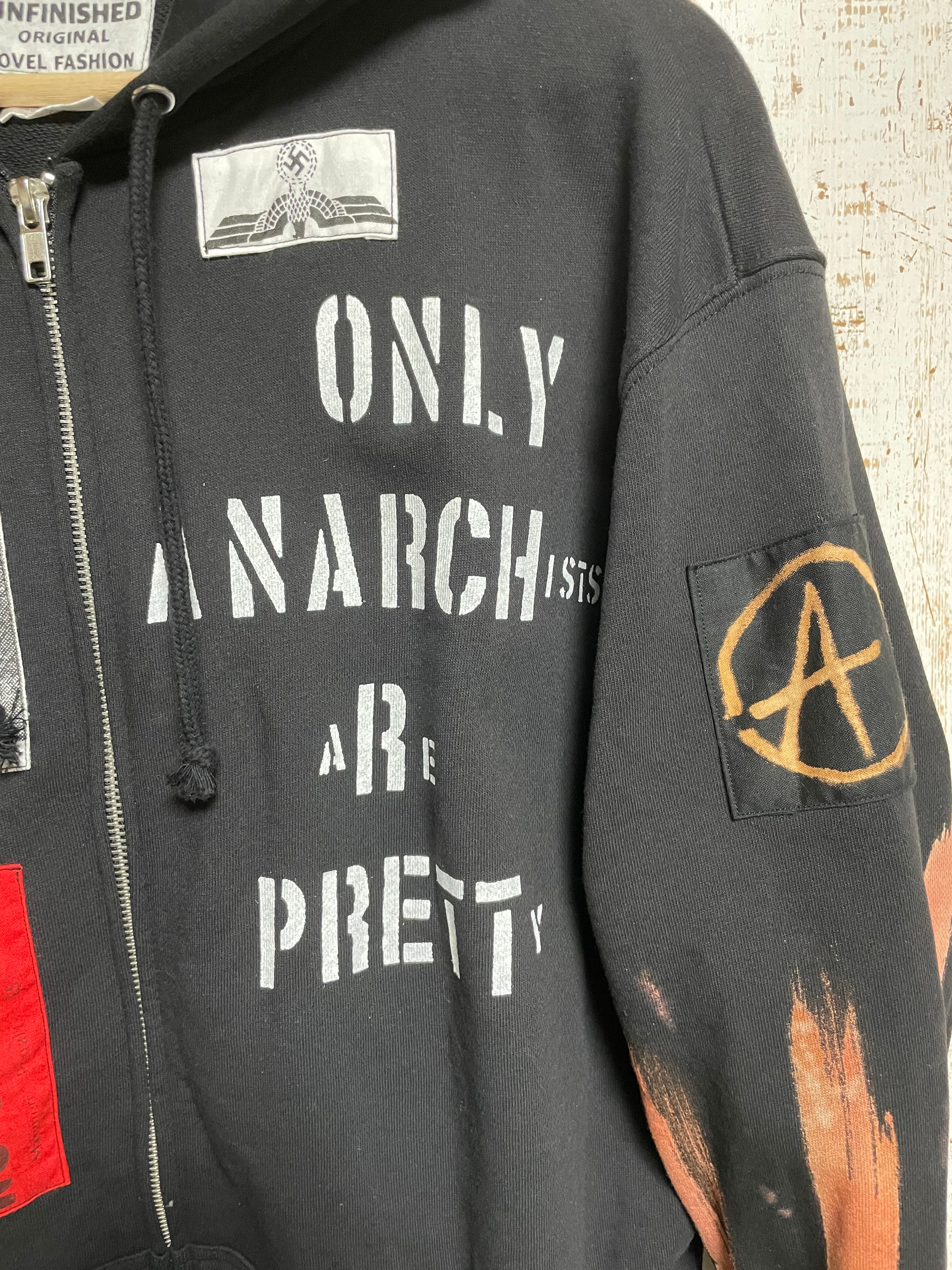 ご覧頂き誠にありがとうございます。 こちらの商品は、70年代ヴィヴィアン ウエストウッド マルコムマクラーレンが手がけたブランド『seditionaries』セディショナリーズからインスピレーションを受けUNFINISHED独自のスパイスを加えたパーカー。 パッチ類は何度も試行錯誤を繰り返し、完成したクオリティに自信を持ってお勧めできるお品です。 【サイズ】 肩幅53 着丈75 身幅65