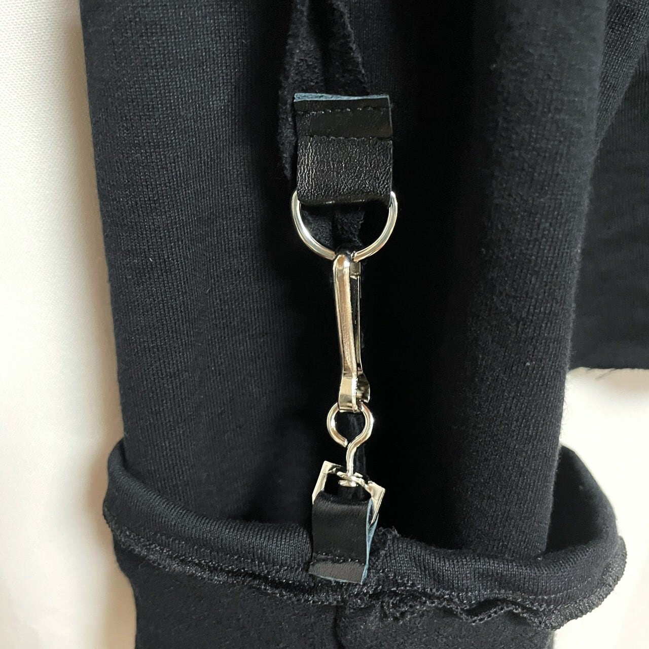 袖は手よりもずっと長く、袖口につけられたスイヴィル・ドッグクリップでたくし上げ、 肘と肩のDリングに留める。