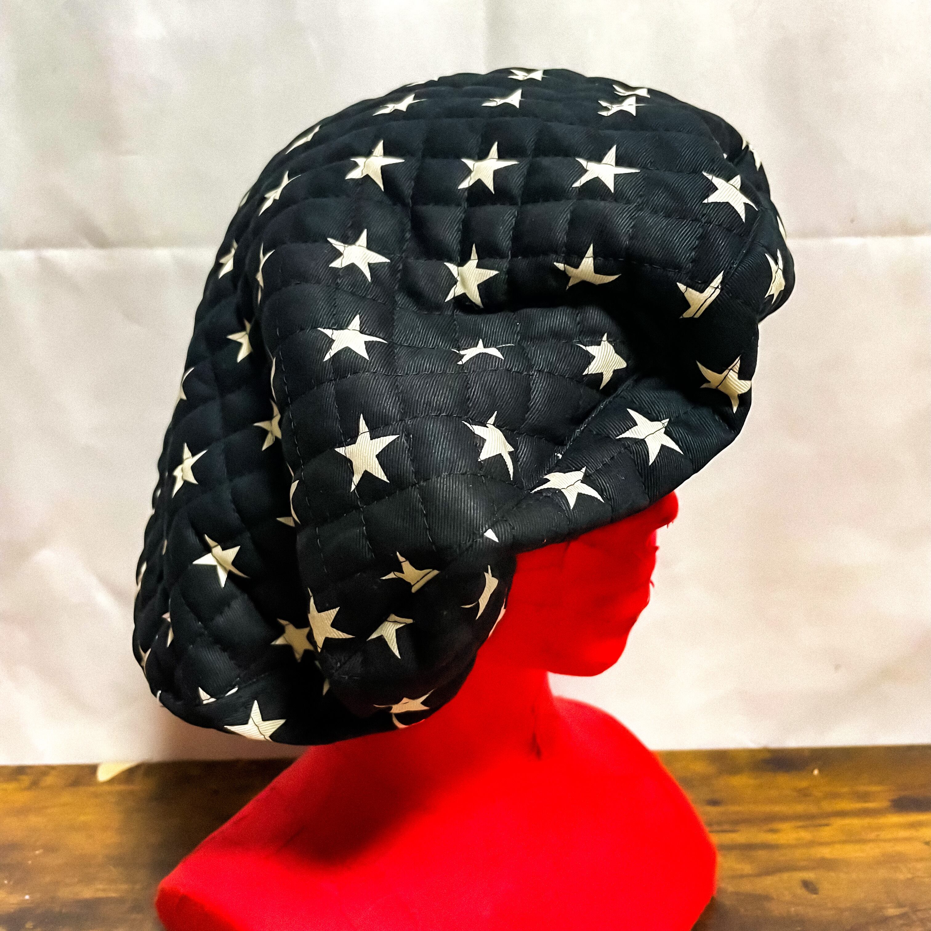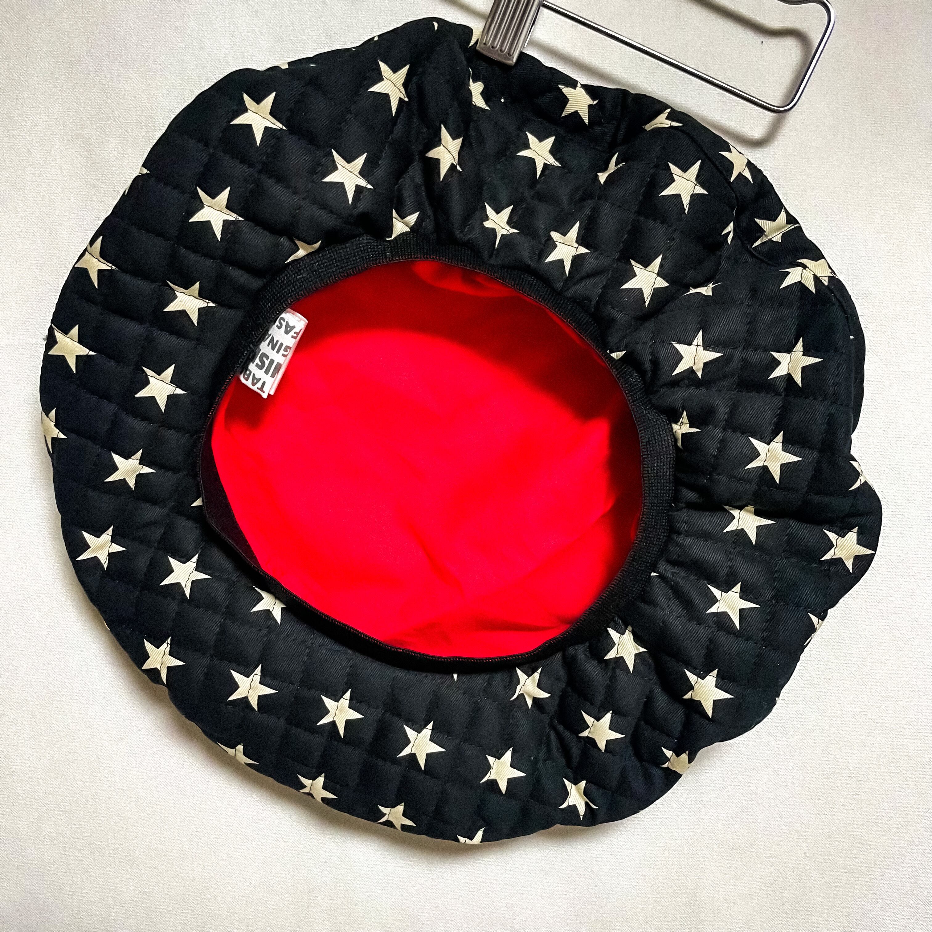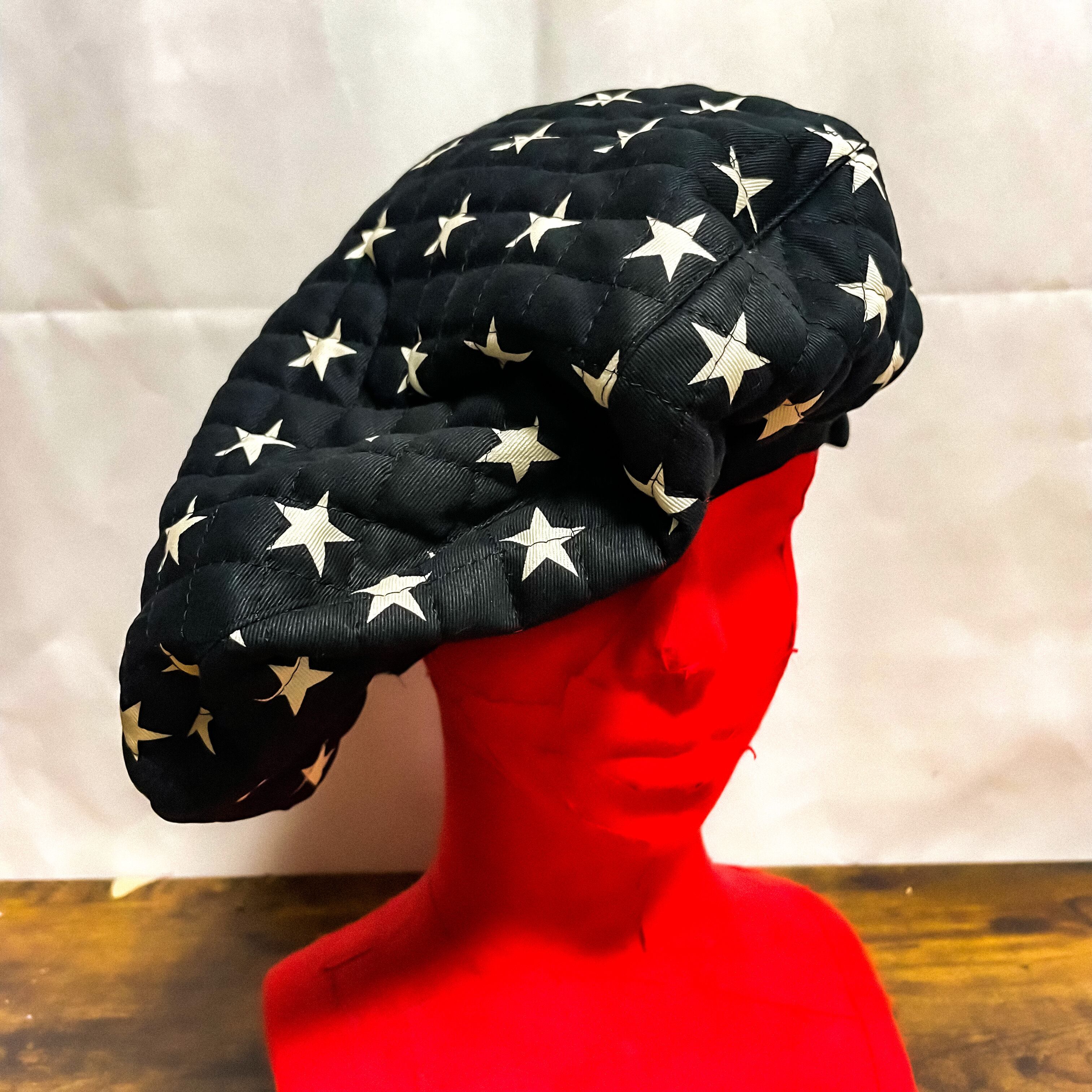 星の総柄キルト生地をベースにビッグシルエットで構成したこちらのベレー帽は大きめに着こなしたい時やトップ部分にインパクトを求めている方にオススメです。