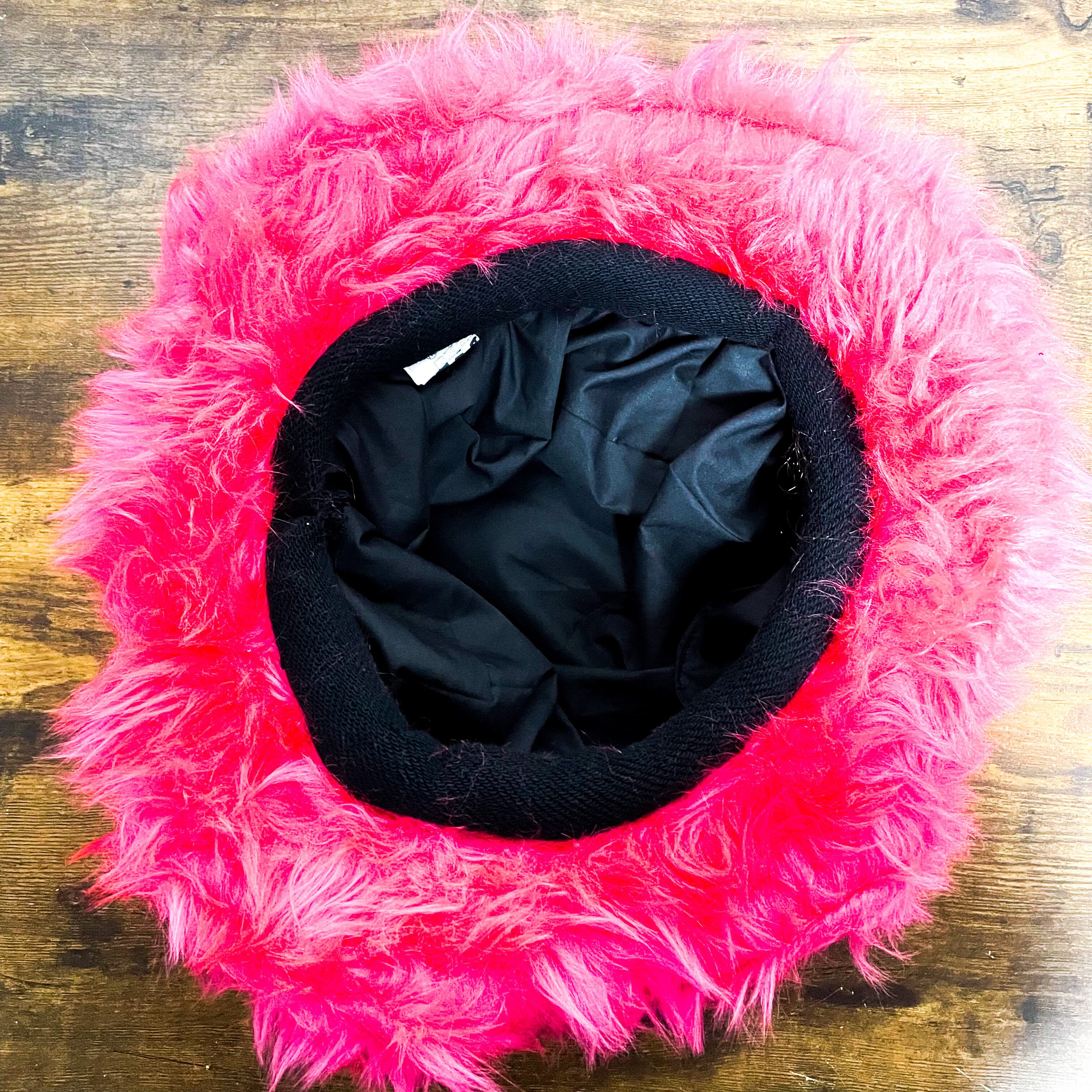 ご覧いただき誠にありがとうございます。 シルクハットのシルエットをピンクファーの生地で制作。 内側に黒い生地を使用しており、 ハットのリブ部分は柔らかいクッションを使用し被り心地が良くなるよう工夫しています。 【size】 外径 ツバの端から端まで37㎝程度。 内側リブ部分 直径18〜20㎝ 購入金額に関わらず送料無料。