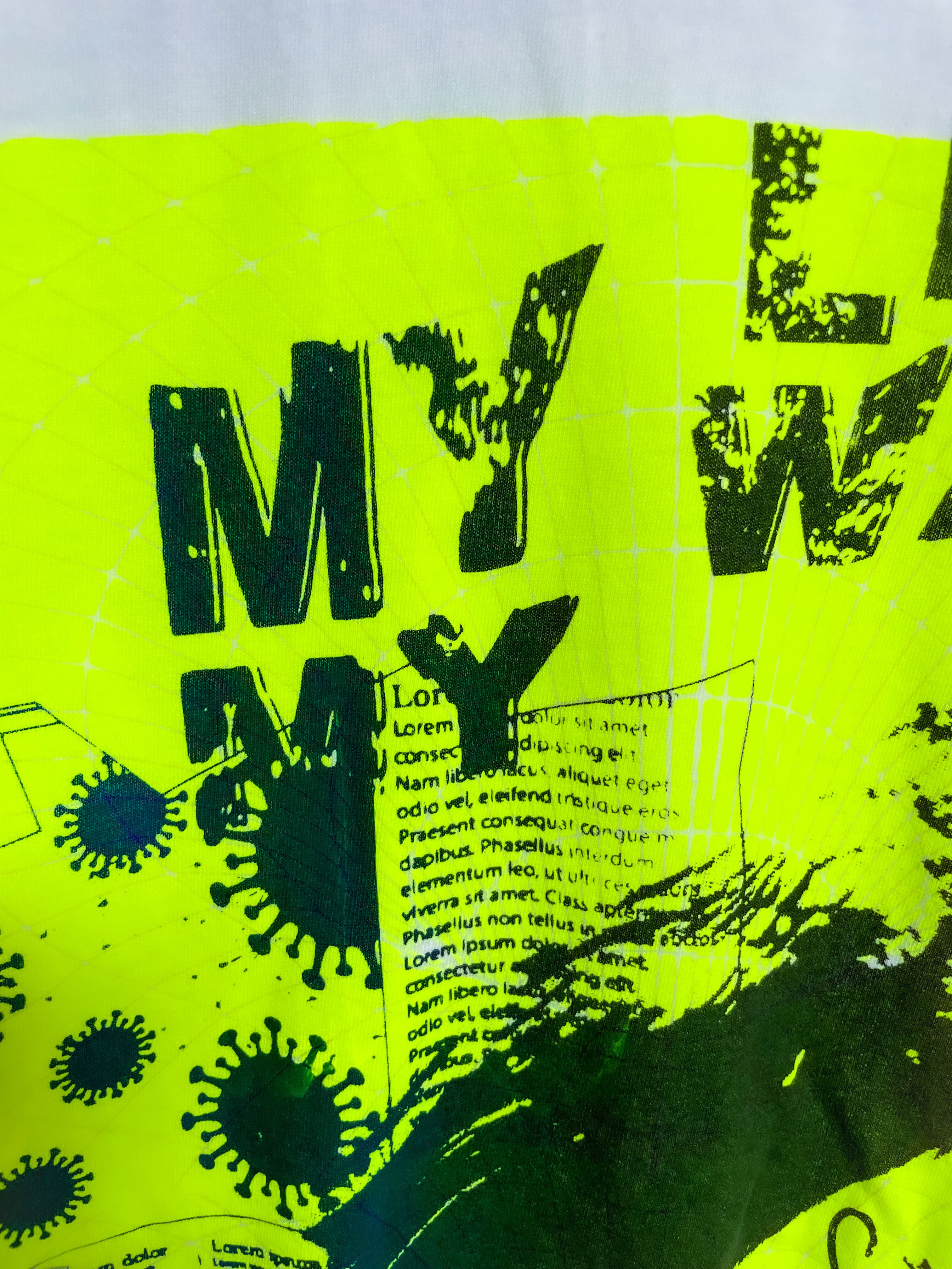 蛍光イエローの部分も特殊なプリント方法で乱れを表現しておりプリントするたびに違う見た目になります。