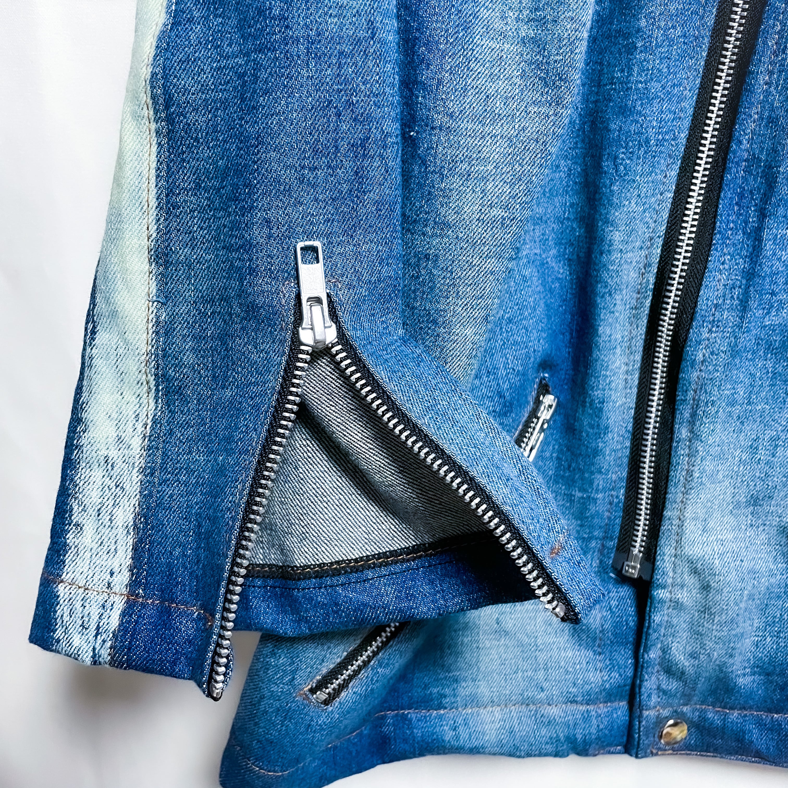 こちらの商品は、岡山デニムをベースに職人の手でダメージ加工を施した生地で制作したライダースジャケットです。