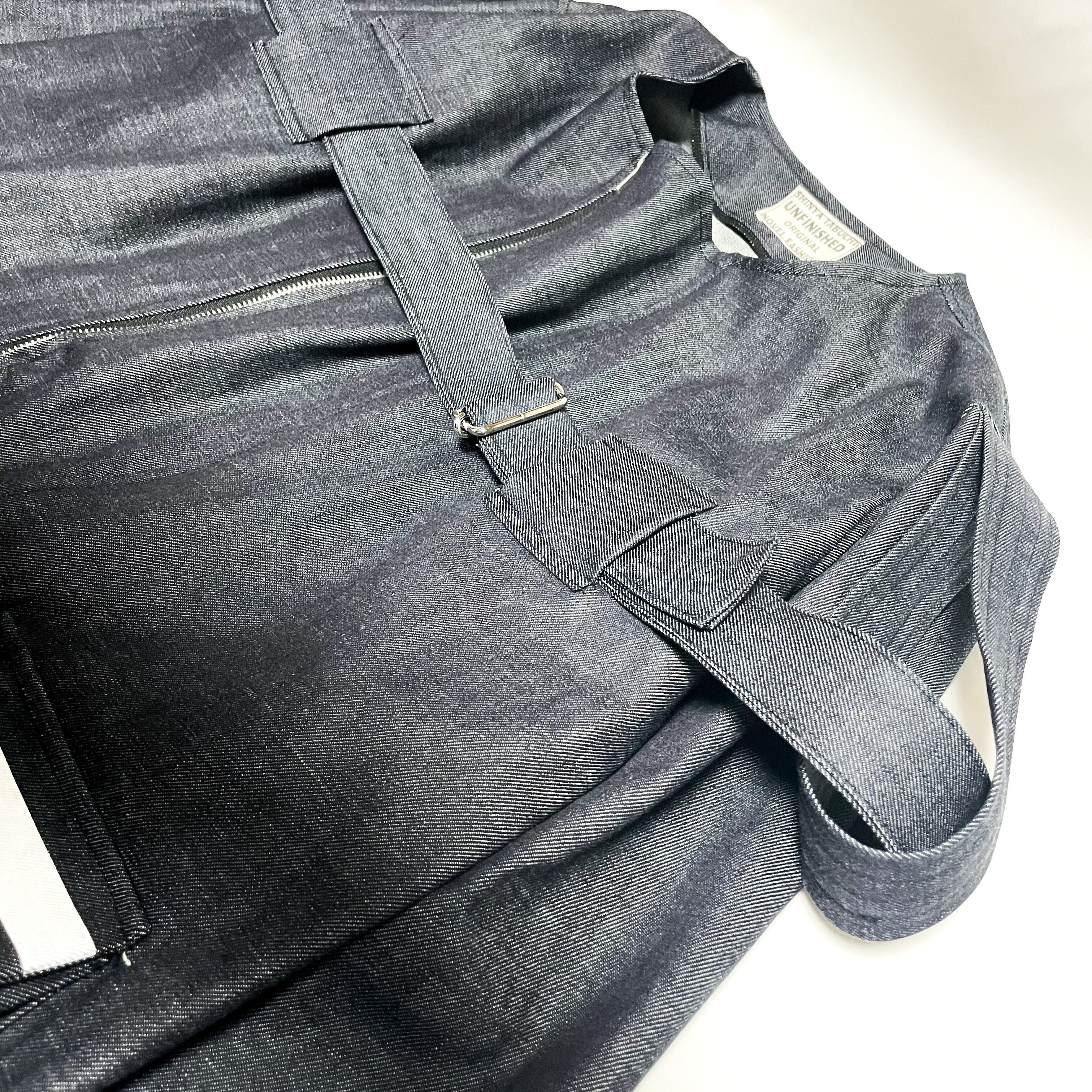 UNFINISHED岡山デニム ボンテージジャケット2023007 岡山デニムをベースにシングルベルトのボンテージジャケットを制作いたしました。 裾や袖口部分の白ラインが印象的でインパクトのある1着です。 【size】 肩幅44㎝ 身幅56㎝ 着丈74㎝ 購入金額に関わらず送料無料。