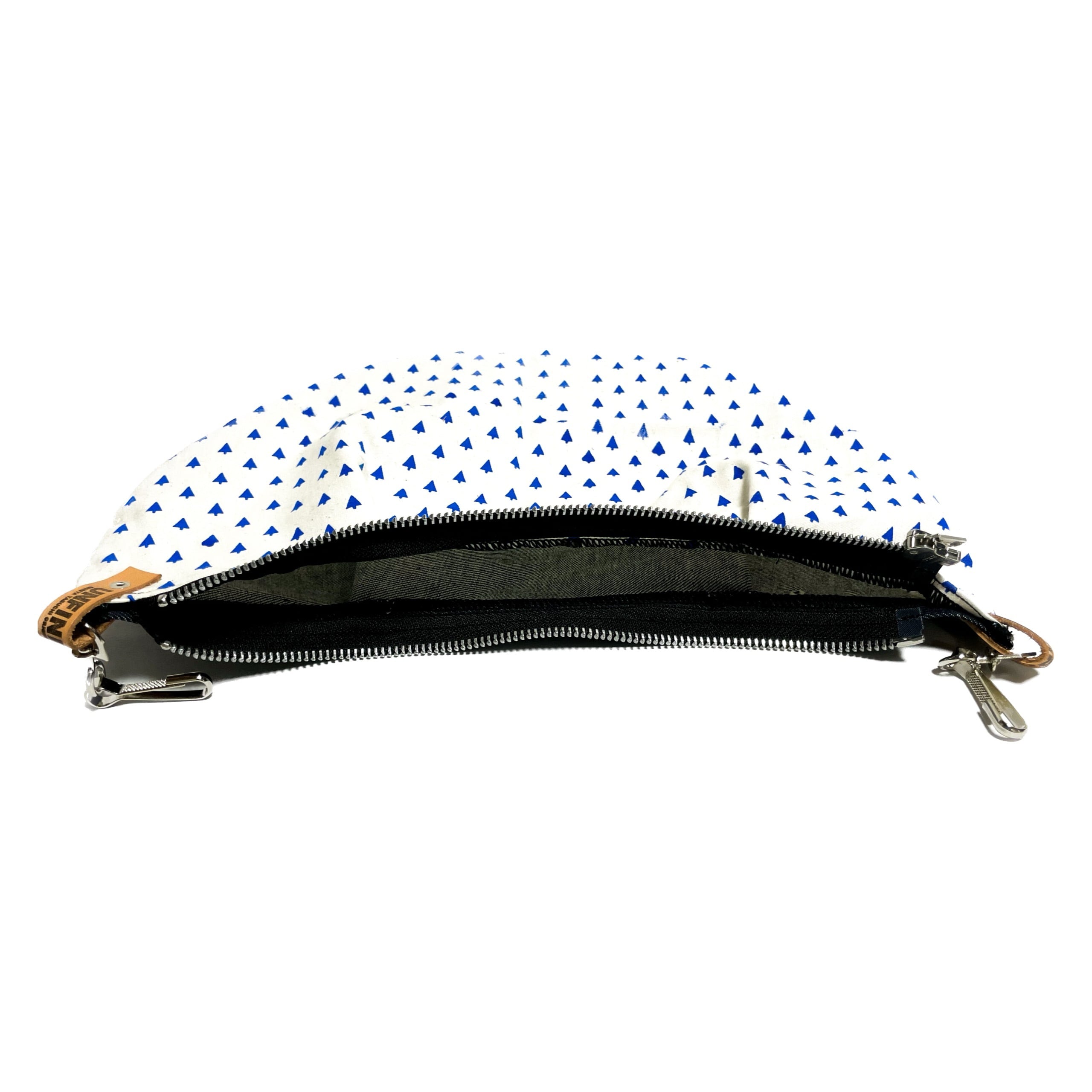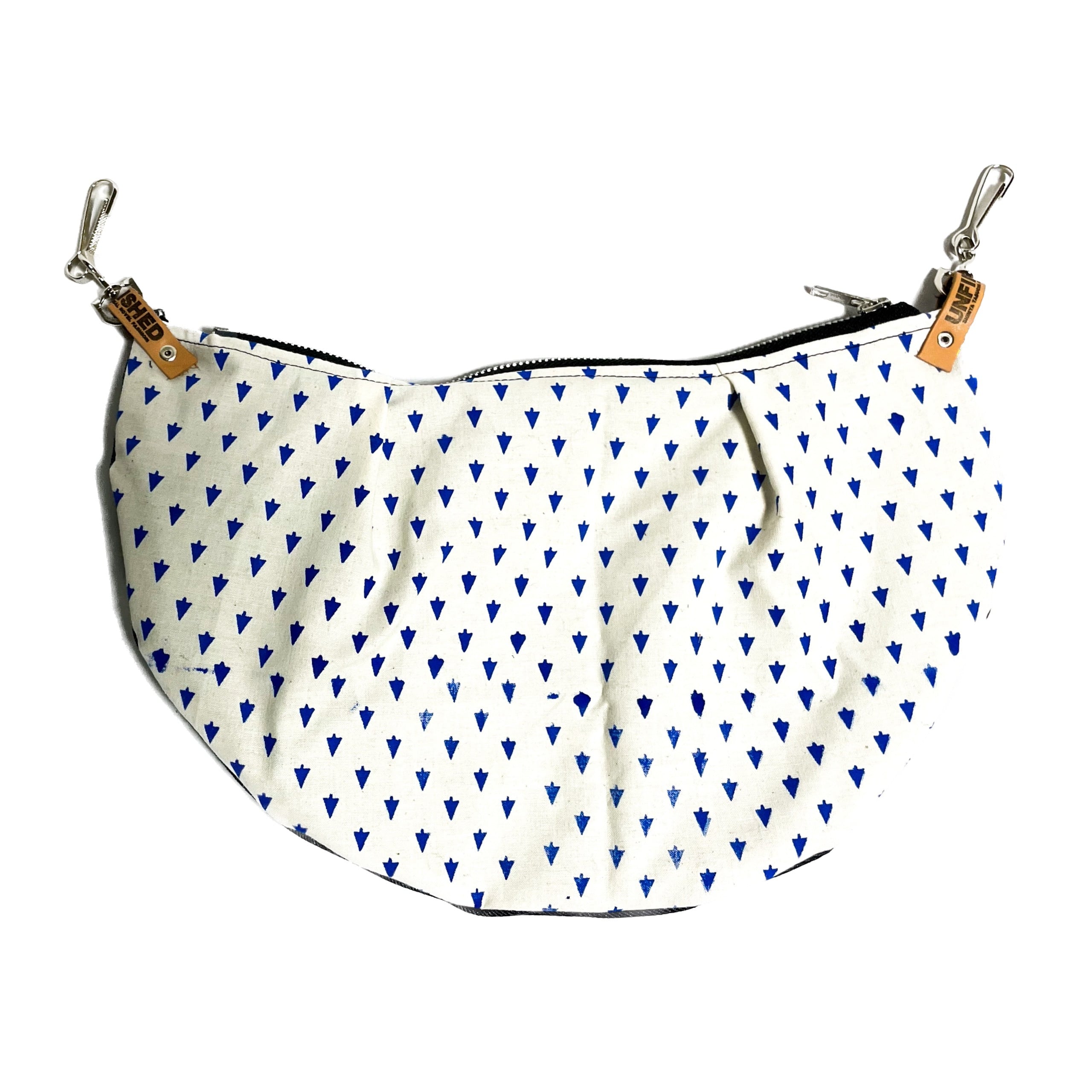 バムフラップ2023015 表裏で柄の違うバムフラップです。 歴史のある岡山デニムを使用した表面。 ブルーの矢印生地は柄からシルクスクリーンの手刷り手法を用いて制作いたしました。 レザー部分にはUNFINISHEDの文字を油性塗料にてスタンプを施しています。 【サイズ】 生地の端から端まで 横35㎝ 縦20㎝ 金具の端から金具の端まで49㎝ 購入金額に関わらず送料無料。