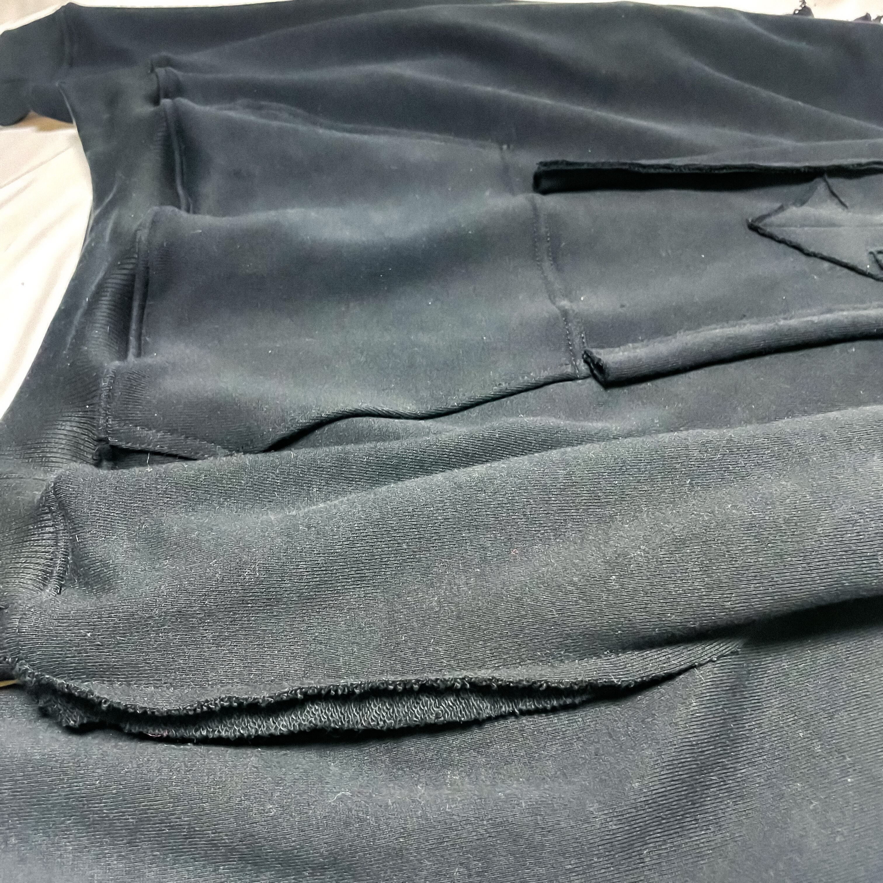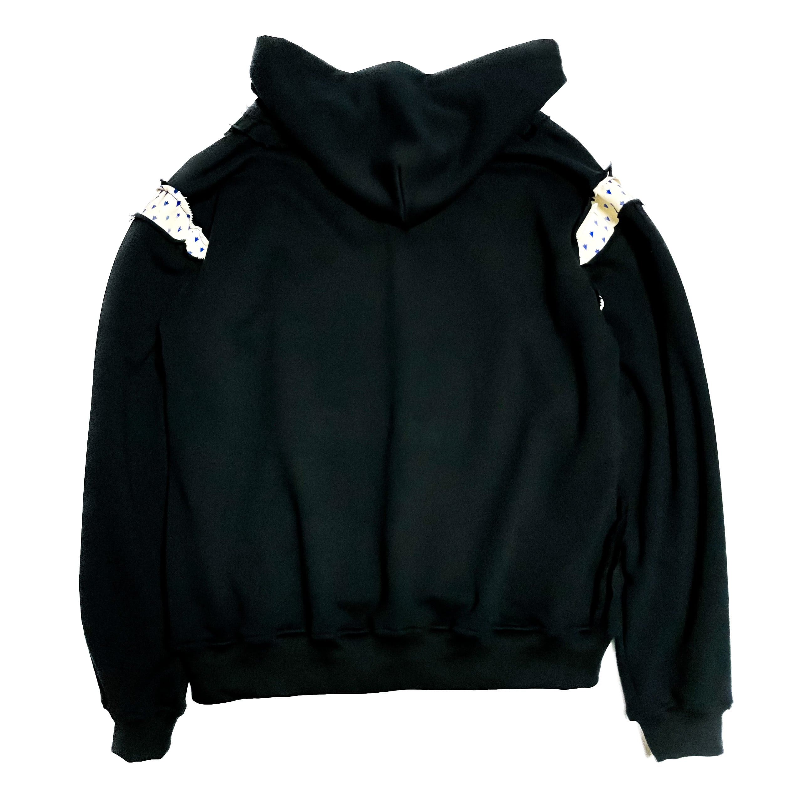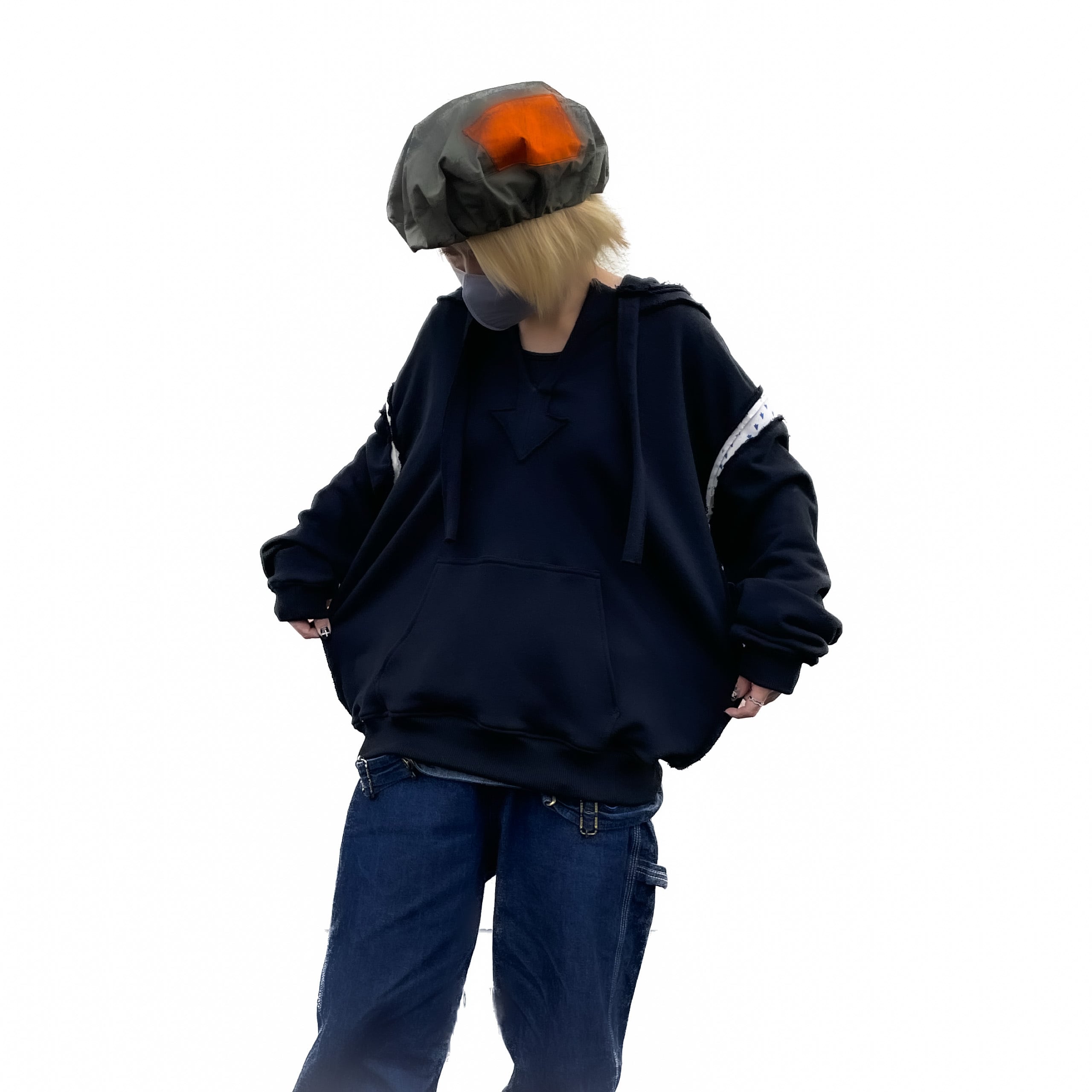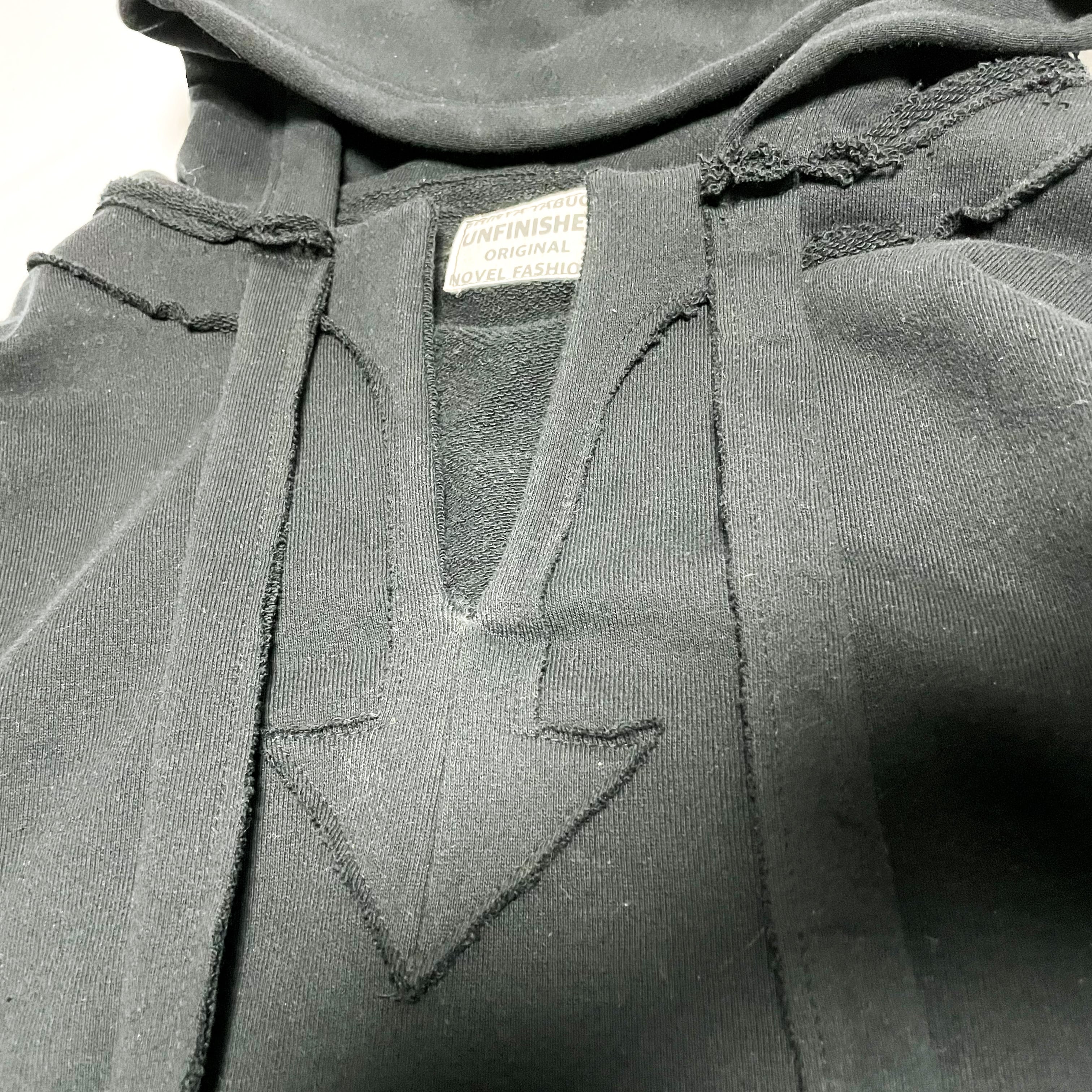 切りっぱなしパーカー2023016 UNFINISHEDのオリジナルテキスタイルの矢印柄を肩部分に配置。 ワイドシルエットでコーディネートしやすくワイドなパンツやスリムなパンツとの相性が良いです。 【商品詳細】 素材 コットン100% 【サイズ】 肩幅54㎝身幅66㎝着丈69㎝ 【送料】 購入金額に関わらず送料無料