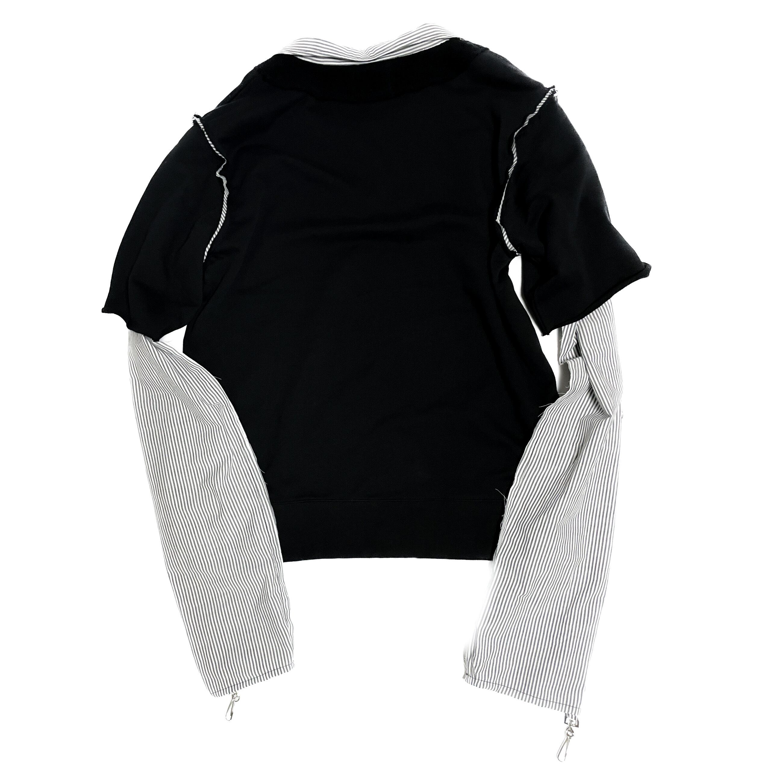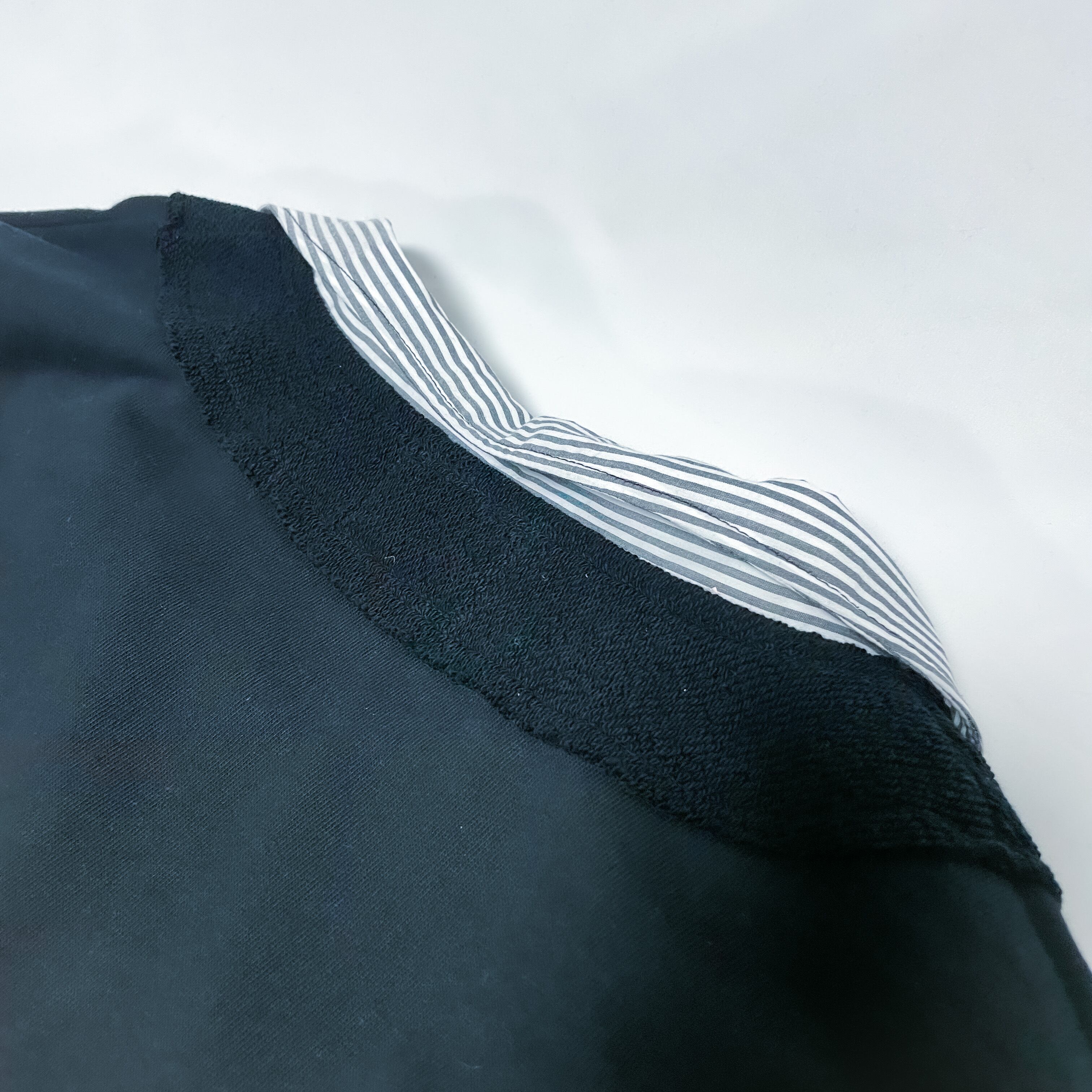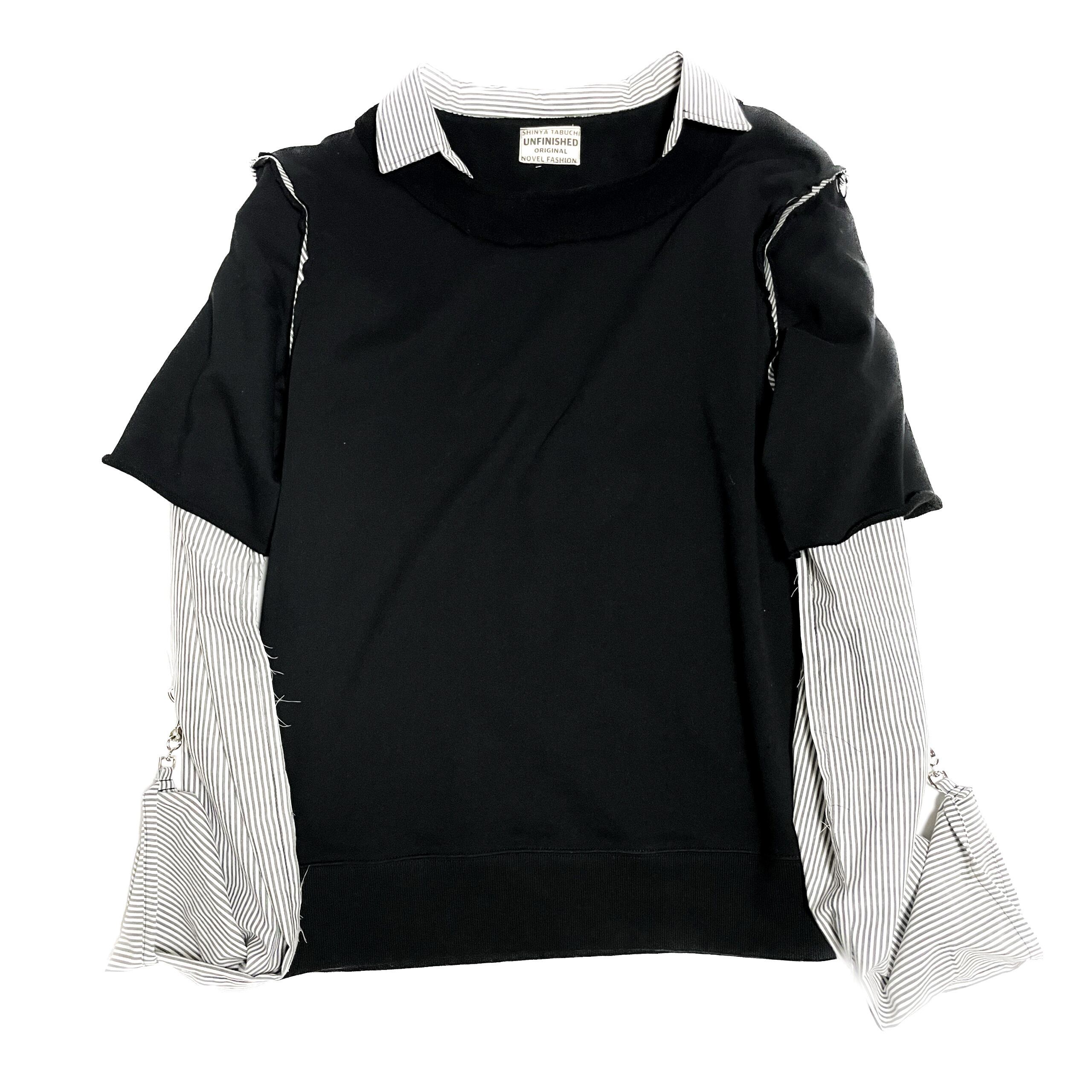 UNFINISHEDレイヤードガーゼシャツトレーナー2023022 トレーナーとガーゼシャツをドッキング。 アナーキーシャツの様なストライプ生地で製作いたしました。 ストライプ生地は肌触りが良くサラッとした生地感です。 【サイズ】 肩幅54㎝ 身幅63㎝ 着丈71㎝ 袖丈88㎝金具に取り付けると70㎝肩部分の金具へ取り付けると半袖の様になります。 購入金額に関わらず送料無料。