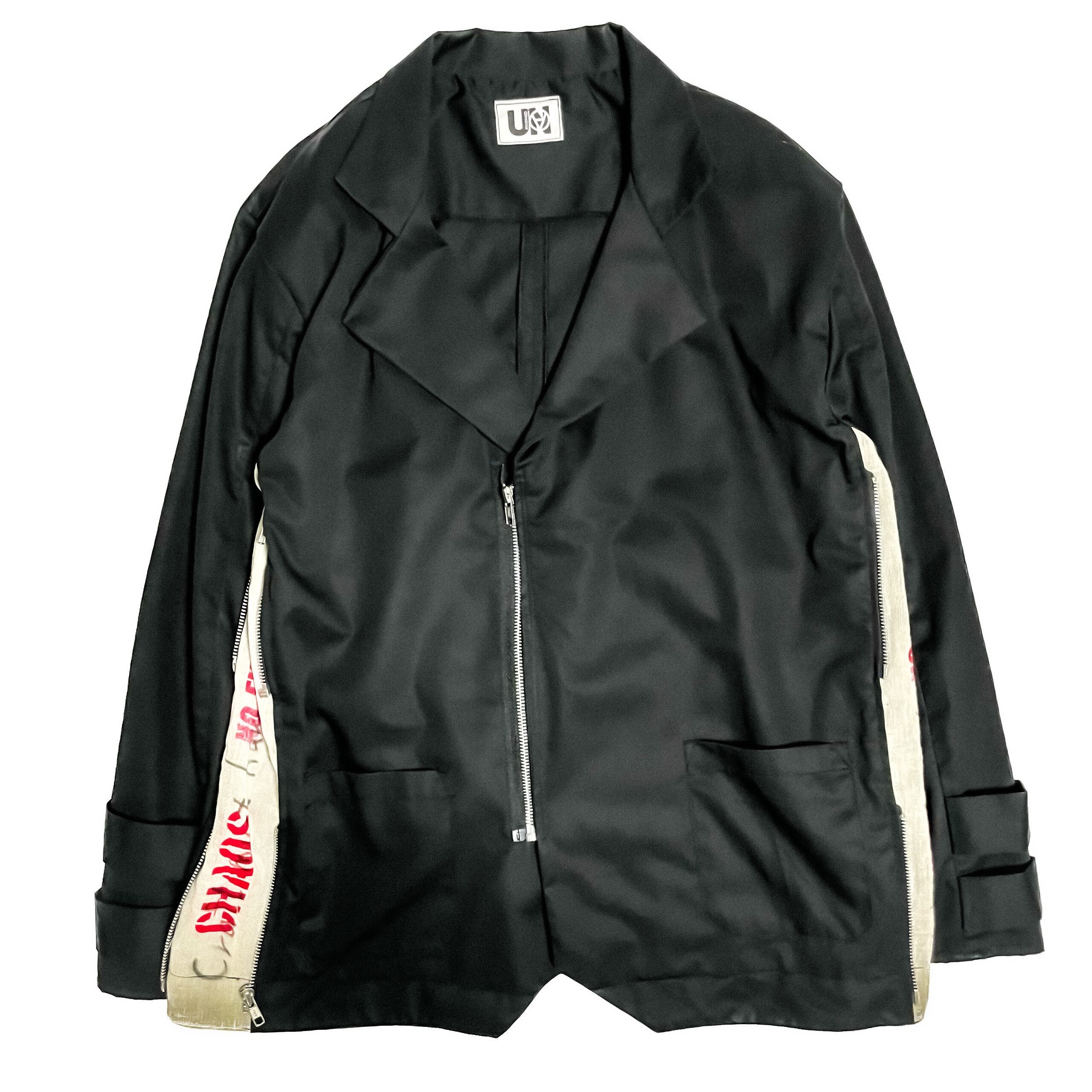 カチッとしたジャケットにボンテージパンツの要素を組み合わせました。