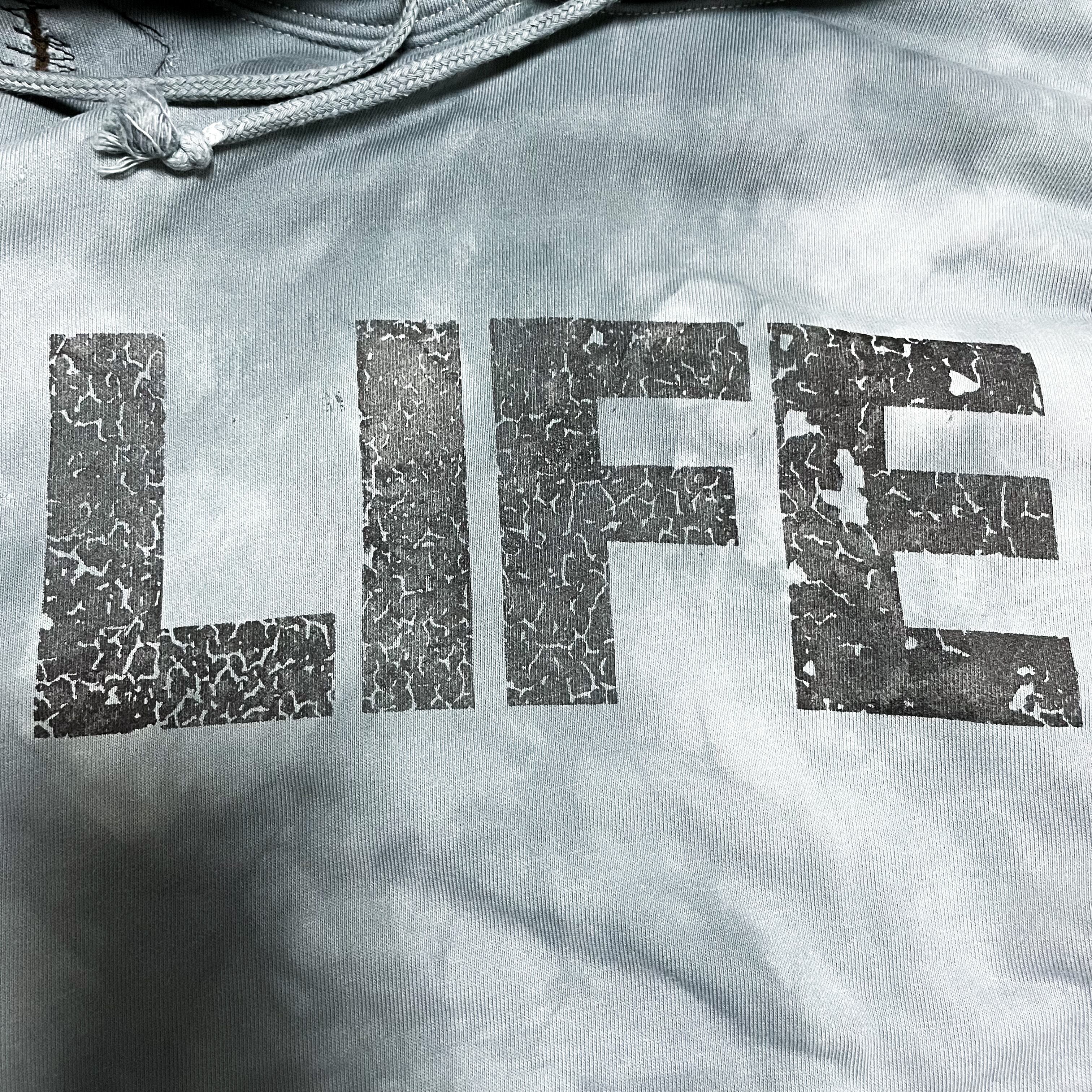 LIFEを題材とした染色、ダメージ、切り替えを施したビッグサイズのパーカーです。