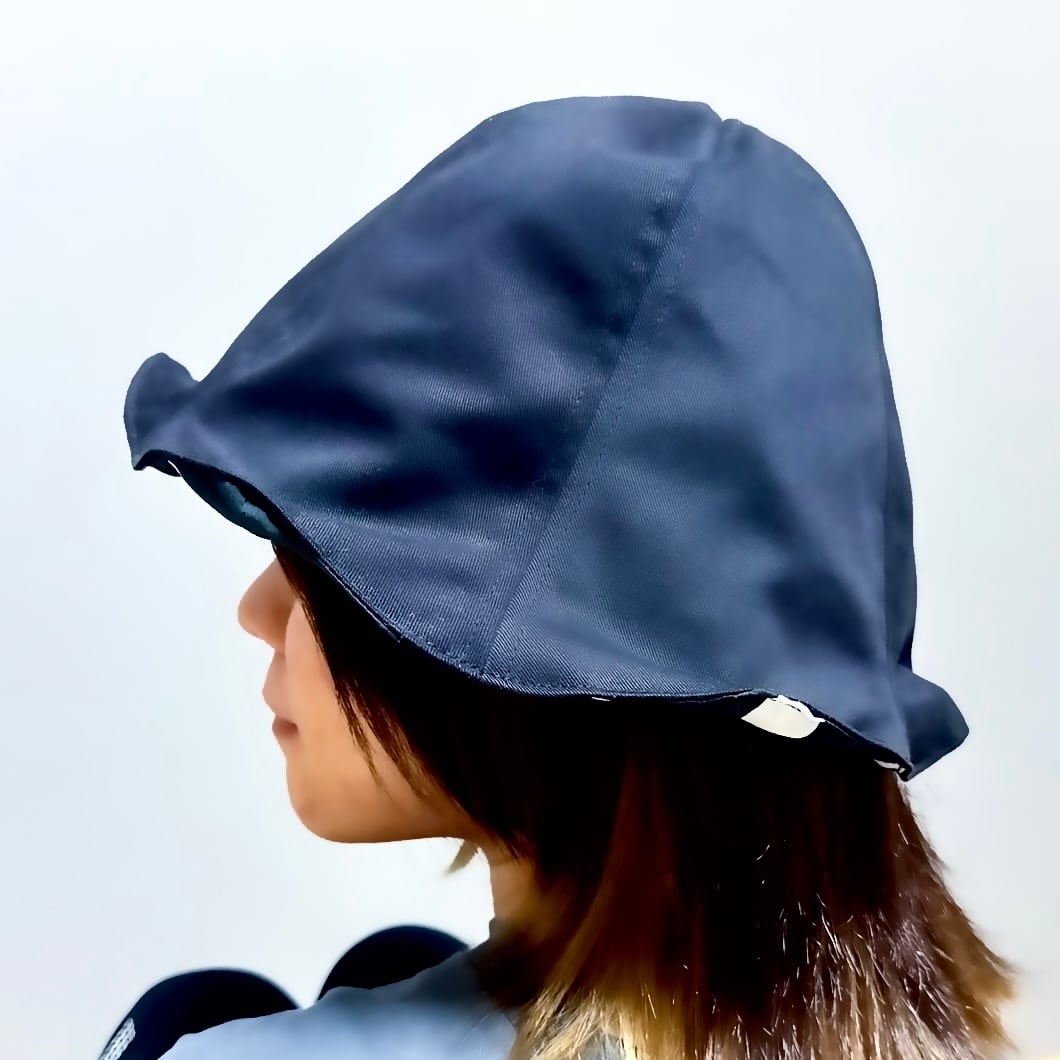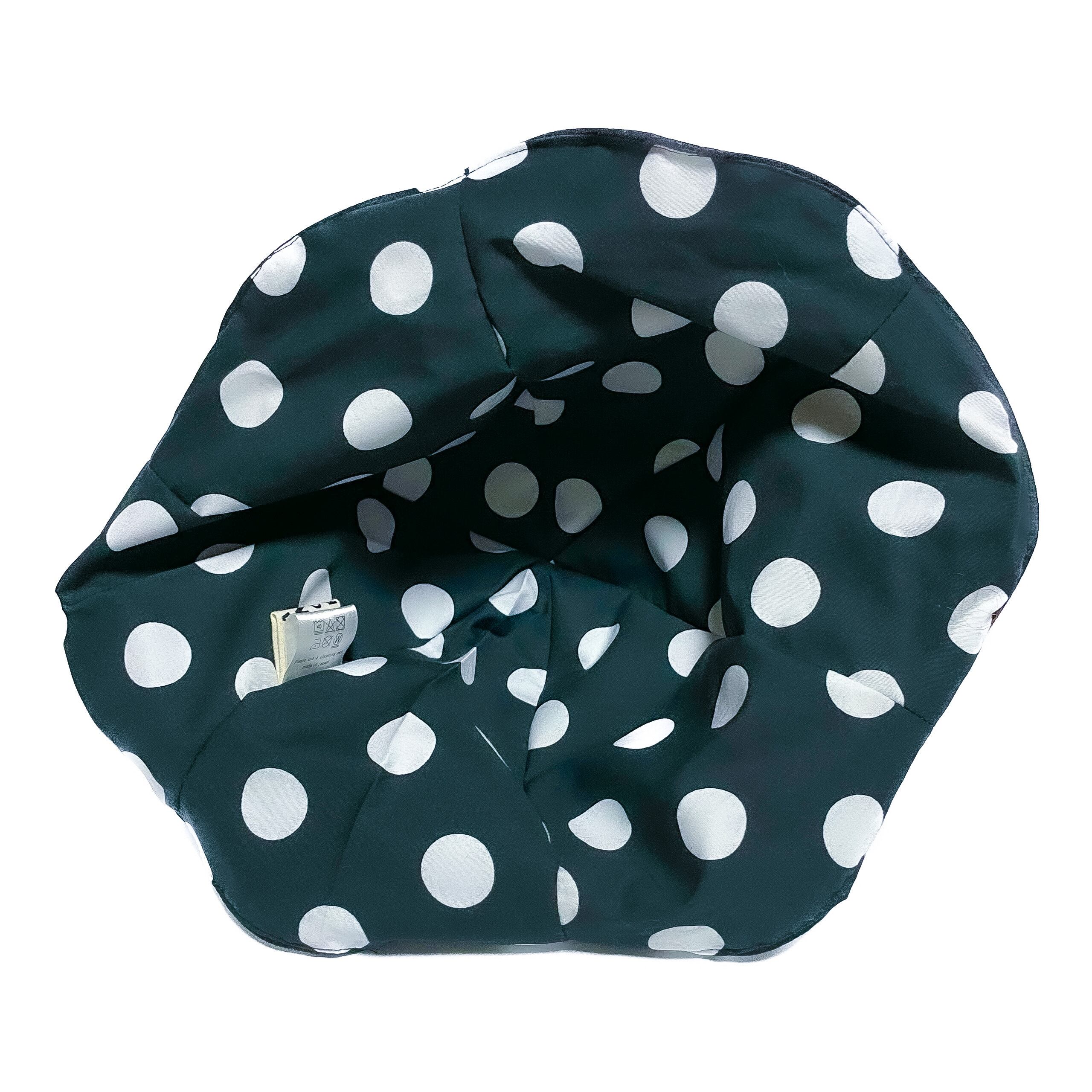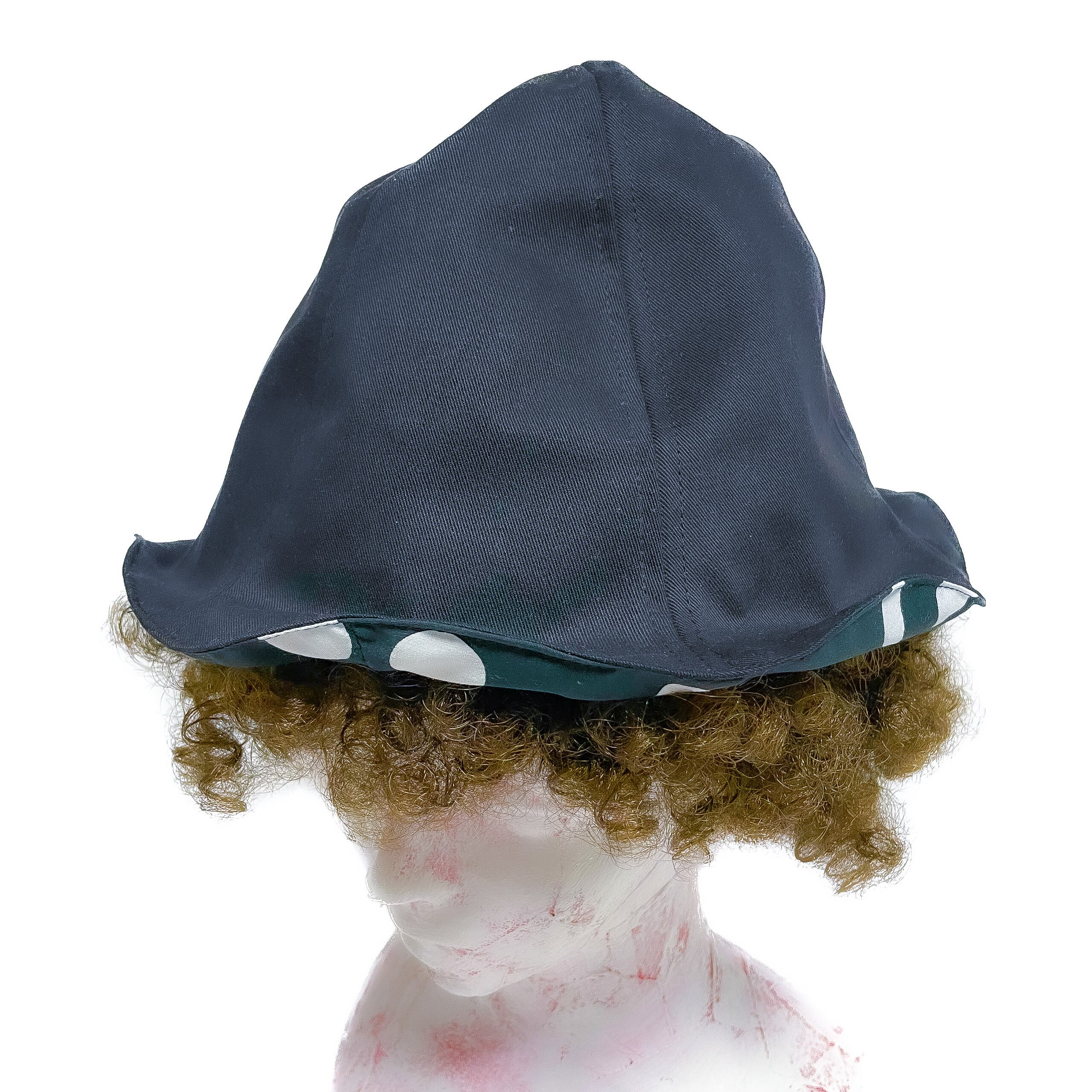 UNFINISHEDブラック×ドットチューリップハット2023054 ブラック×ドット柄をベースに製作したチューリップハット。 ツバ部分がヒラヒラになるよう工夫した特殊な縫製を施しました。 【size】 外径 ツバの端から端まで約32.5㎝程度。 かぶる部分 約20㎝ 高さ21㎝ 購入金額に関わらず送料無料。