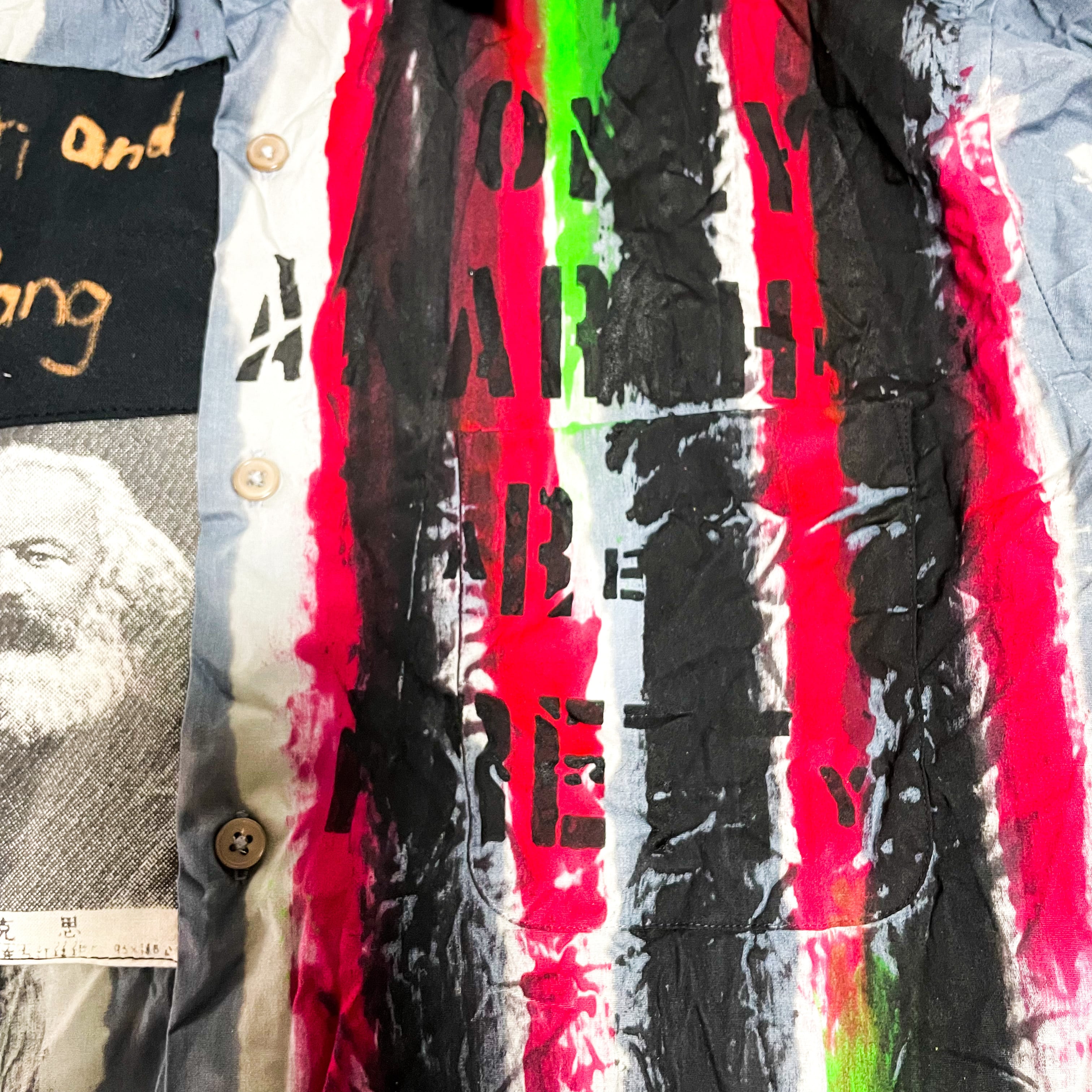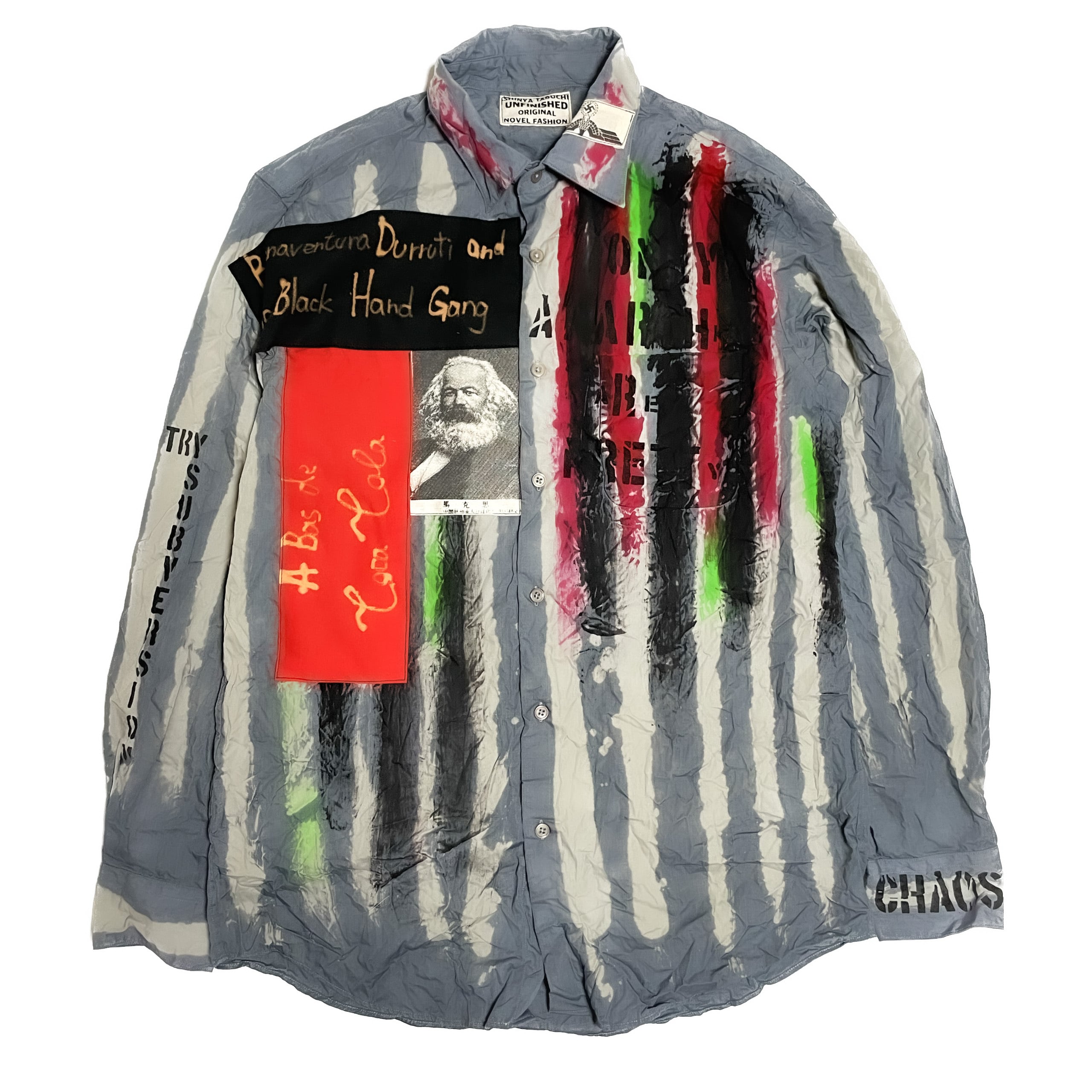 UNFINISHEDアナーキーシャツ2023010 こちらの商品は、70年代当時セックス・ピストルズのシドヴィシャスや、ジョニーロットンが着ていたアナーキーシャツを再現した一品になります。 【サイズ】 肩幅46㎝ 着丈76㎝ 身幅55㎝ 購入金額に関わらず送料無料。