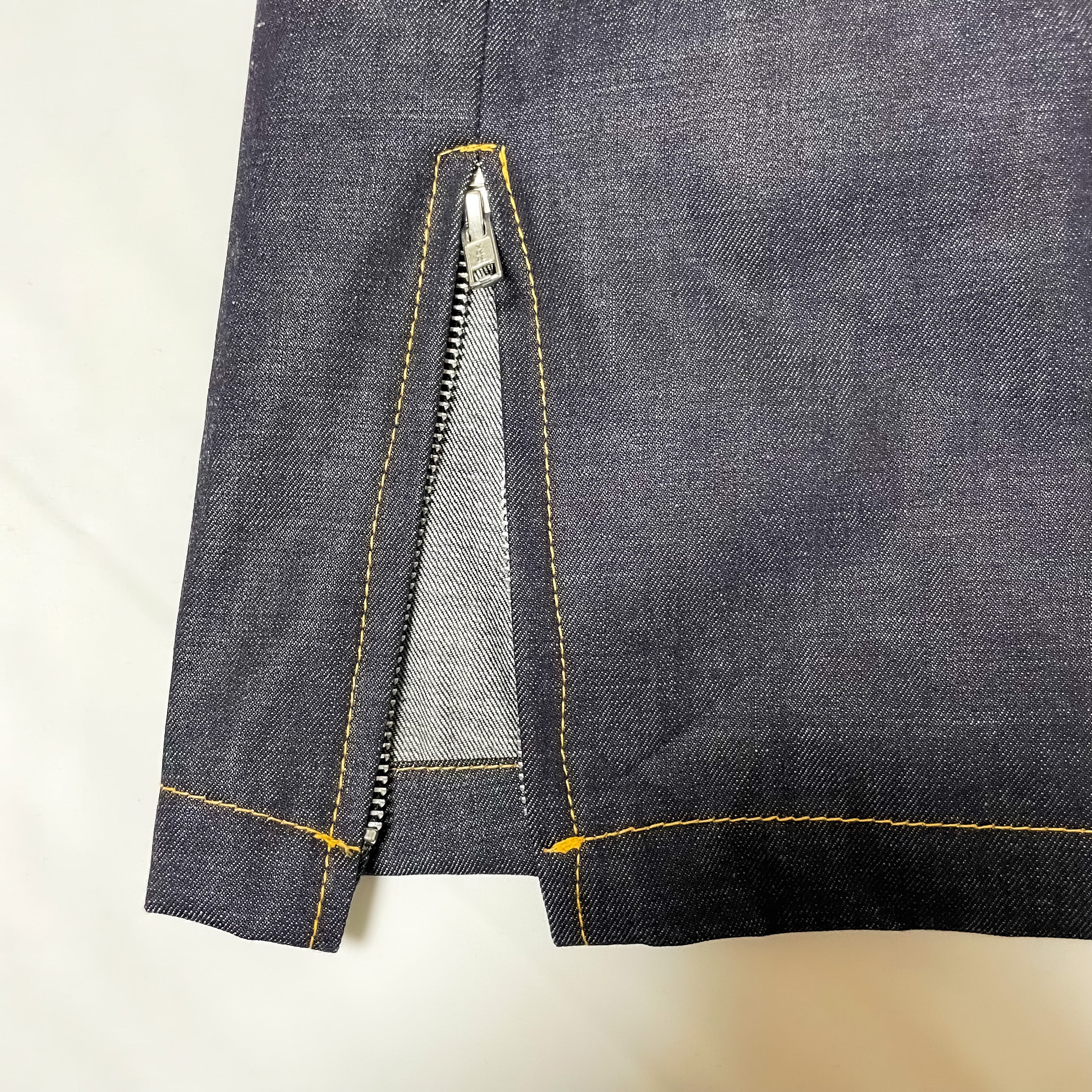 岡山デニムをベースにイエローステッチ、ファスナーを施したハーフパンツ。