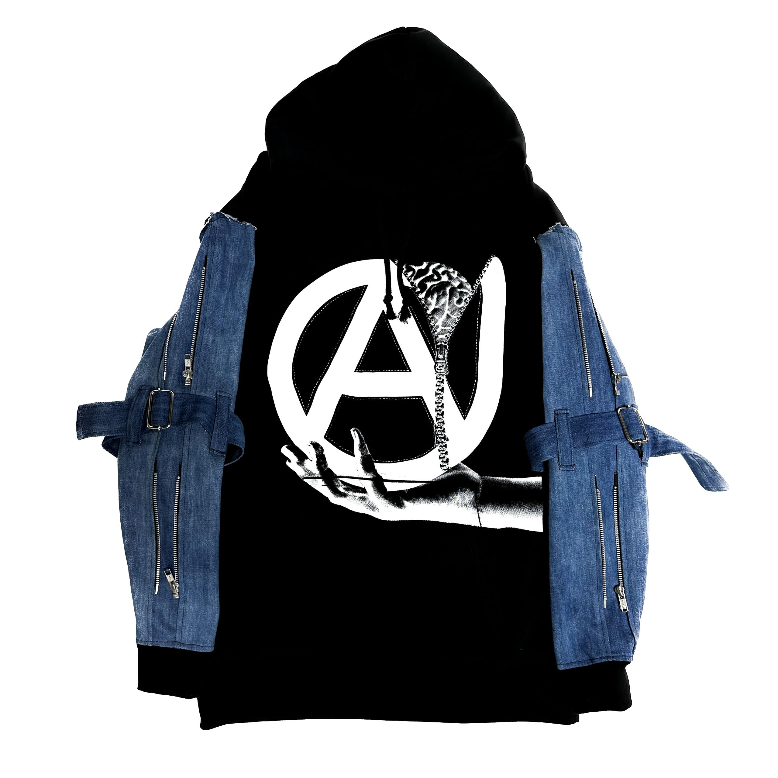 UNFINISHED 切り替えボンテージパーカー2023079 アナーキーマークをモチーフにしたグラフィック。 ダメージデニムとトレーナー生地の切り替え。 切り替え部は切りっぱなしデザインを採用。 オーバーサイズでコーディネートしやすいサイジングです。 【ボディ色】 black×デニム 【サイズ】 肩幅52㎝ 着丈73㎝ 身幅62㎝ 袖丈57㎝ 【送料】 購入金額に関わらず送料無料。