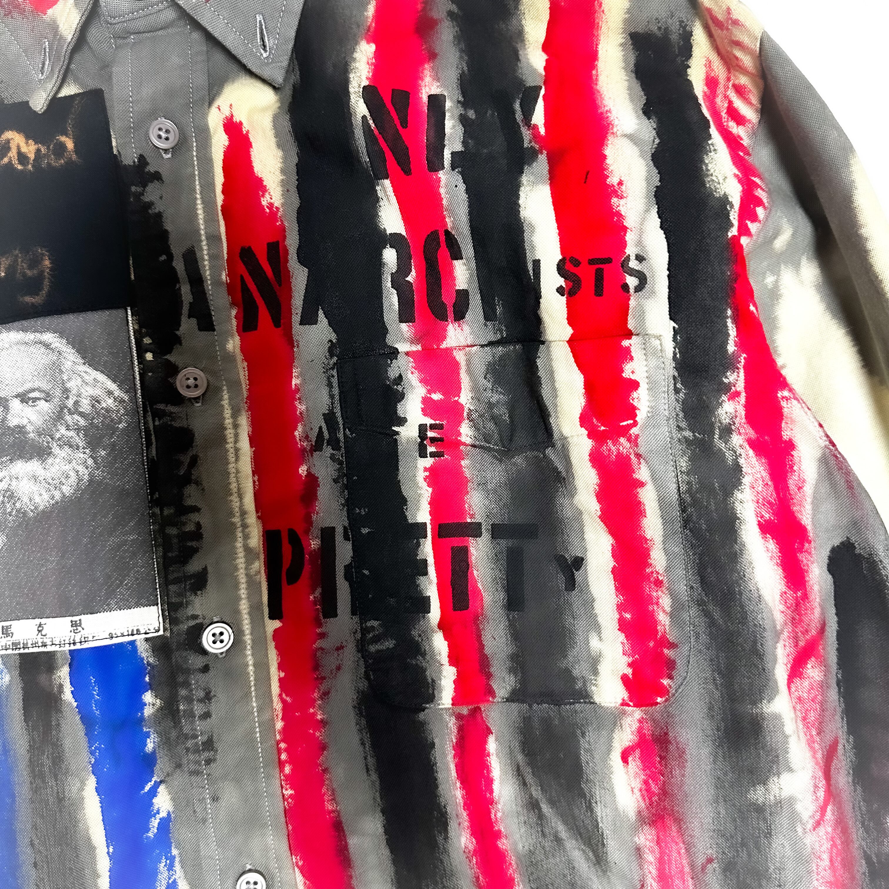 UNFINISHEDアナーキーシャツ2023014 こちらの商品は、70年代当時セックス・ピストルズのシドヴィシャスや、ジョニーロットンが着ていたアナーキーシャツを再現した一品になります。 【サイズ】 肩幅50㎝ 着丈76㎝ 身幅57㎝ 袖丈60㎝ 購入金額に関わらず送料無料。