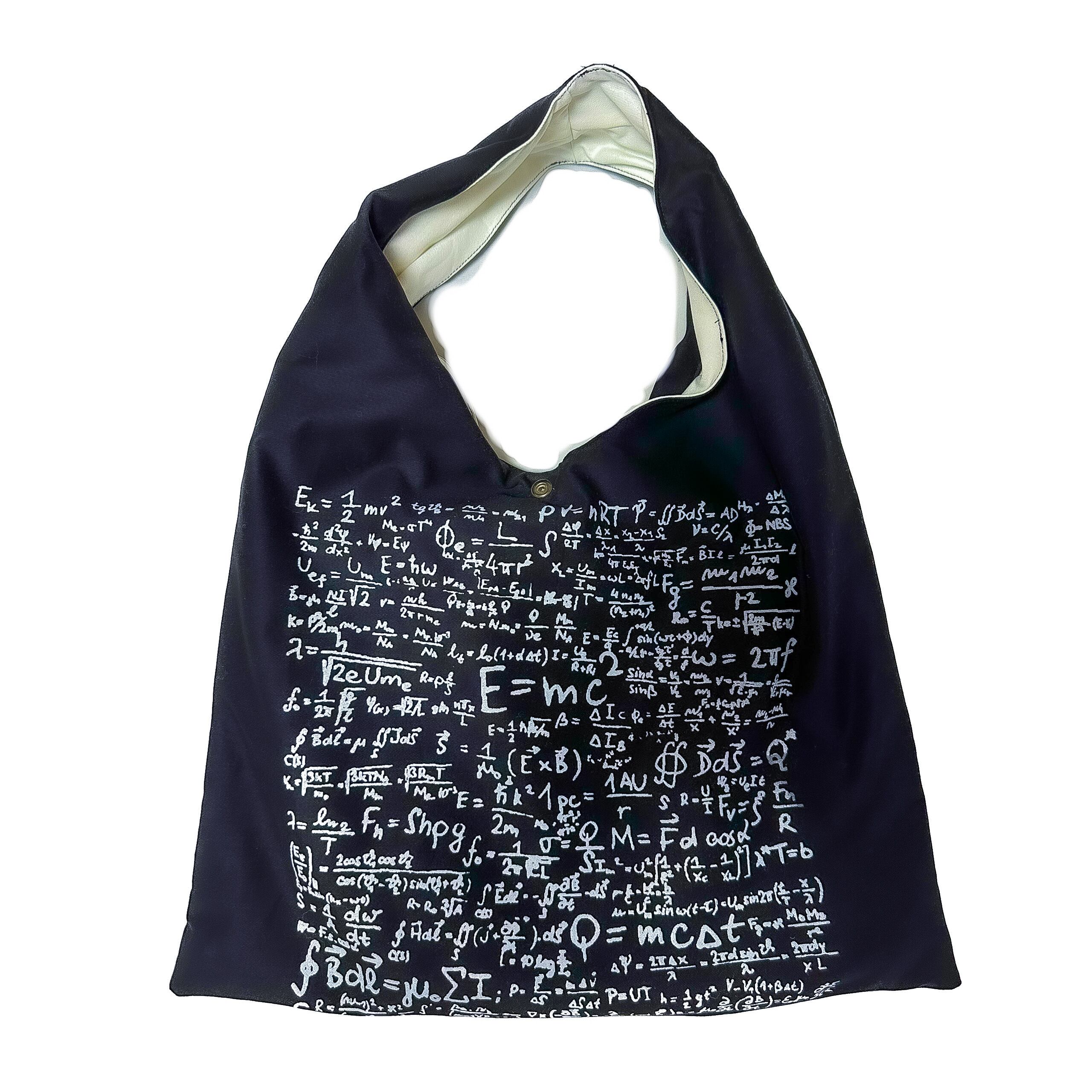 UNFINISHED TOTE BAG2023083 白と黒のモノトーンを採用。 特殊相対性理論とブラックホールを表す図をシルクスクリーンプリントしました。 不明な点などはコメント欄よりお問合せくださいませ。 【サイズ】 肩掛け上部から側面 約60cm バッグ内側寸法 縦35cm横47㎝ 【送料】 購入金額に関わらず送料無料。