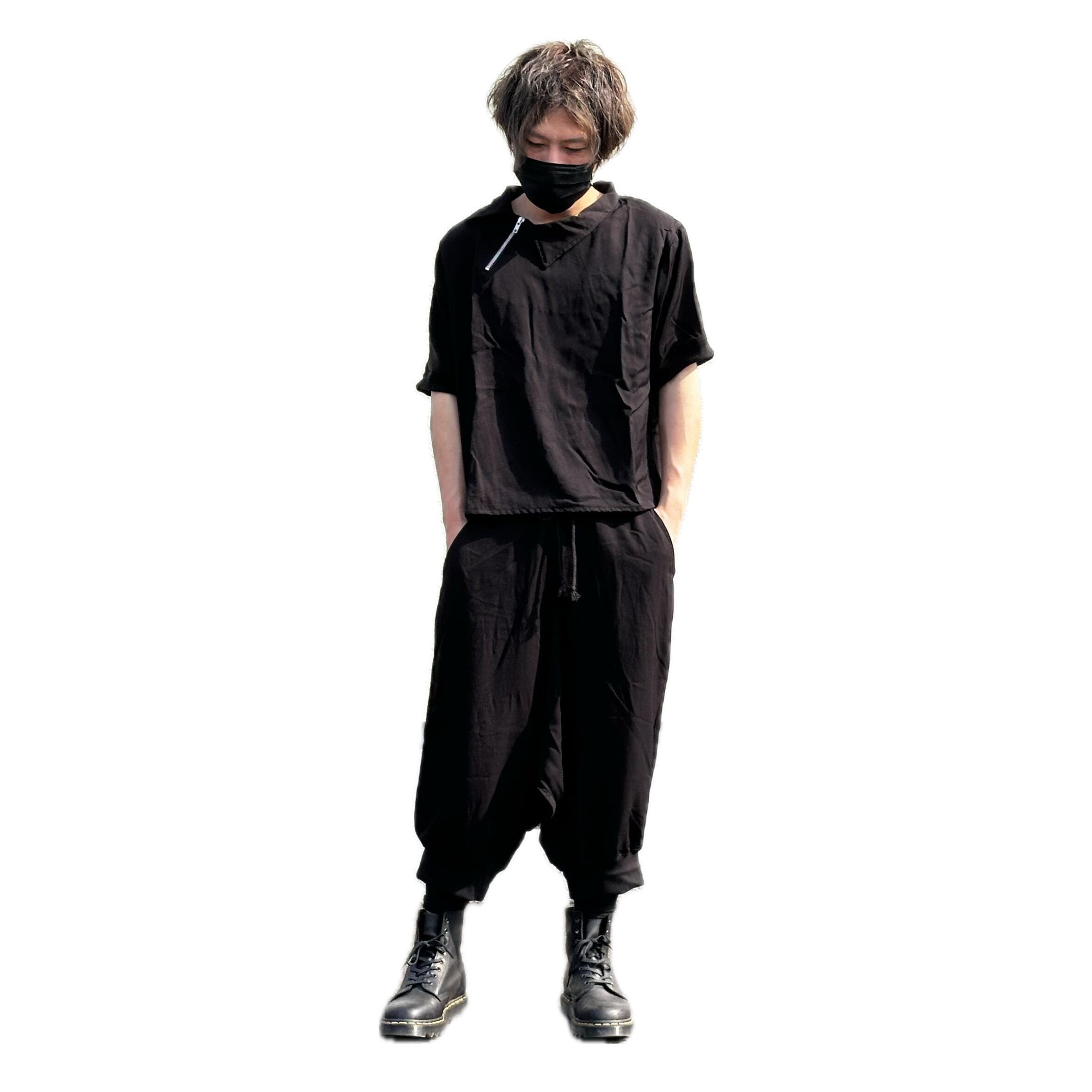サラッとした肌触りの良い生地をベースに片面ドルマンスリーブのアシンメトリートップスを作成しました。