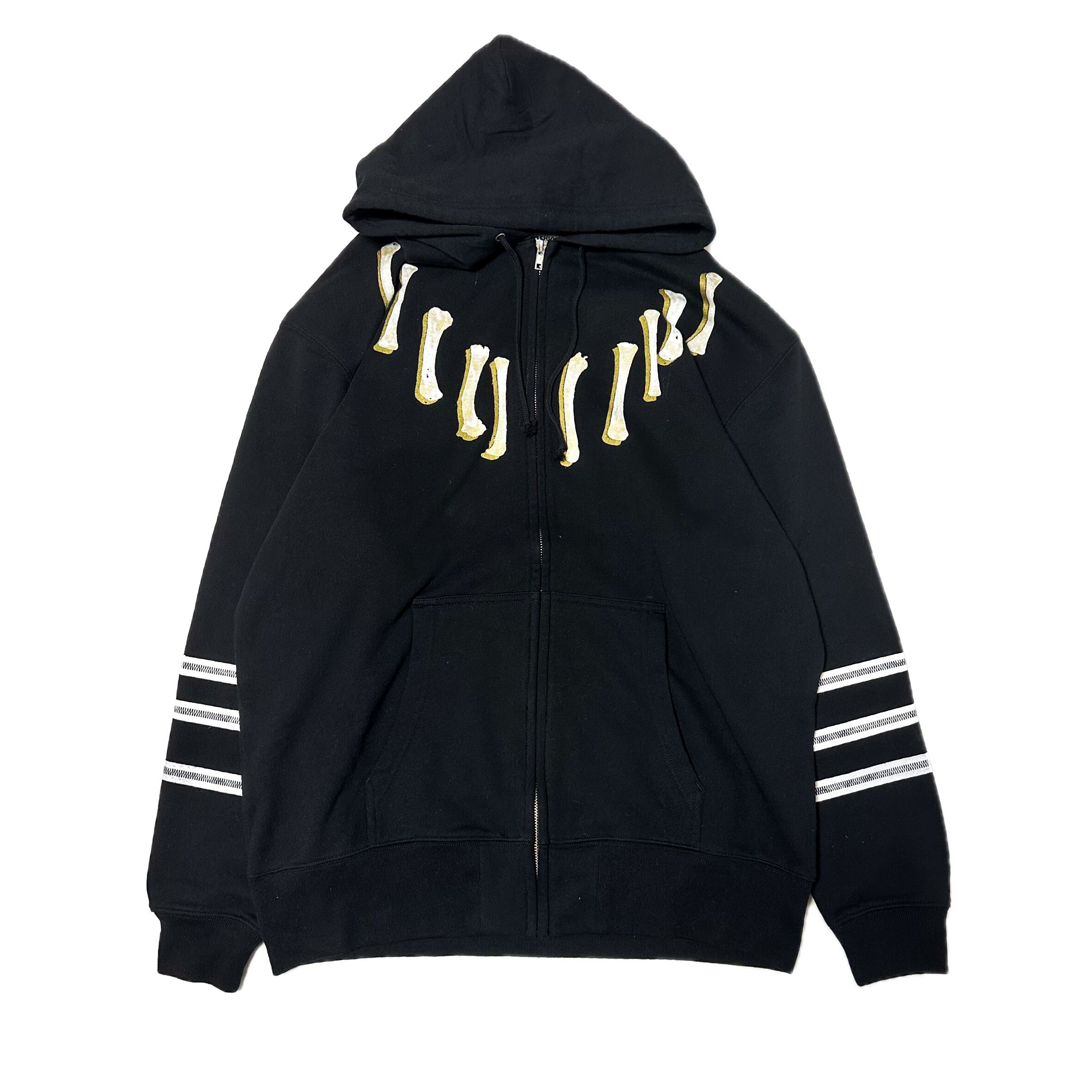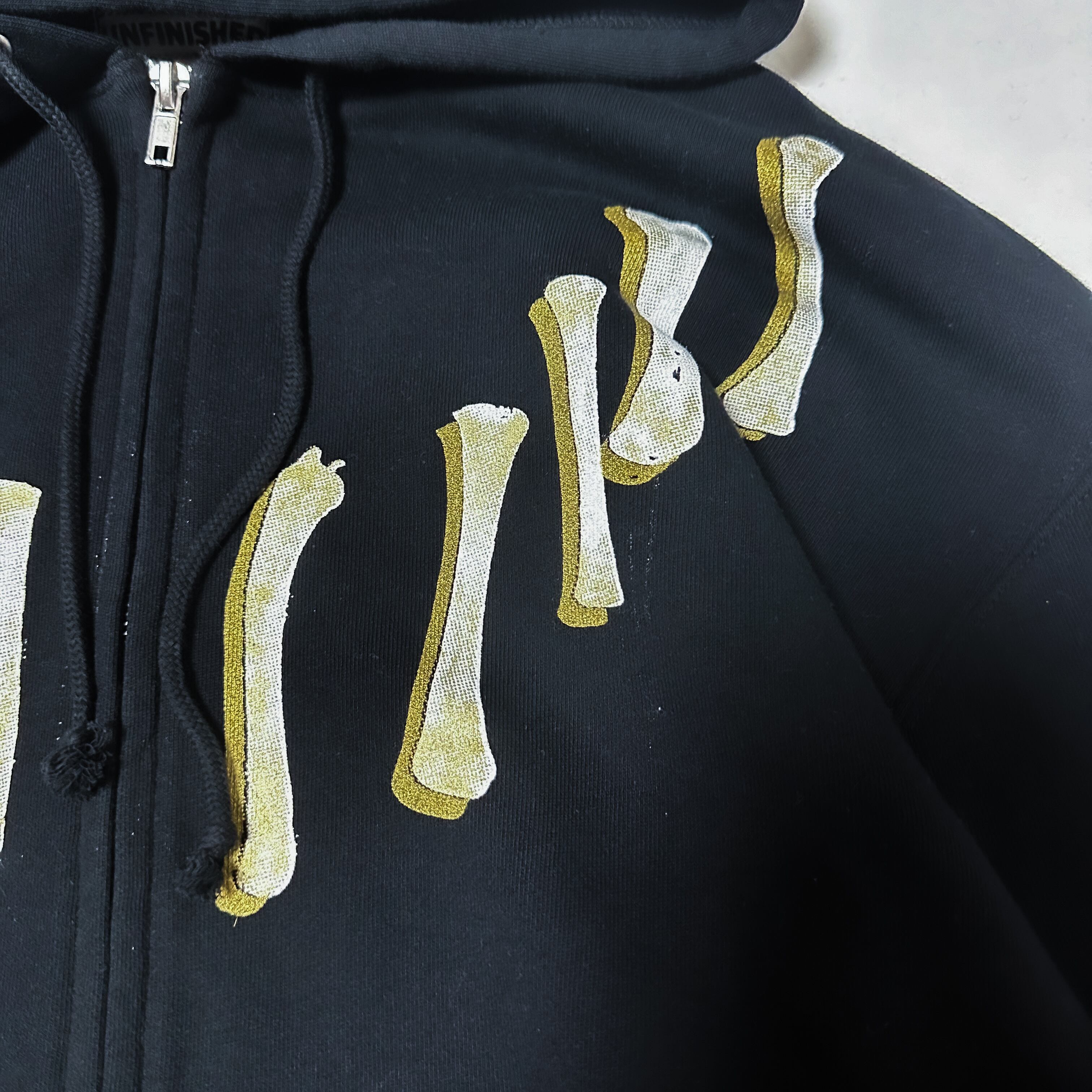 UNFINISHEDBONEパーカー24047 ゆったりめのボディに骨やジッププリントを施したパーカー。 ブラックボディにホワイト調のプリントが引き立つパーカーです。 シルクスクリーンによる手刷りプリントで製作されており味のある作品に仕上がりました。 【SIZE】 肩幅57㎝ 身幅63㎝ 着丈68㎝ 【送料】 購入金額に関わらず送料無料。