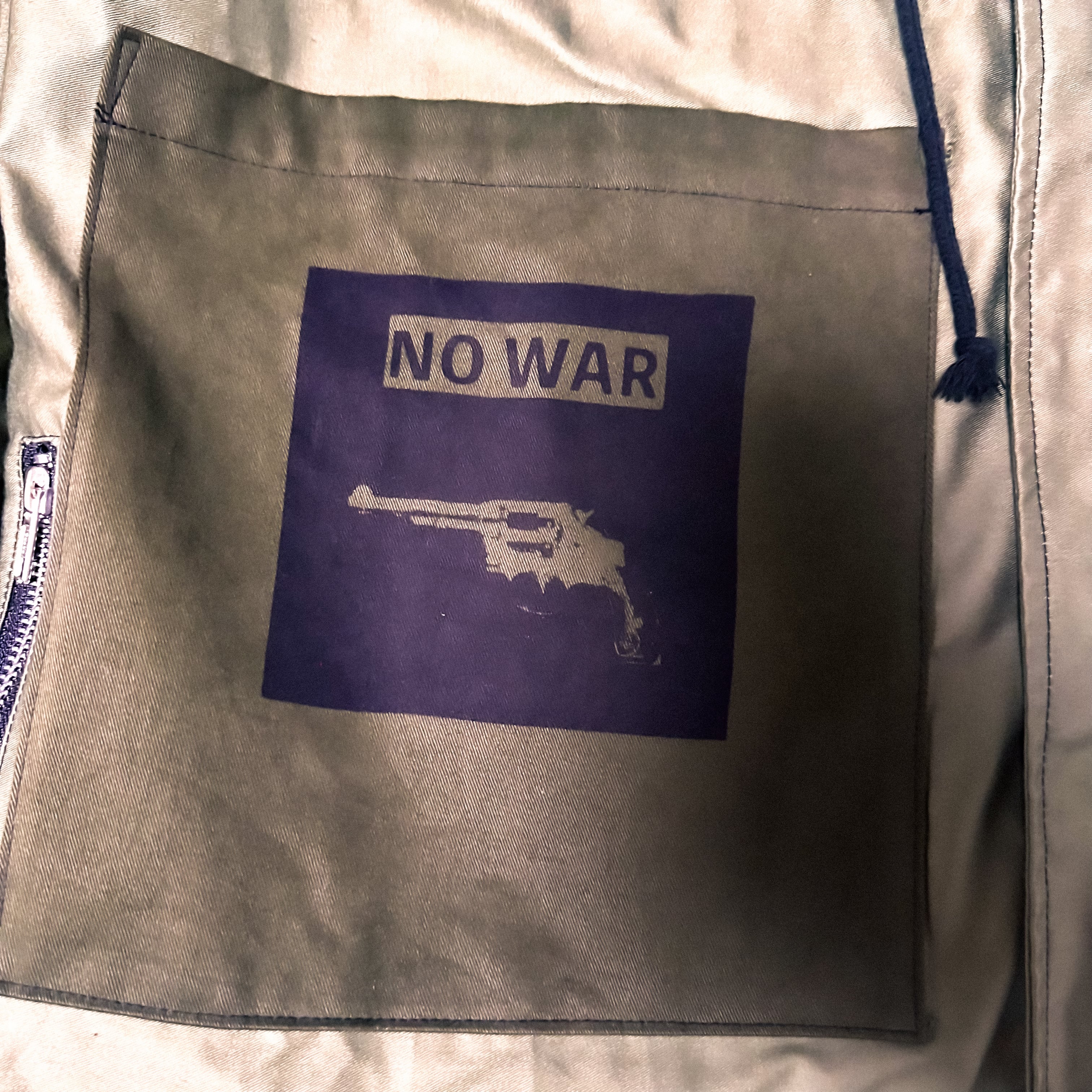 各種プリントには反戦の意味を持たせており背中にはWARを鏡映しにし反戦の意味を持たせています。
