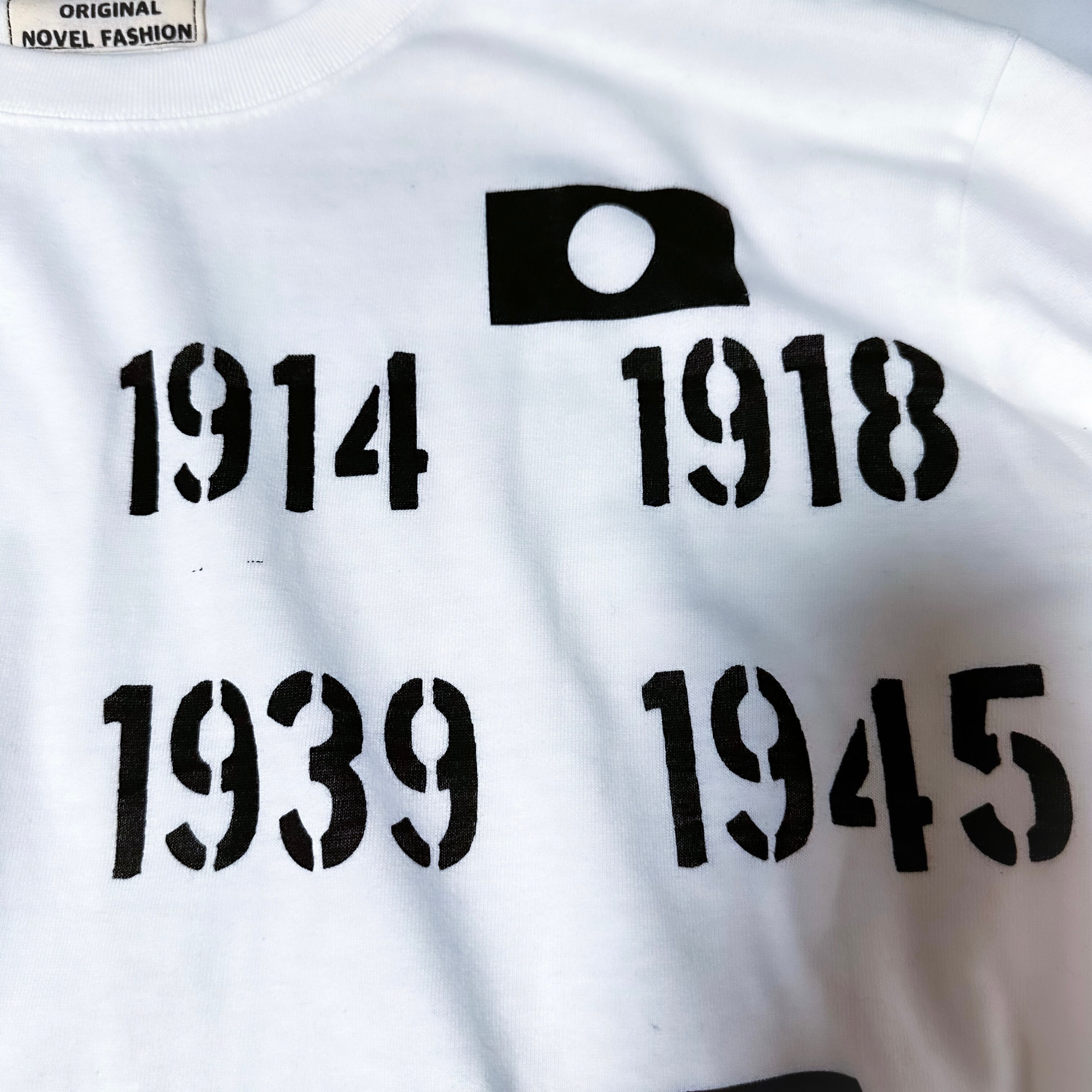 反戦の意味を込めたプリントをランダムに配置したロンT。
