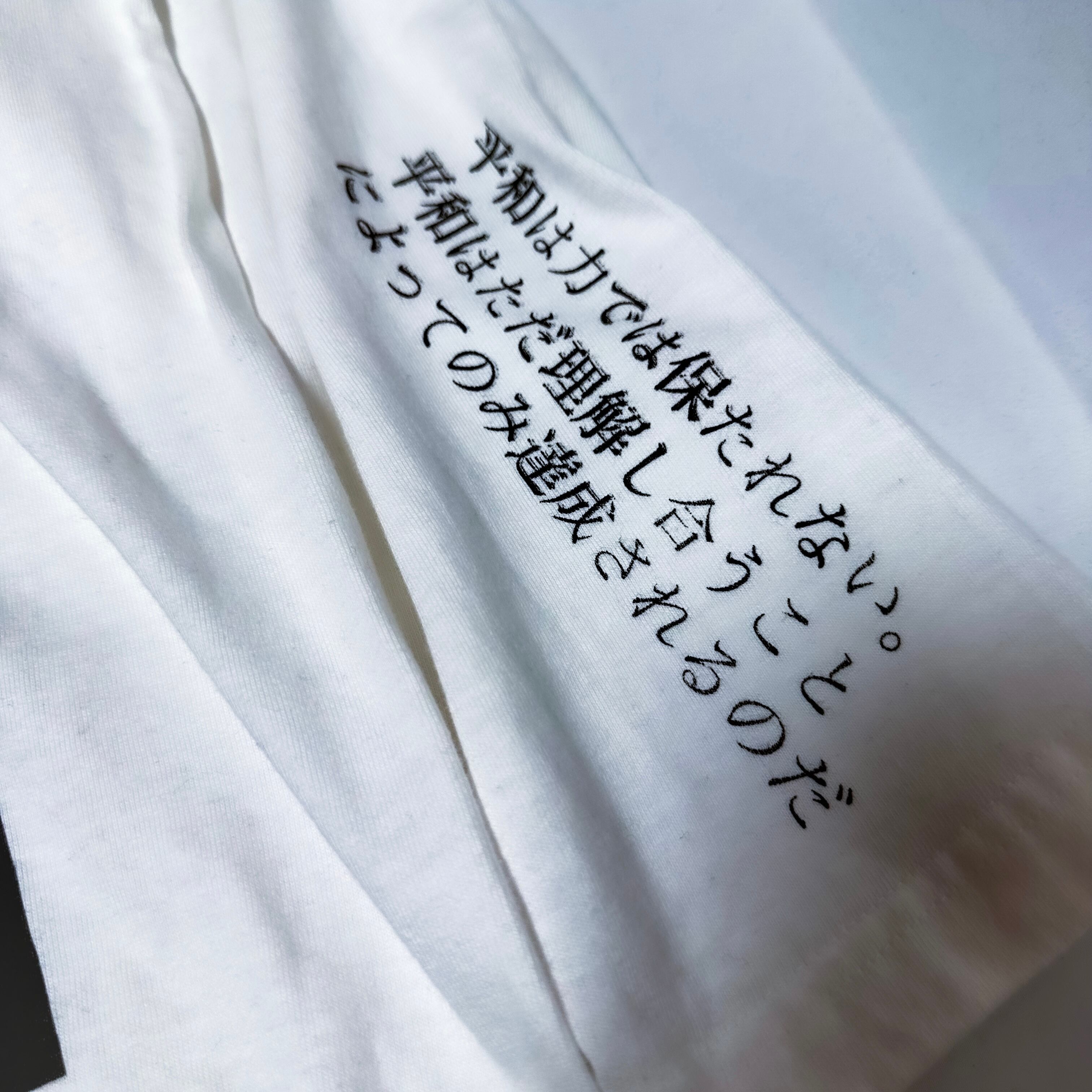 袖口には日本語訳した『平和は力では保たれない。平和はただ理解し合うことによってのみ達成されるのだ』アインシュタインの名言から採用しました。