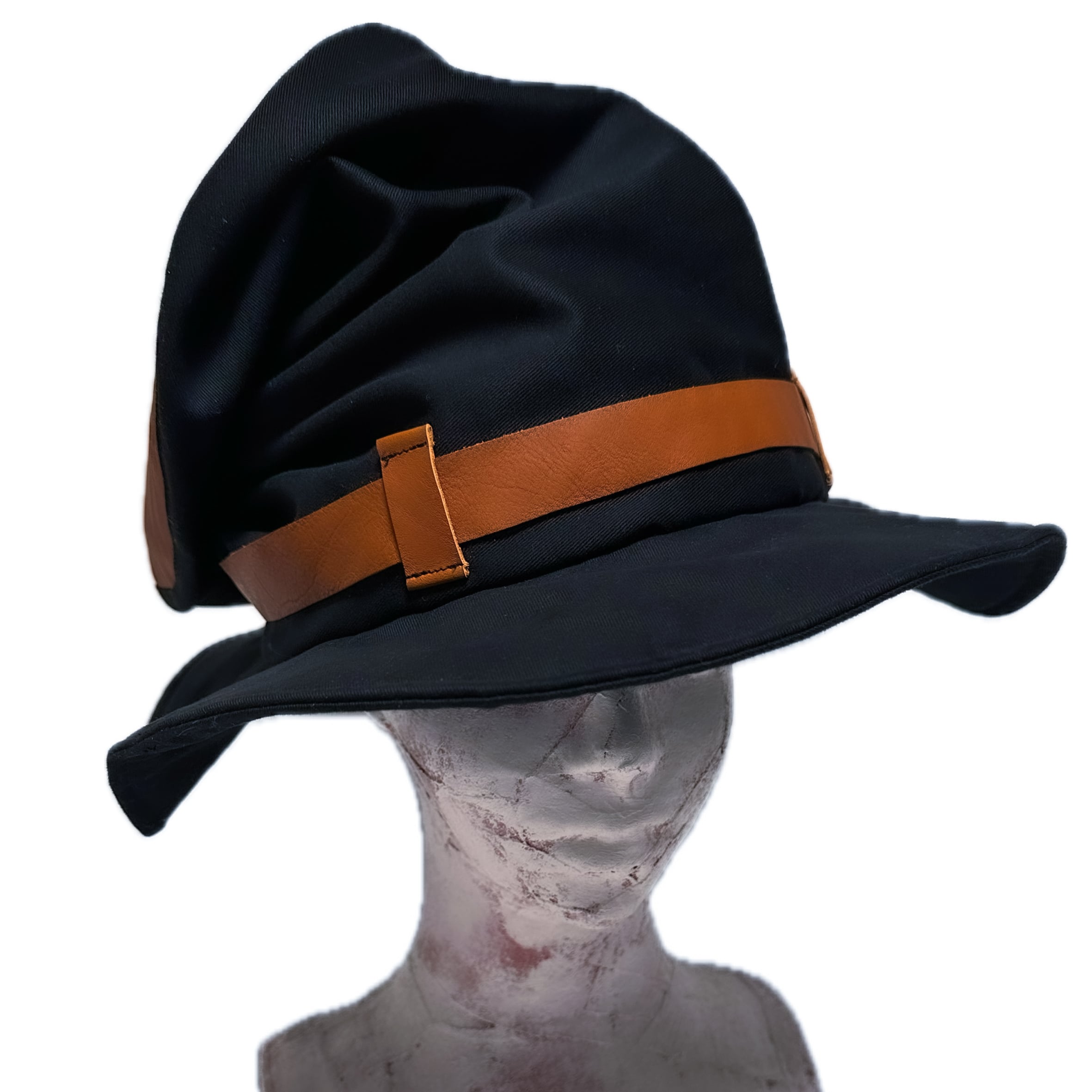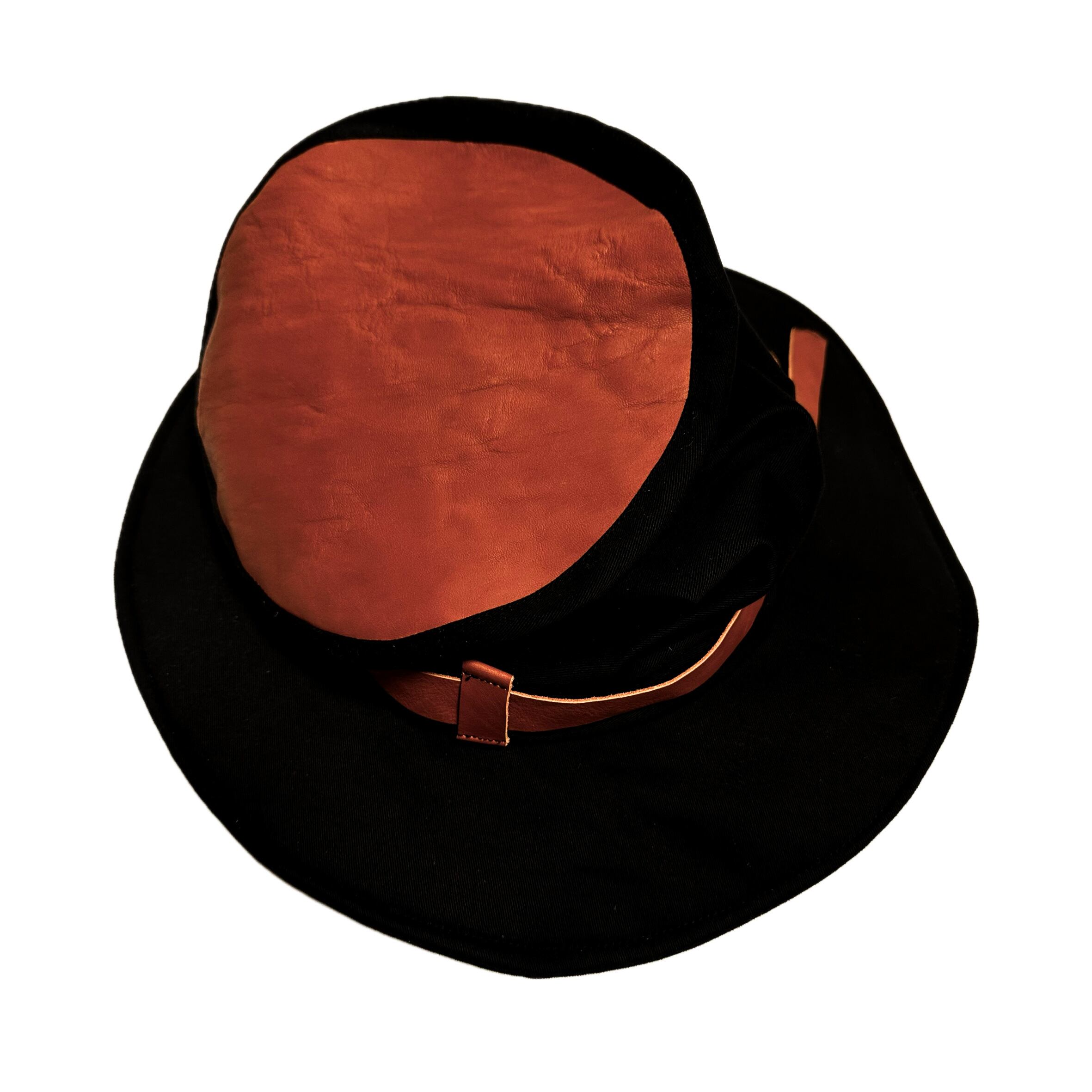 UNFINISHEDロングトップハット24119 ブラウン色の本革とブラックツイル生地をベースに製作しました。 革部分は使うごとに馴染んで味が出ます。 リブ部分は柔らかなニット生地になっており被り心地の良い作りです。 【size】 外径 ツバの端から端まで34㎝程度。 内側リブ部分 直径18~20㎝ 購入金額に関わらず送料無料。
