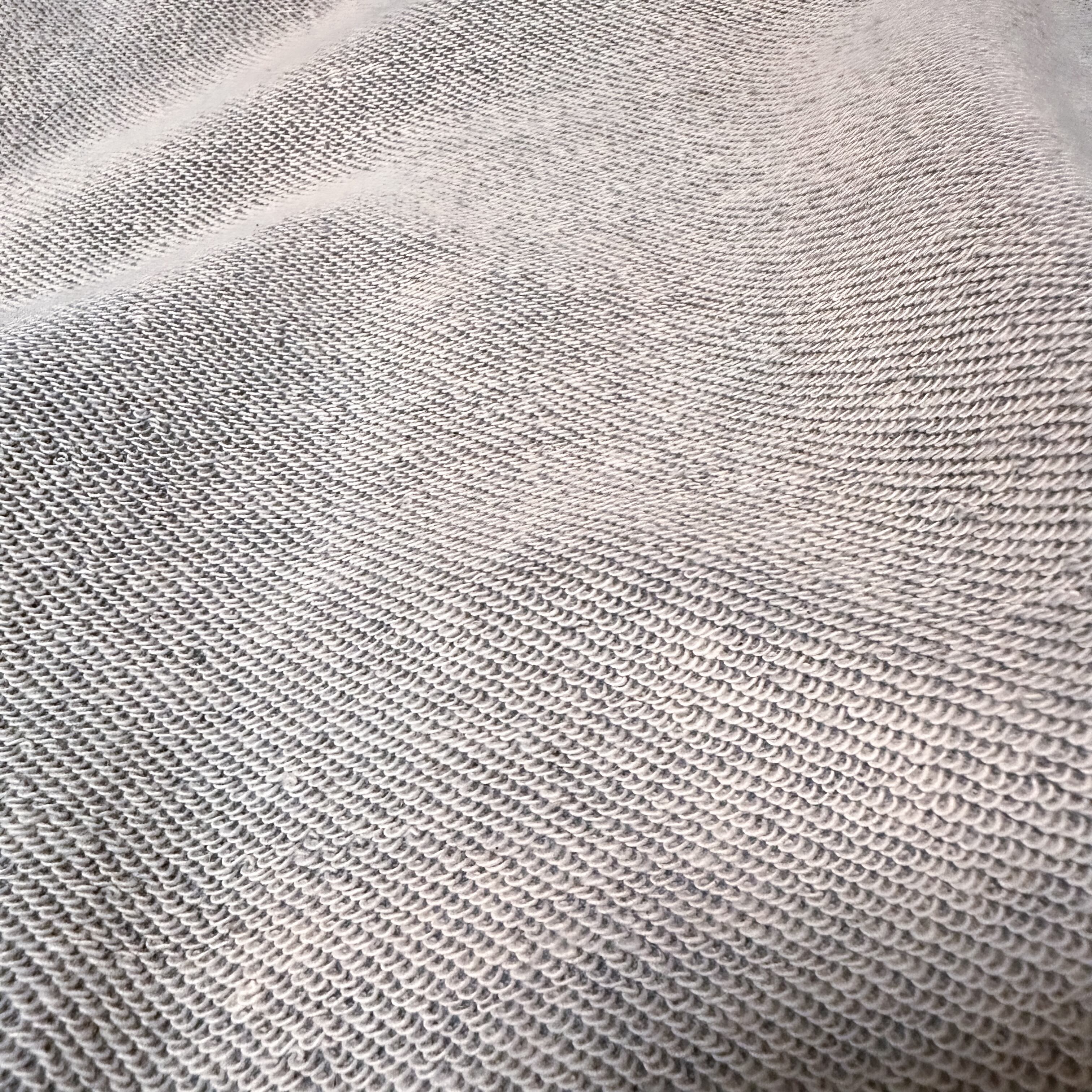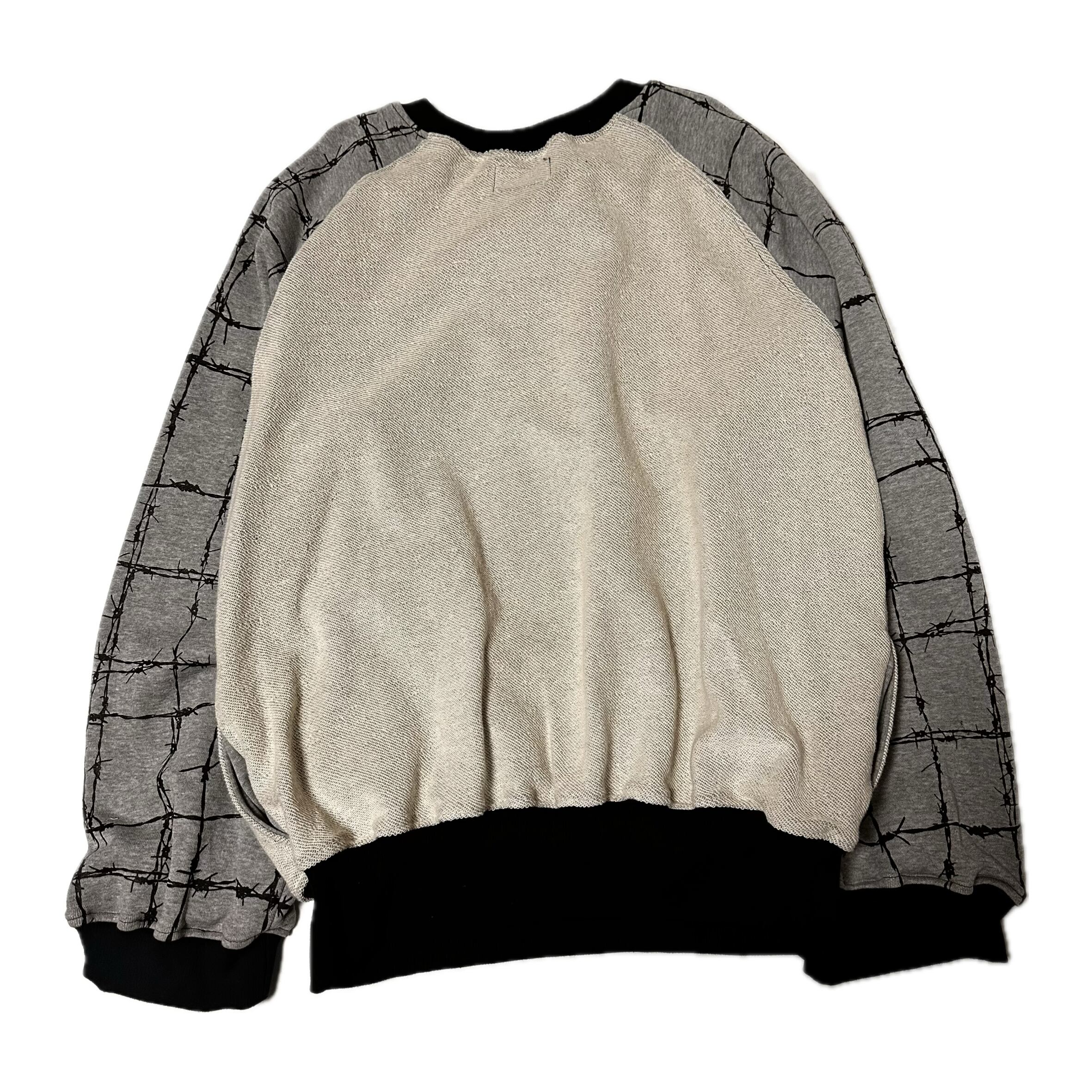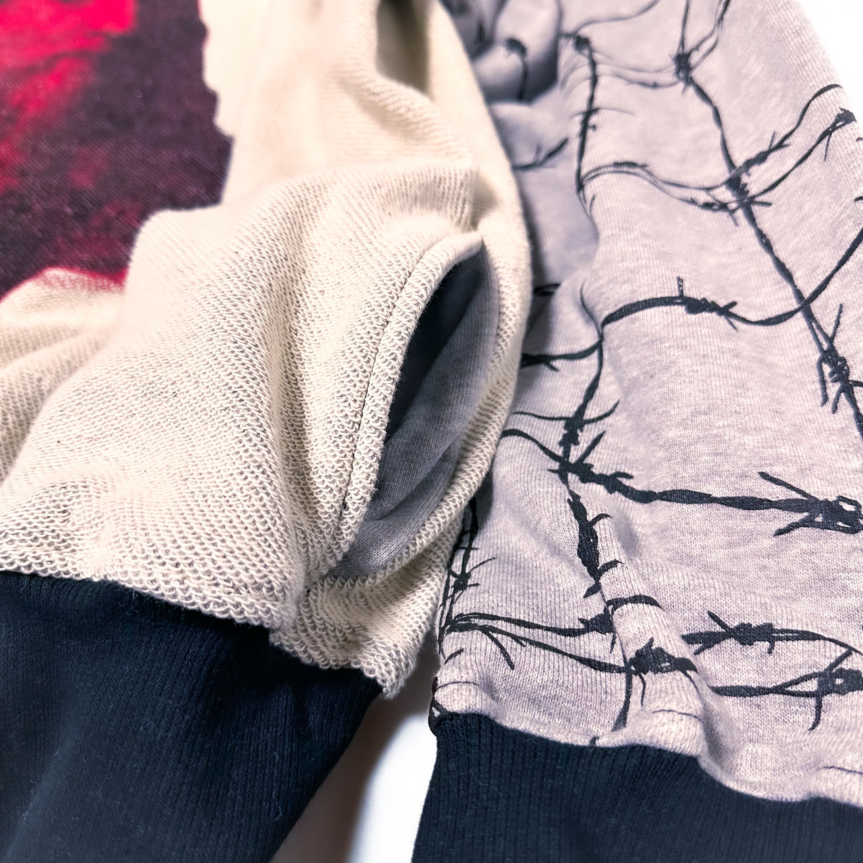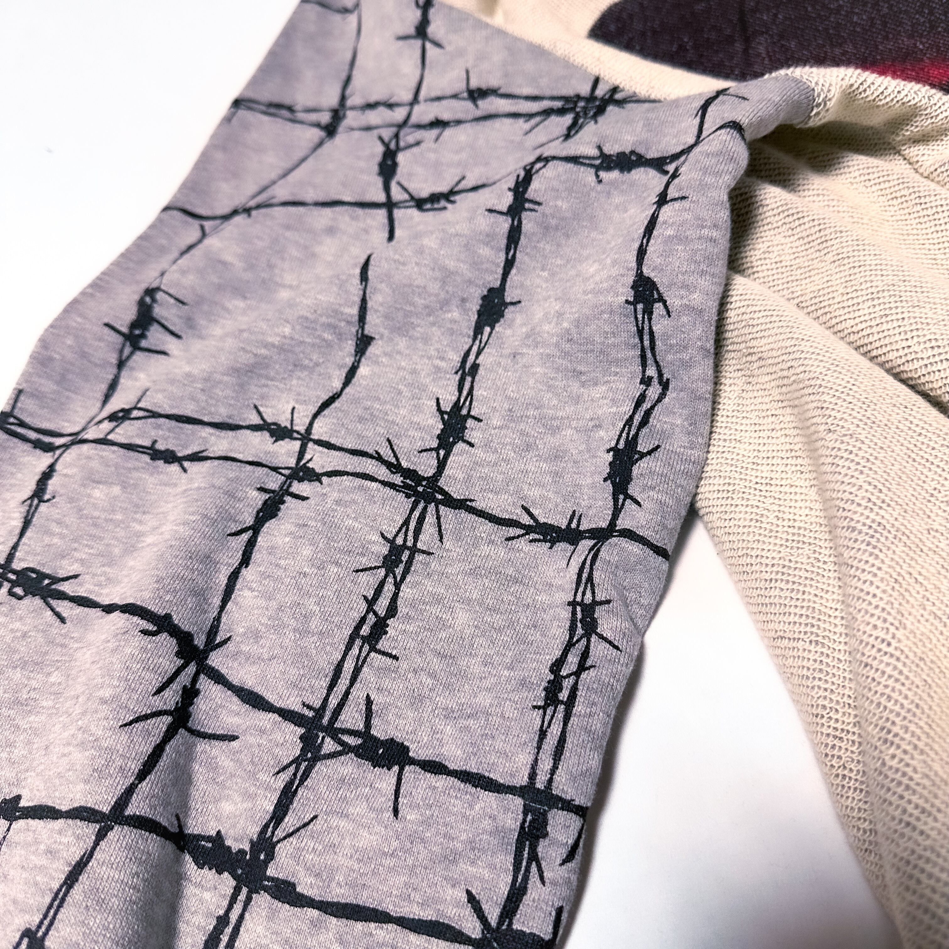 グレー生地を反対にしたパイル生地とシルクスクリーンで印刷したオリジナル有刺鉄線柄の生地をベースに製作しました。