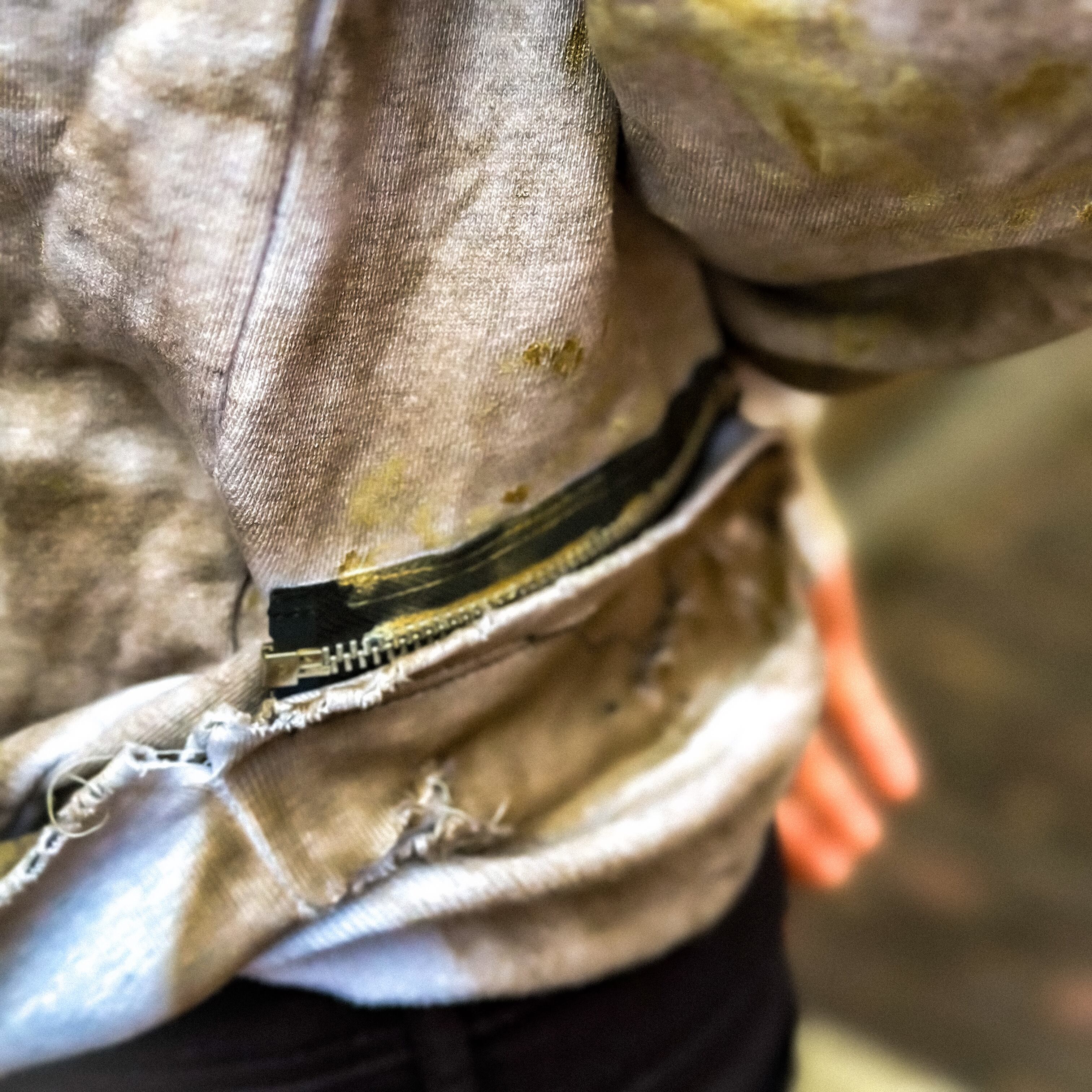 自然環境にさらして洋服に表情を与え、その表情を活かしながら加工を施す手法です。