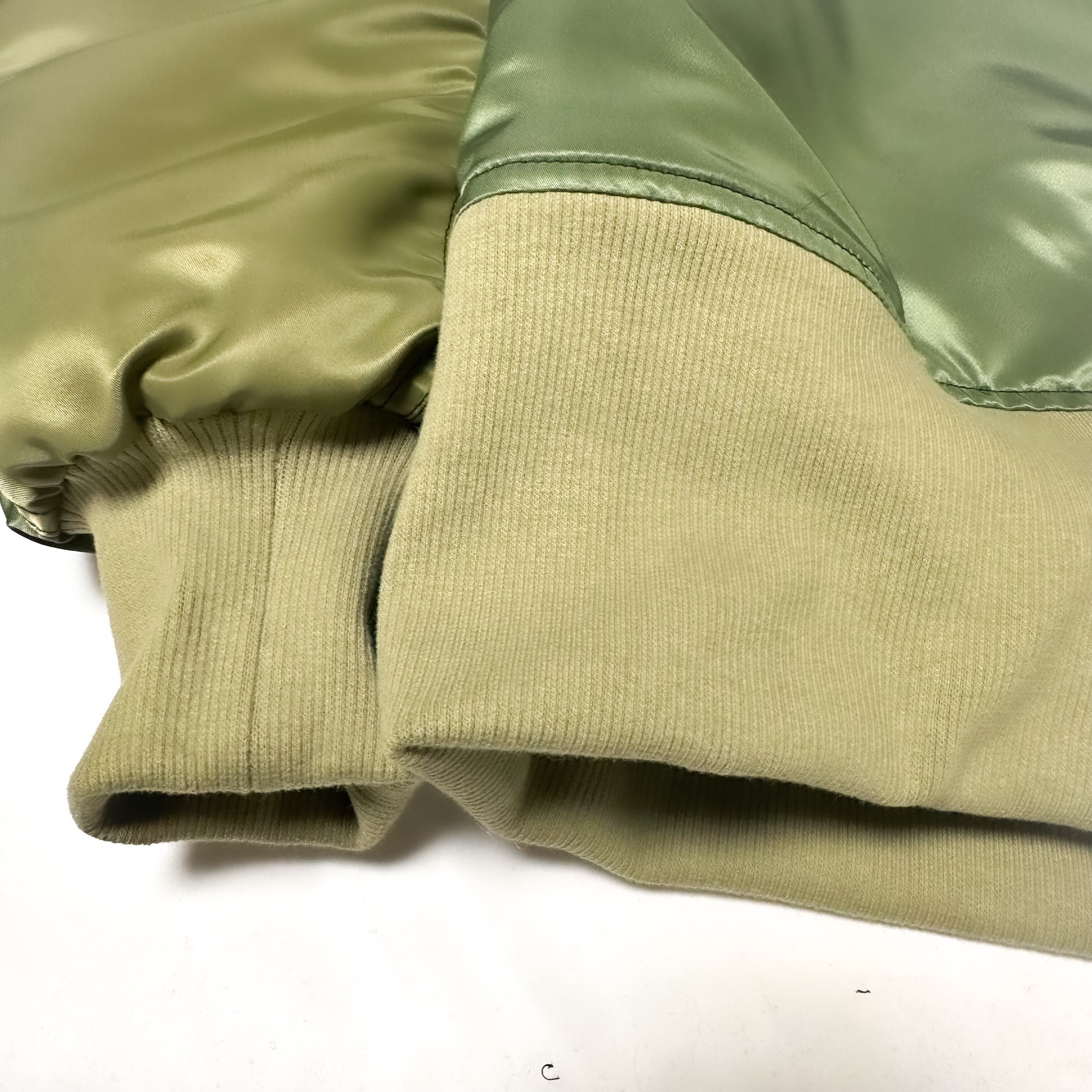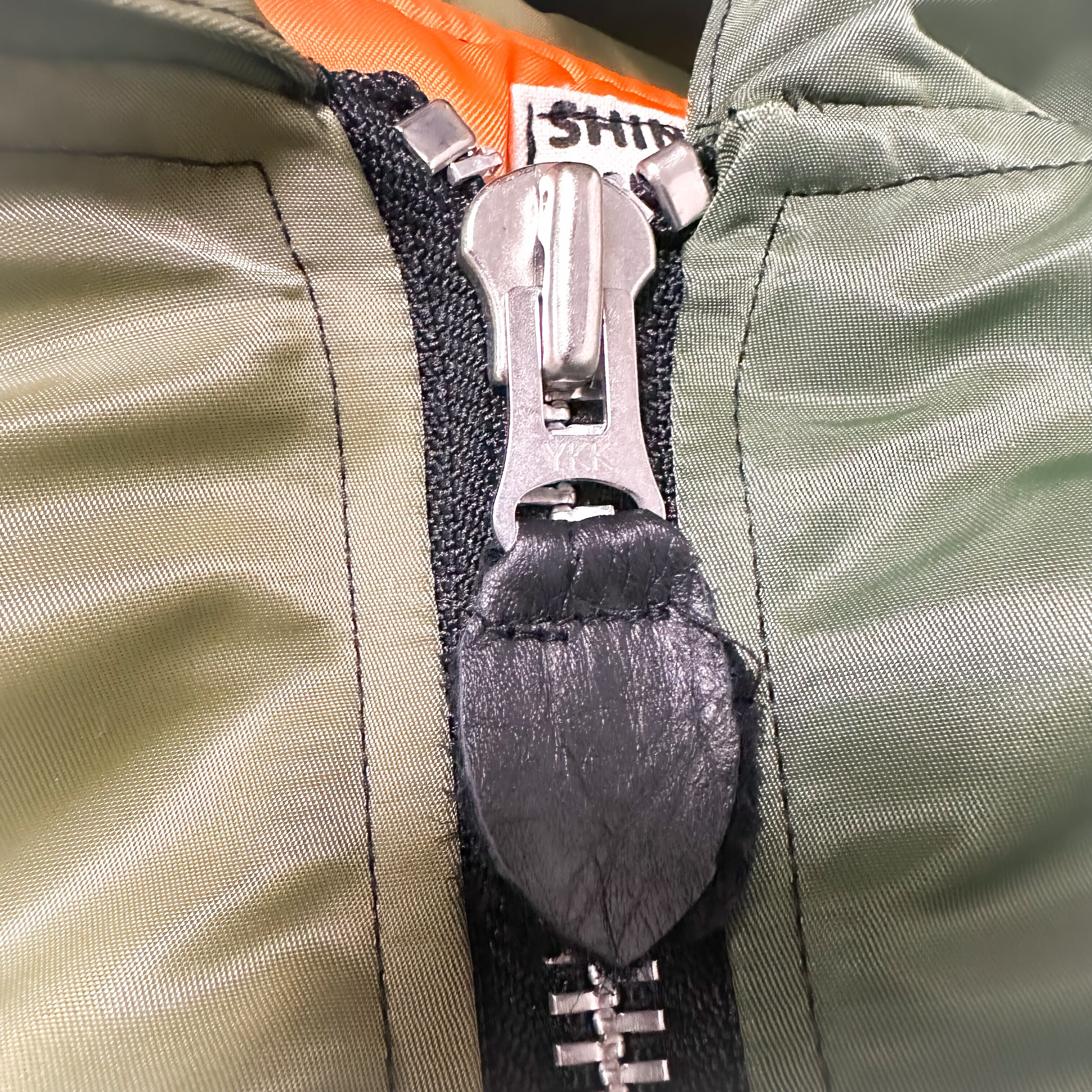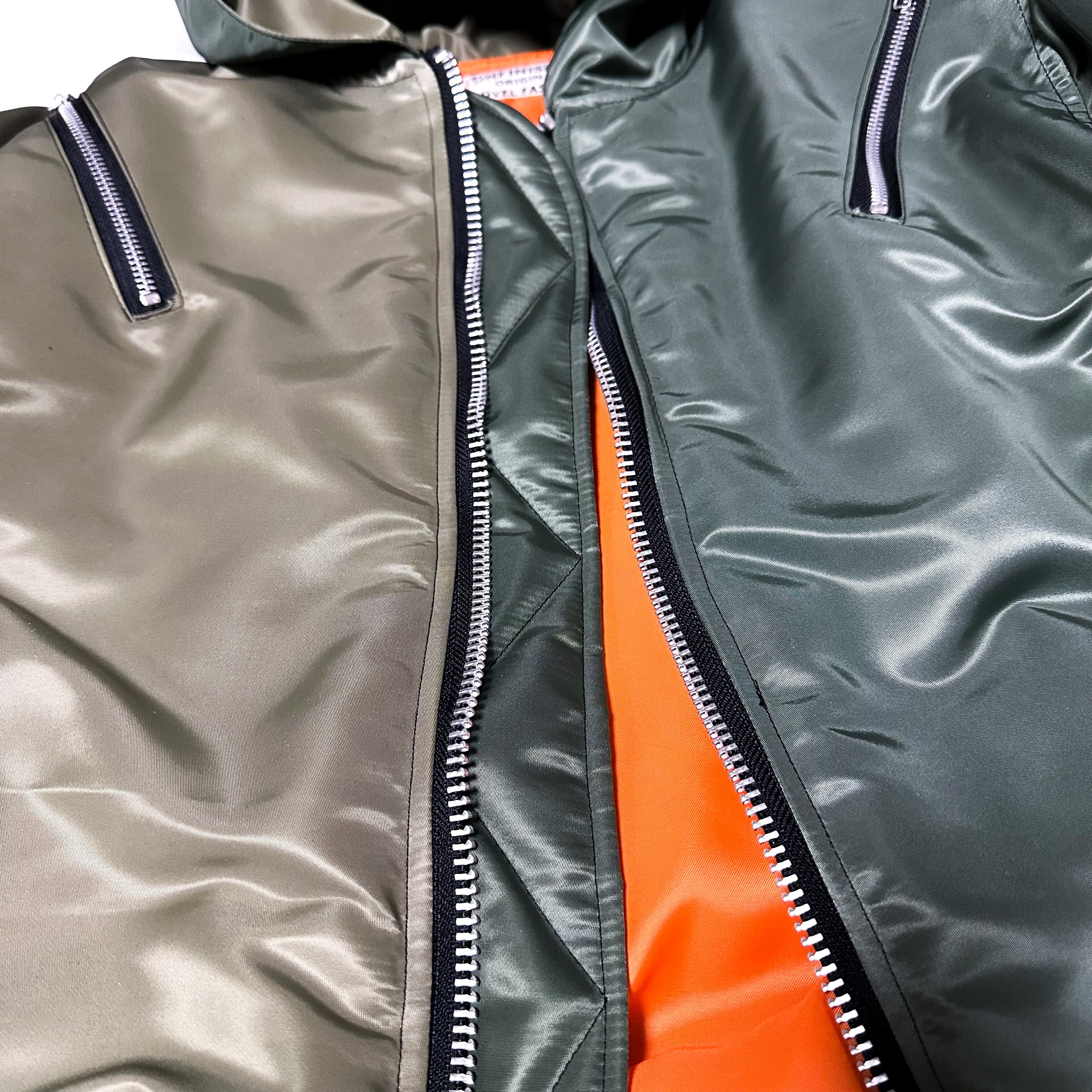 UNFINISHEDジップMA-1 24132 2色のMA-1生地をベースに多様なファスナーを使用したMA-1。 全てのファスナーを開閉可能で中にはキナリの生地を使用しています。 中綿入りで防寒性にも優れています。 丸いシルエットにこだわってパターンを工夫して製作しました。 【サイズ】 肩幅49㎝ 身幅60㎝ 着丈67㎝ 袖丈58㎝ 購入金額に関わらず送料無料。