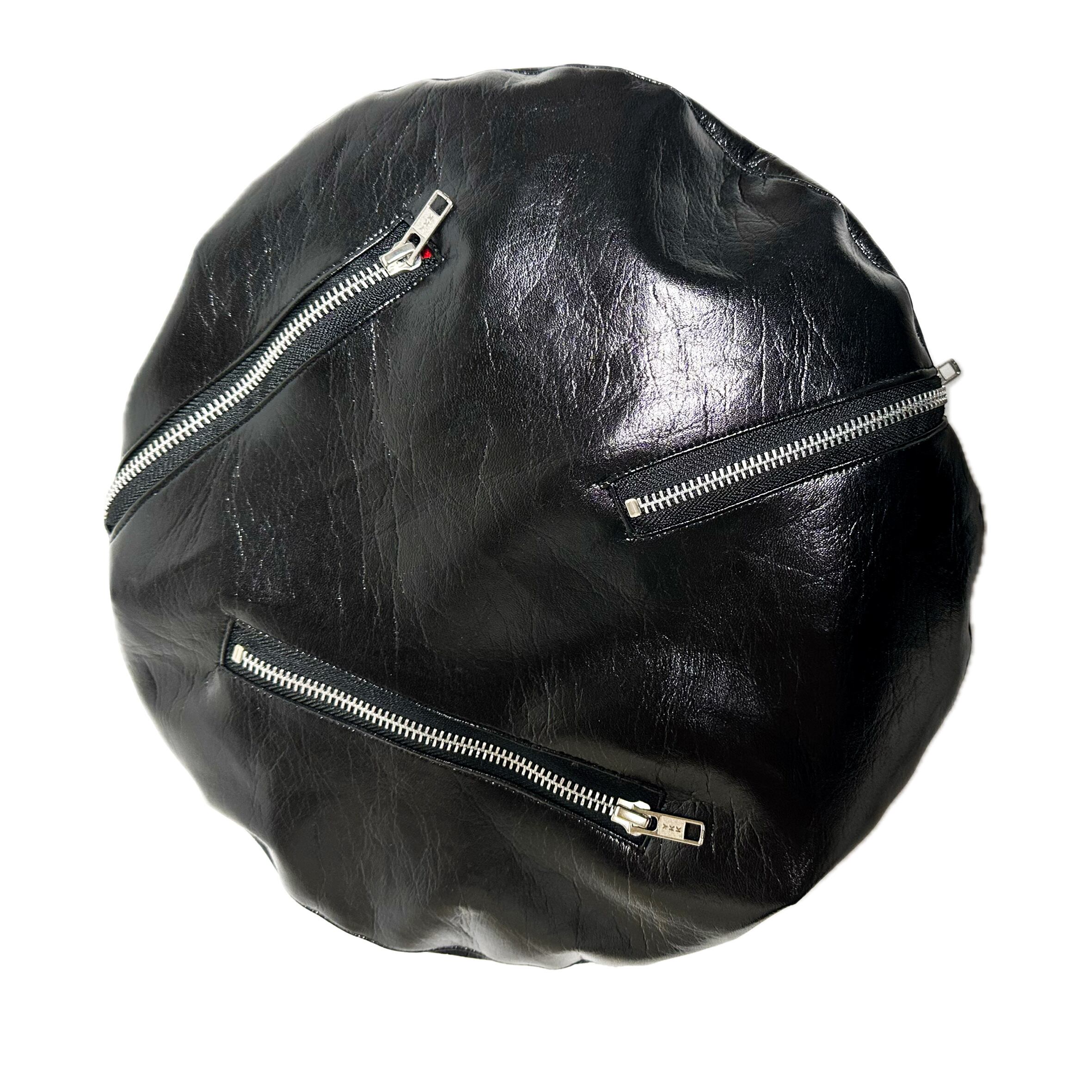 合成皮革製のジッパー付きベレー帽、ビッグシルエットデザインが特徴。