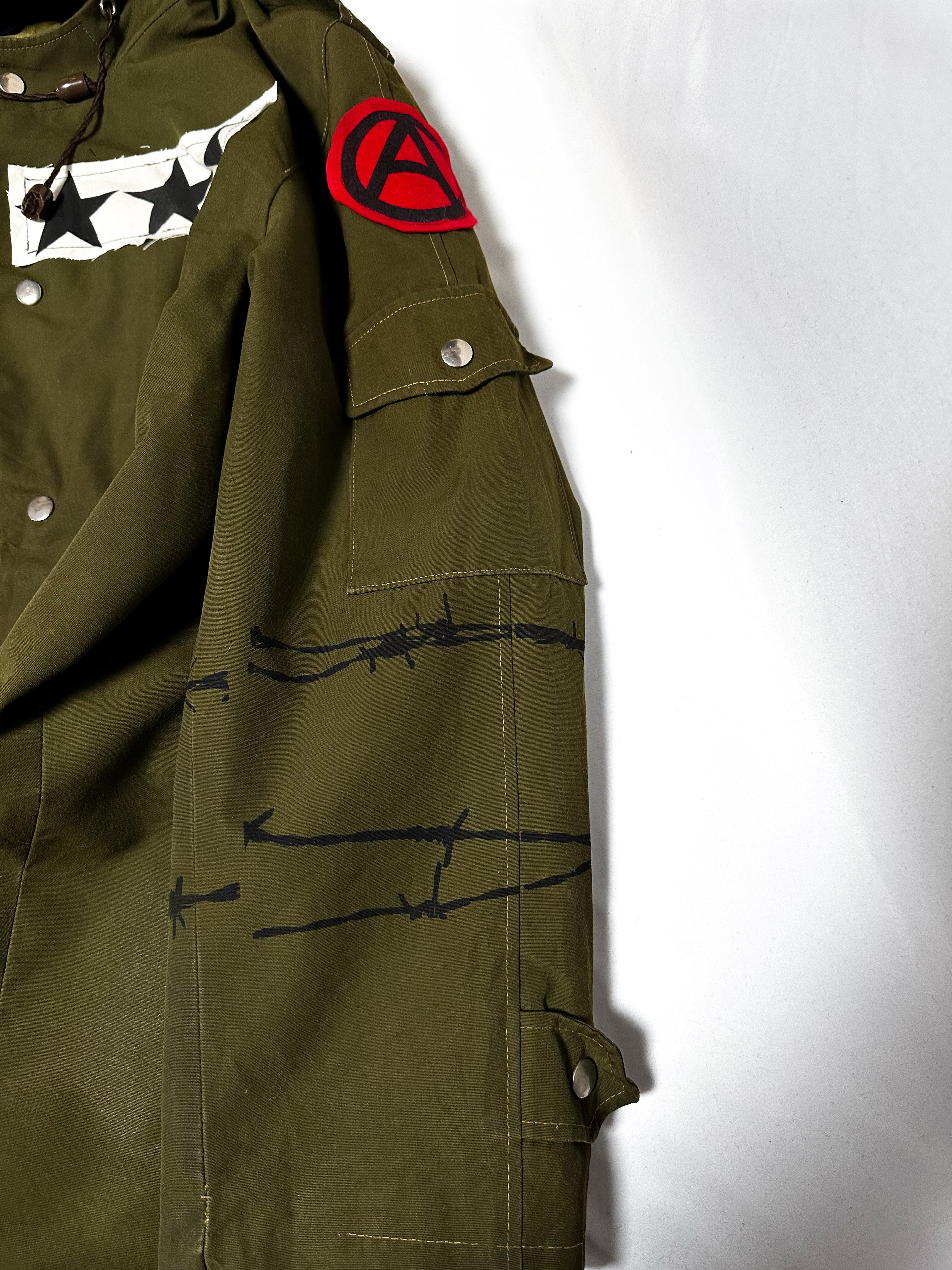 70年代ユーロビンテージミリタリーコートをベースにUNFINISHED独自のグラフィック、パッチを施した奇抜なコート。