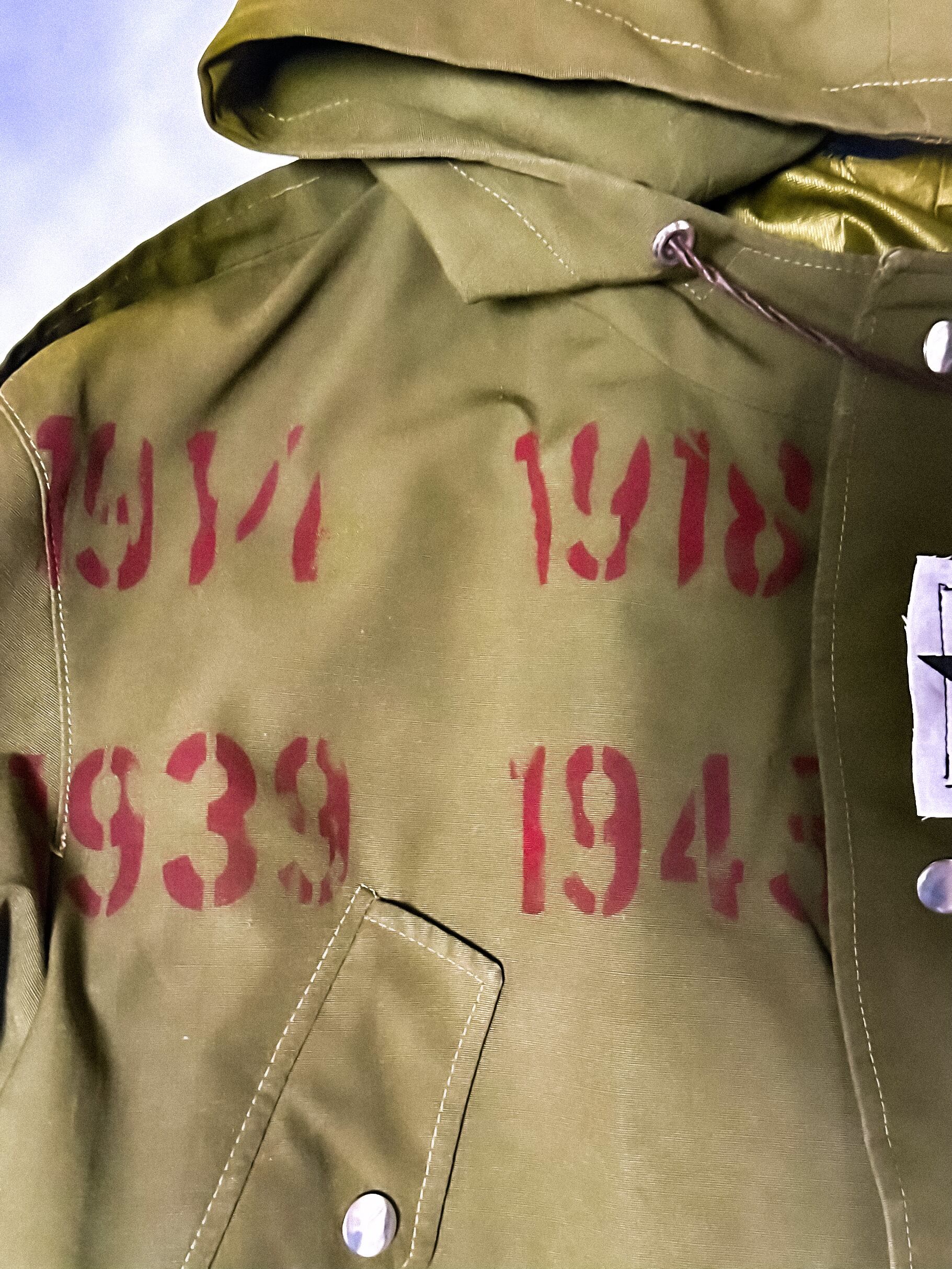 胸の赤プリントは開戦、終戦を表す年代のグラフィック。