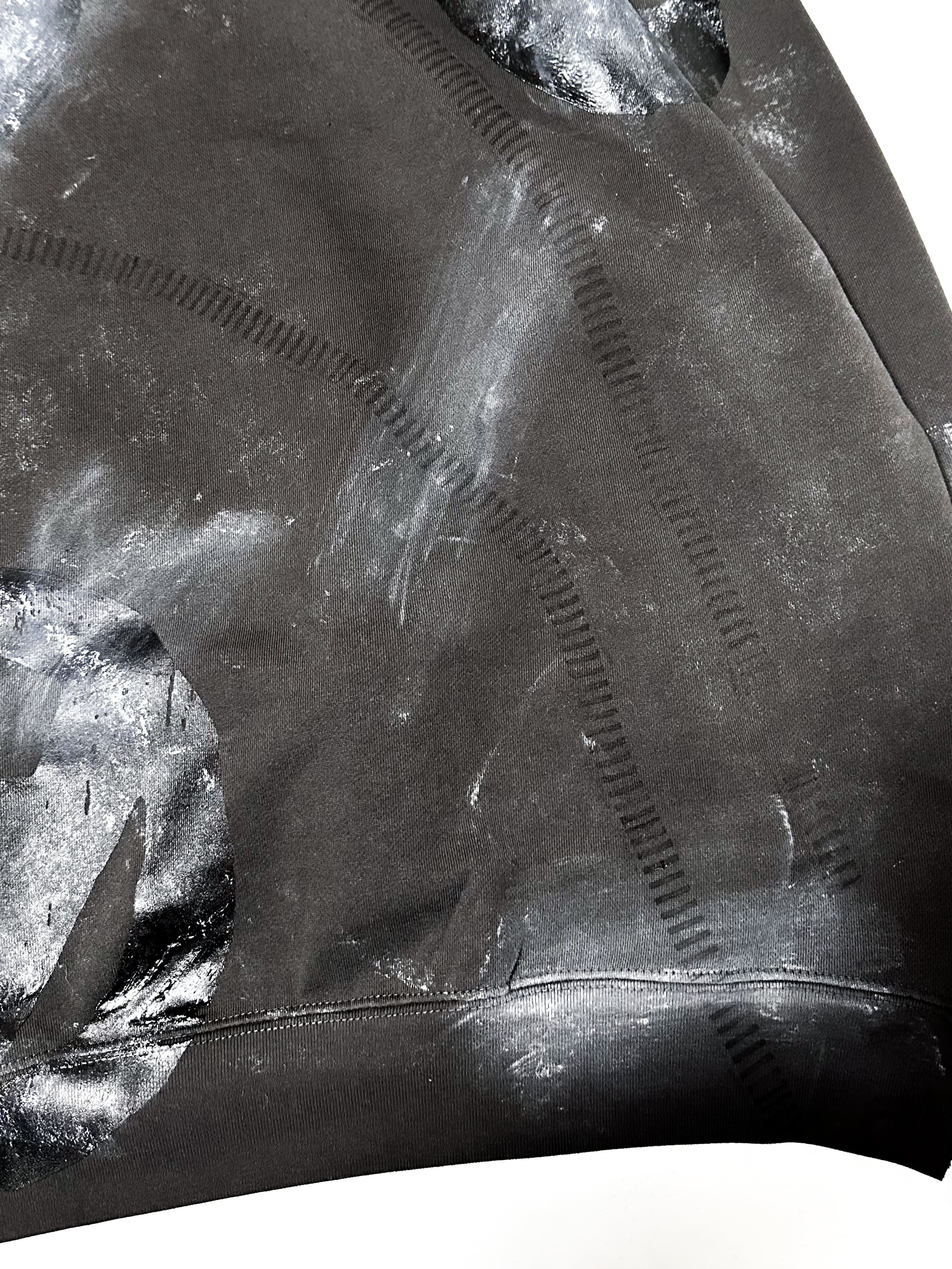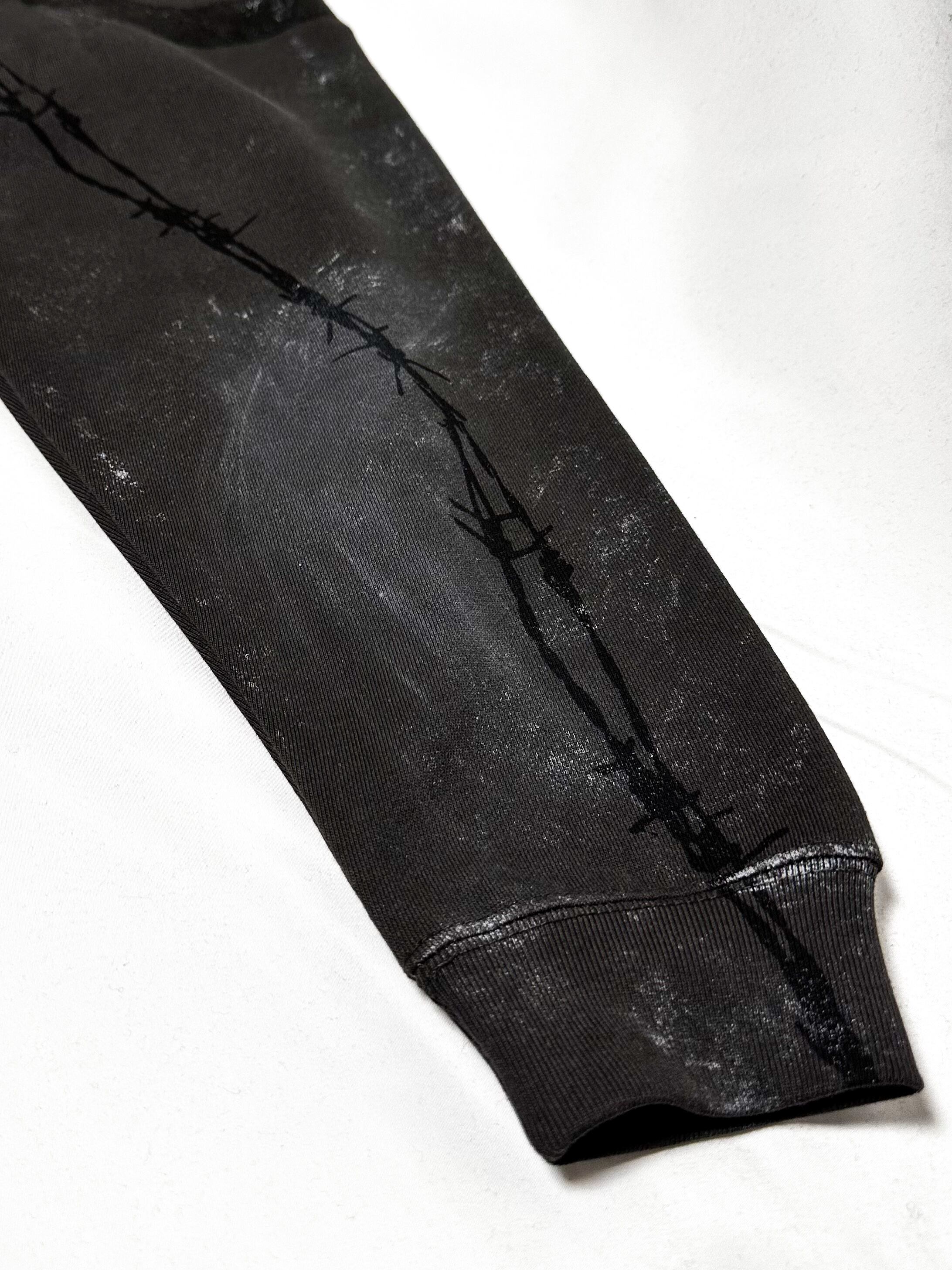 アナーキーマークをモチーフに有刺鉄線、タイヤ跡などをリアルにプリントしたダメージトレーナー。