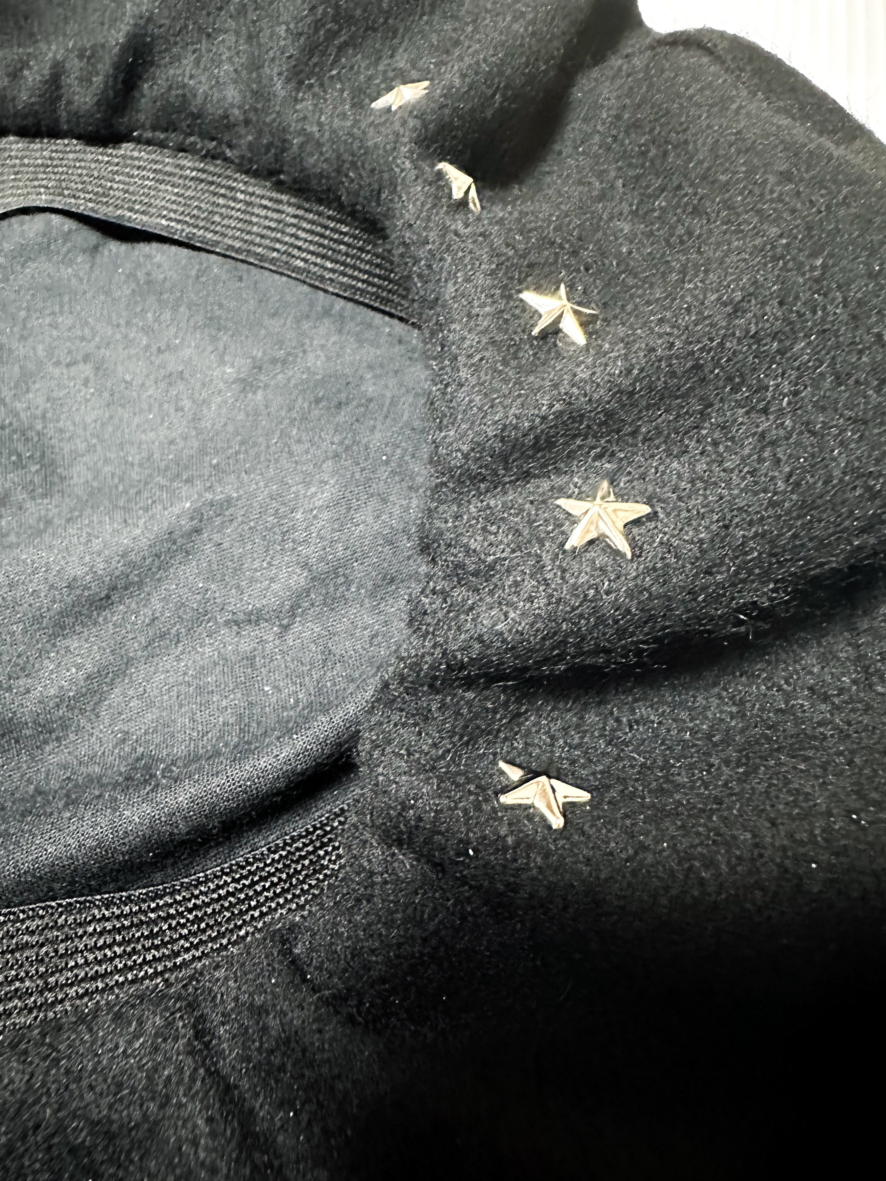 トップ部分にはアナーキーマークにダメージを与えたグラフィックを採用しサイド部分には星柄のスタッズを配置しました。